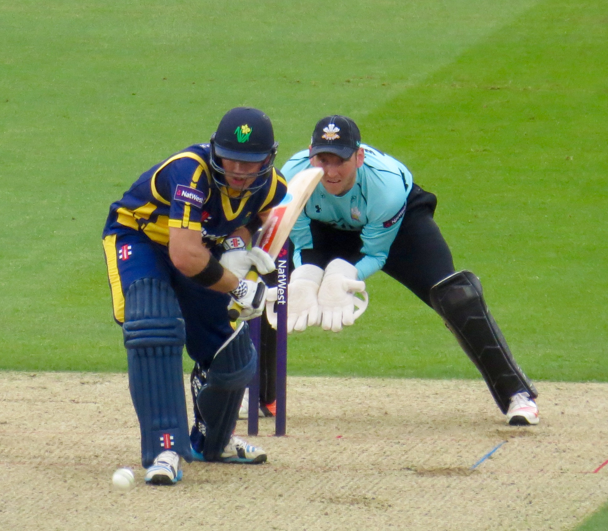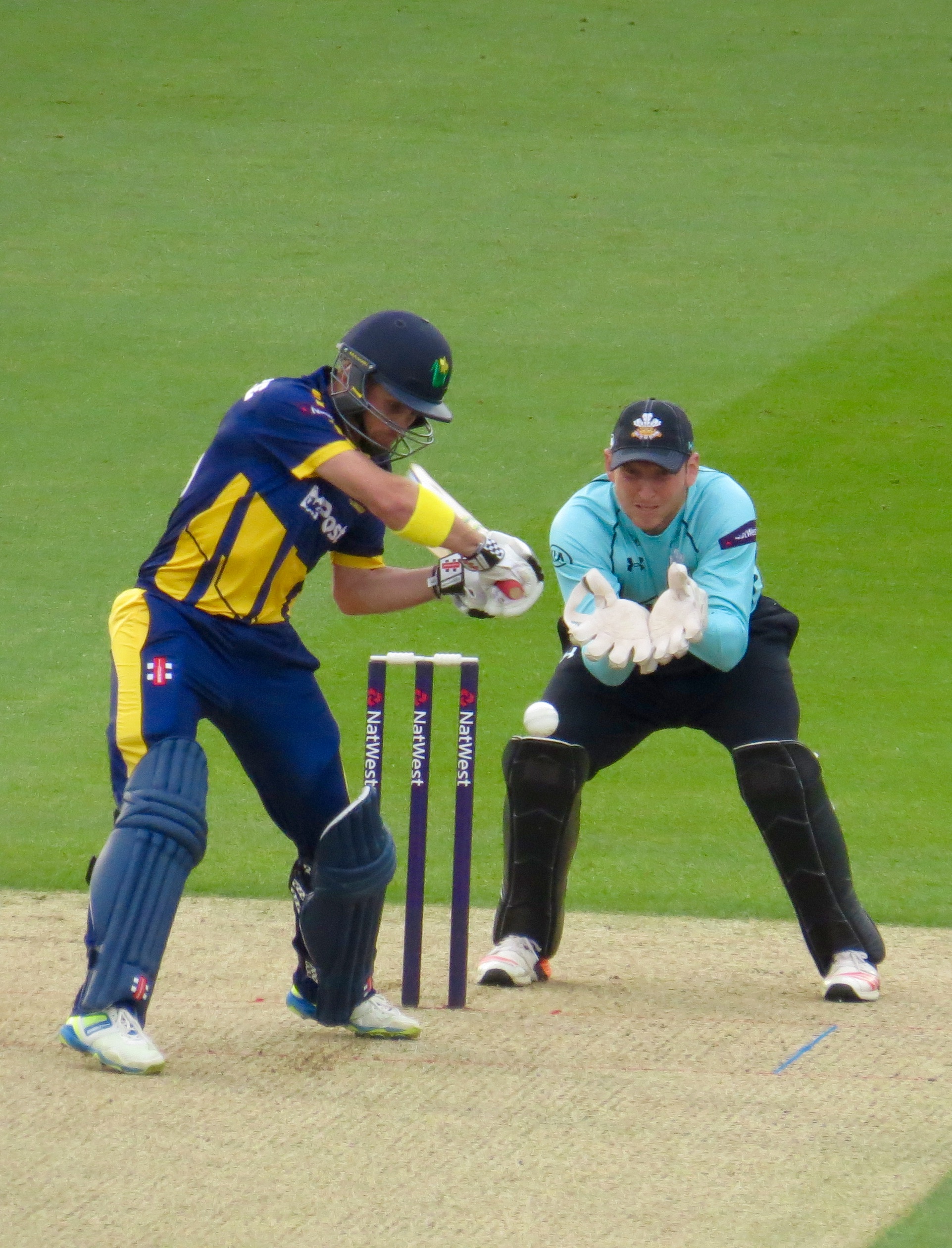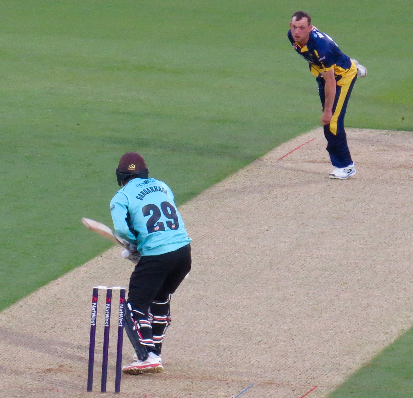 One big hitter was promptly walking back to the dressing room. Kumar Sangakkara was next to bat. He and Davies put on 54 before he was out to a similar scenario to Roy – Surrey seemed to be trying too hard. Sangakkara was caught for 37 by David Lloyd from the bowling of Craig Meschede. Gary Wilson replaced him.