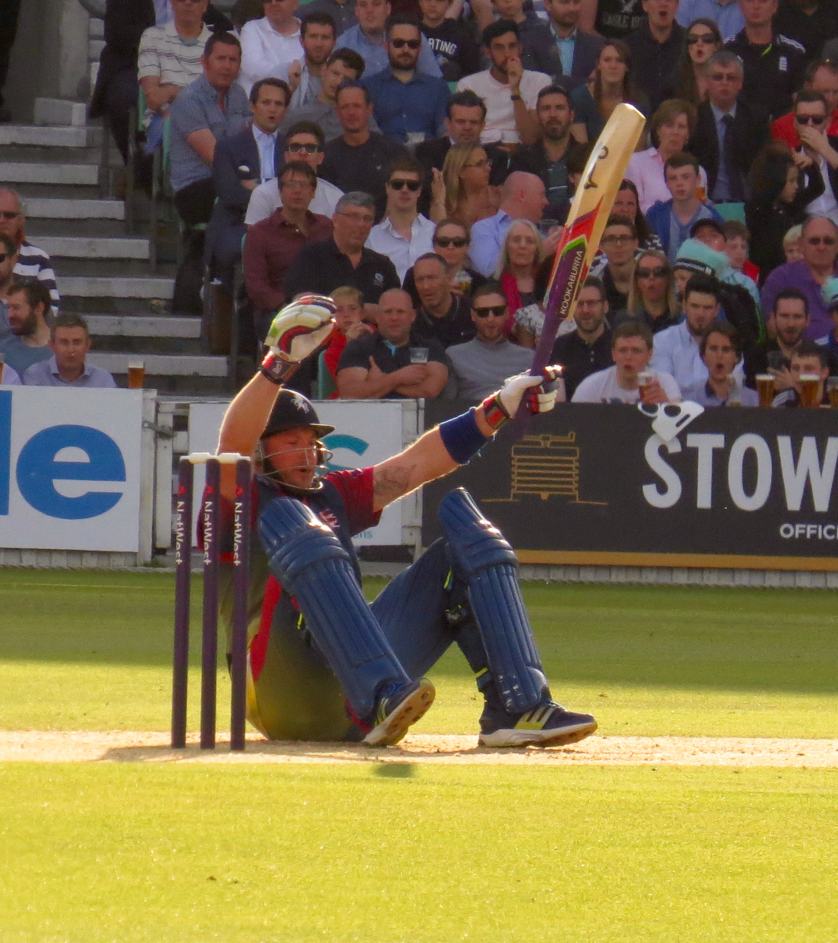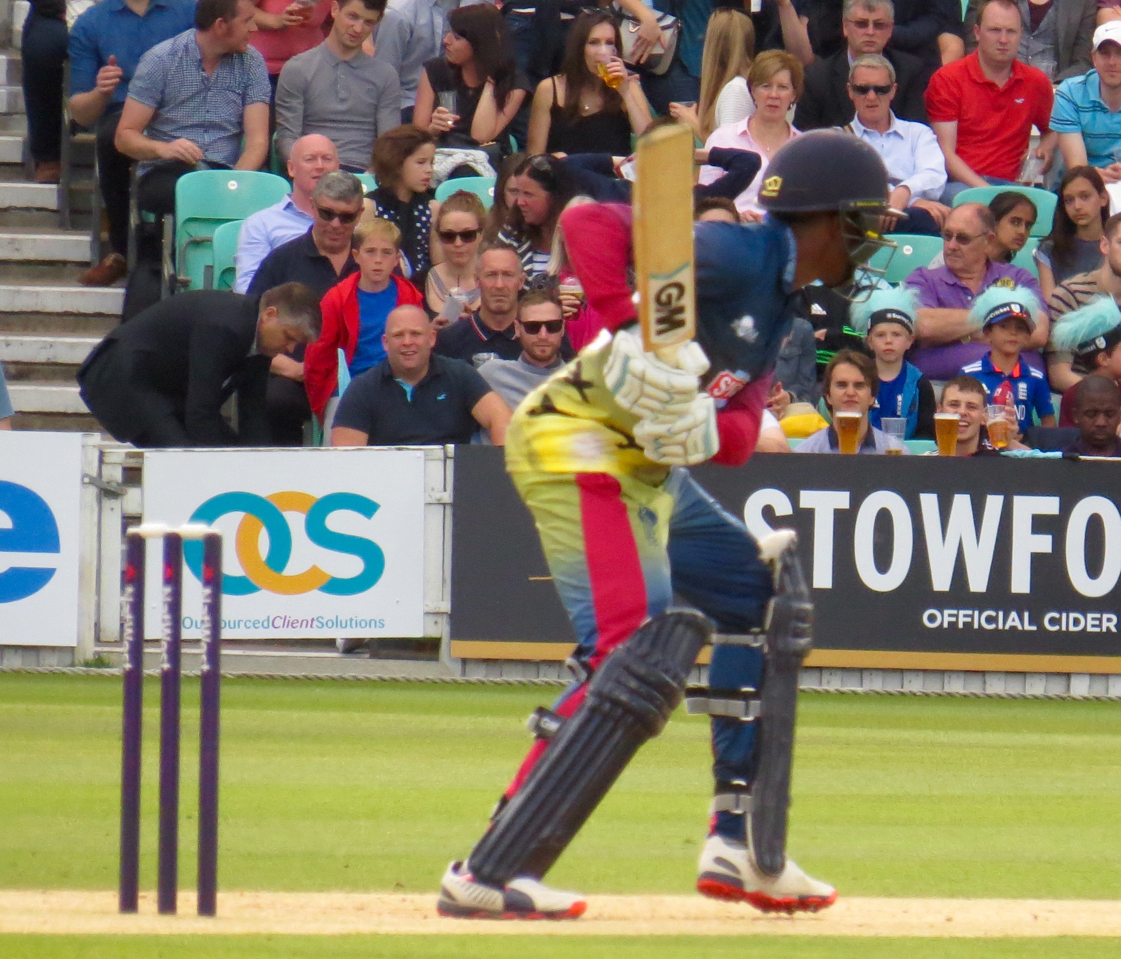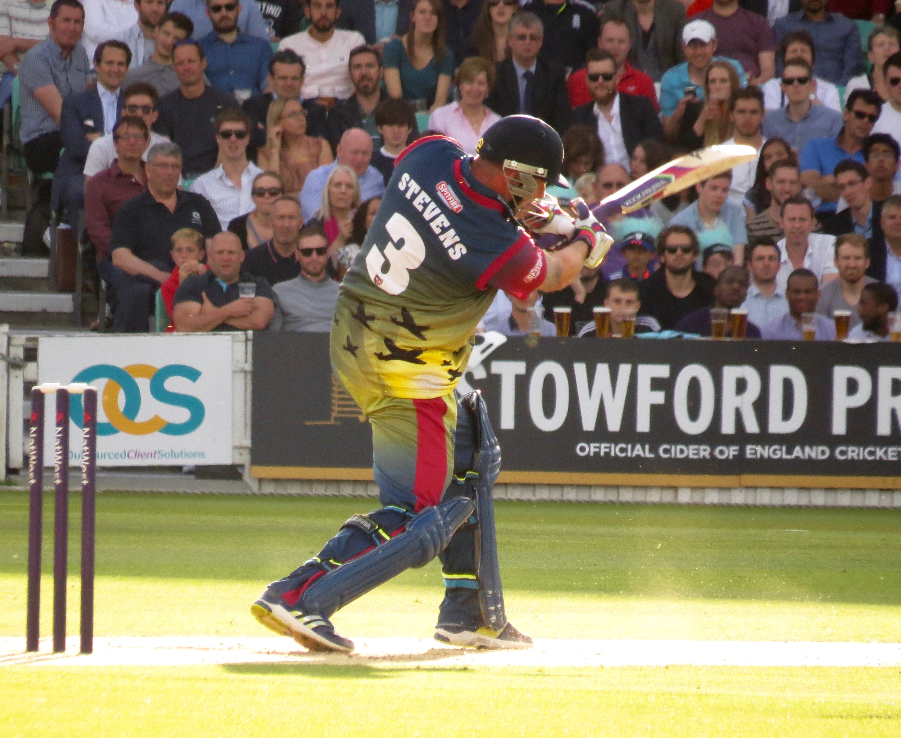 The scoreboard was ticking along fairly steadily, Stevens had been joined by Alex Blake. I’ve eluded to Stevens’ innings – he scored 90 runs from 39 balls! Hitting ten 4’s and five 6’s – he totally deserved to leave the field with a century to his name but was caught by Ben Foakes from the bowling of Tim Linley.