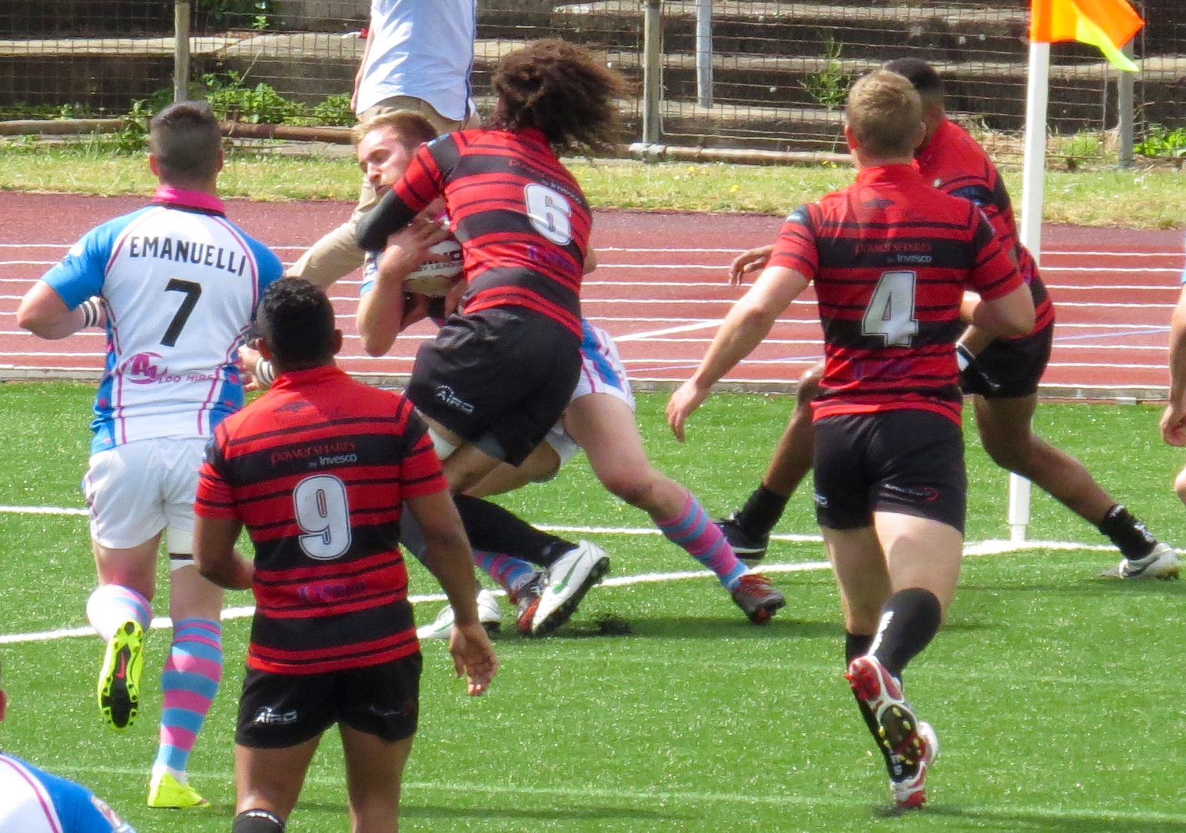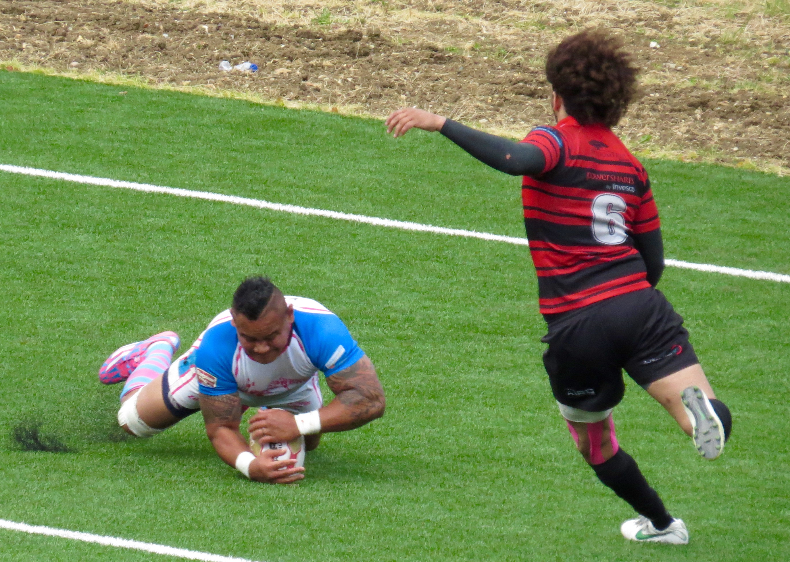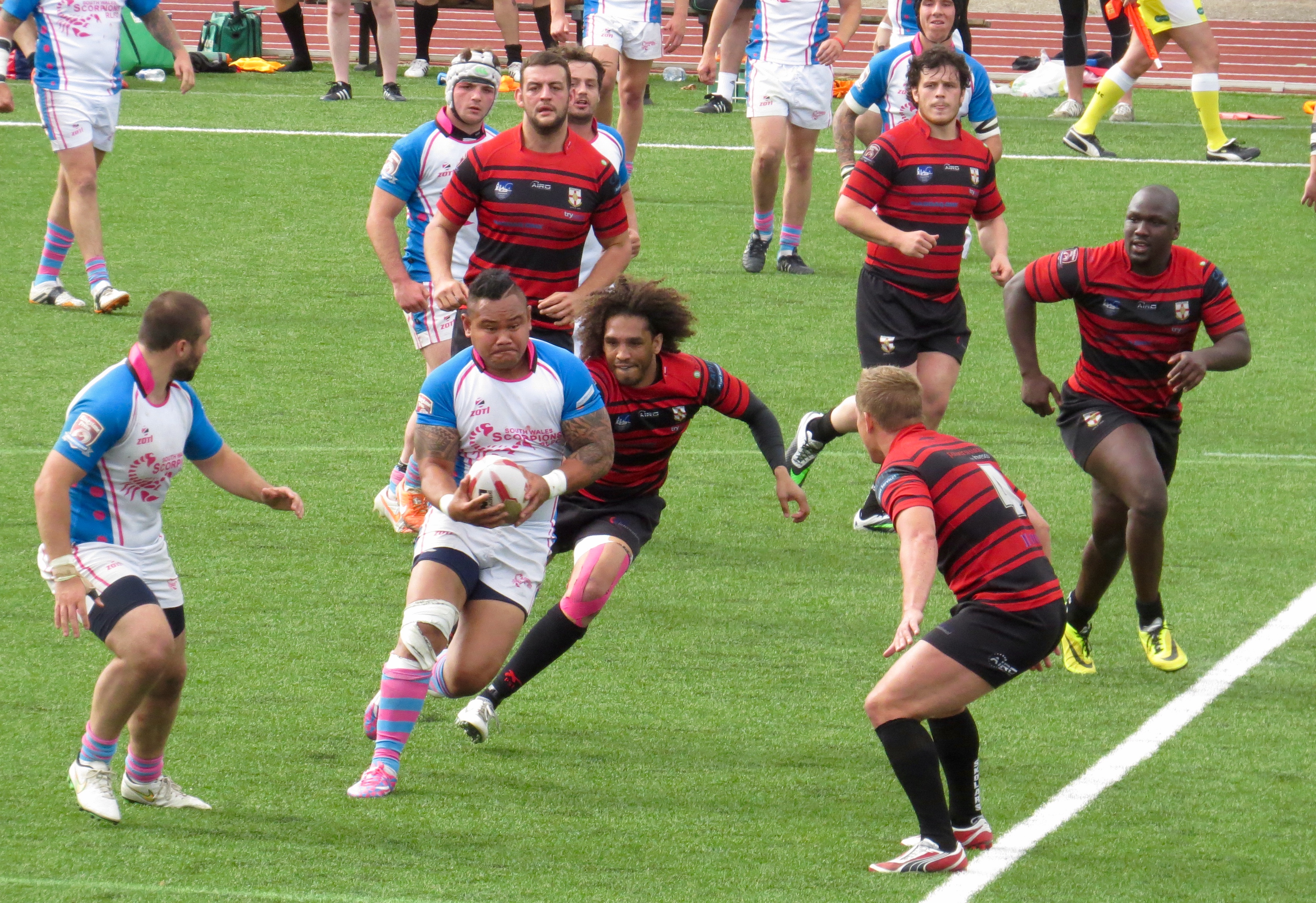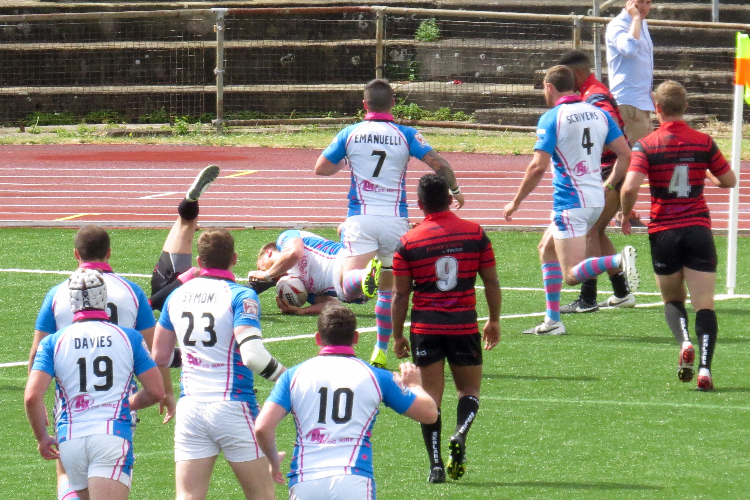 South Wales weren’t too far behind, a clever kick to the corner by Paul Emanuelli was leapt on by Yannic Parker in spite of the attentions of player/manager Jermaine Coleman.  The conversion was a tough one and missed.