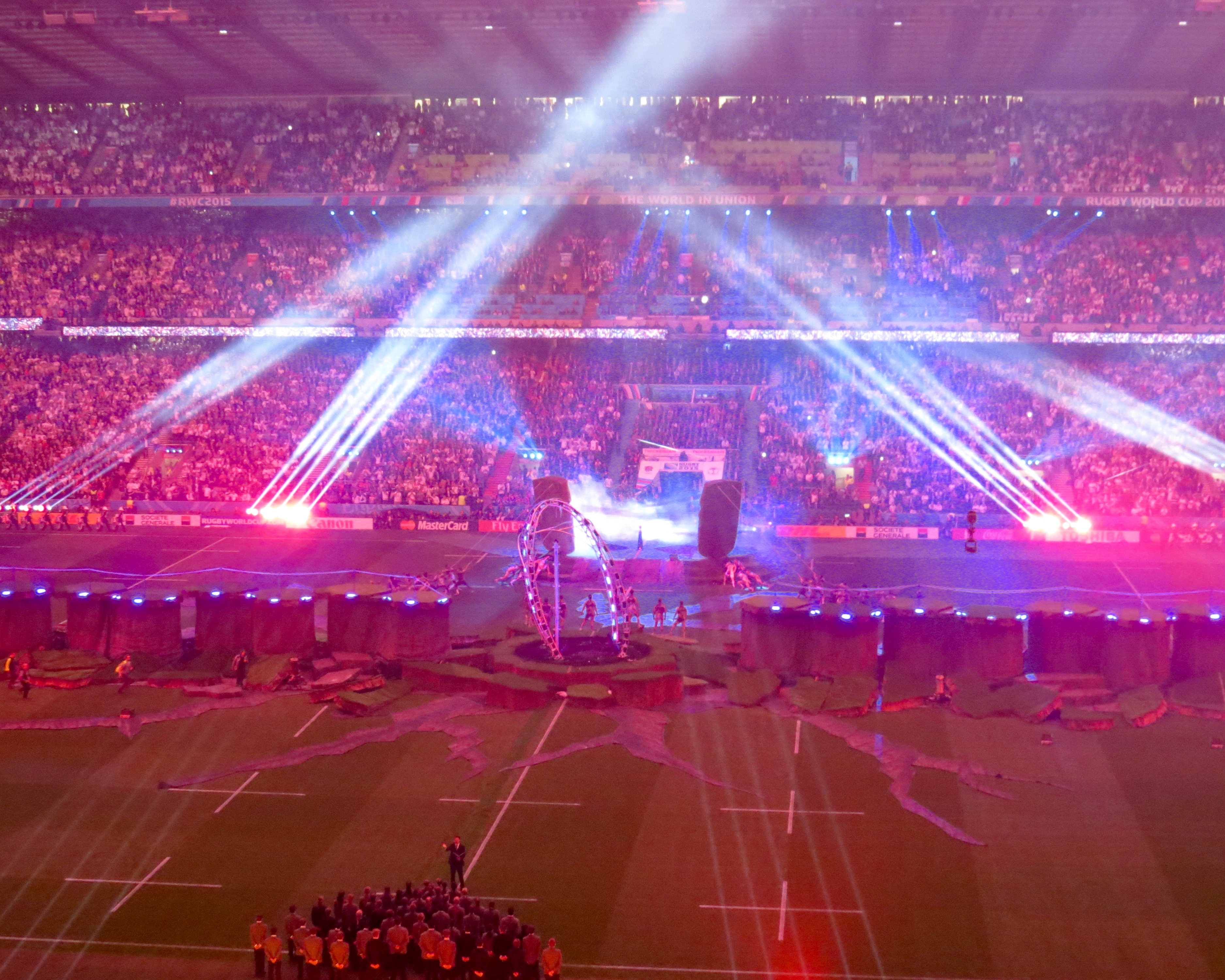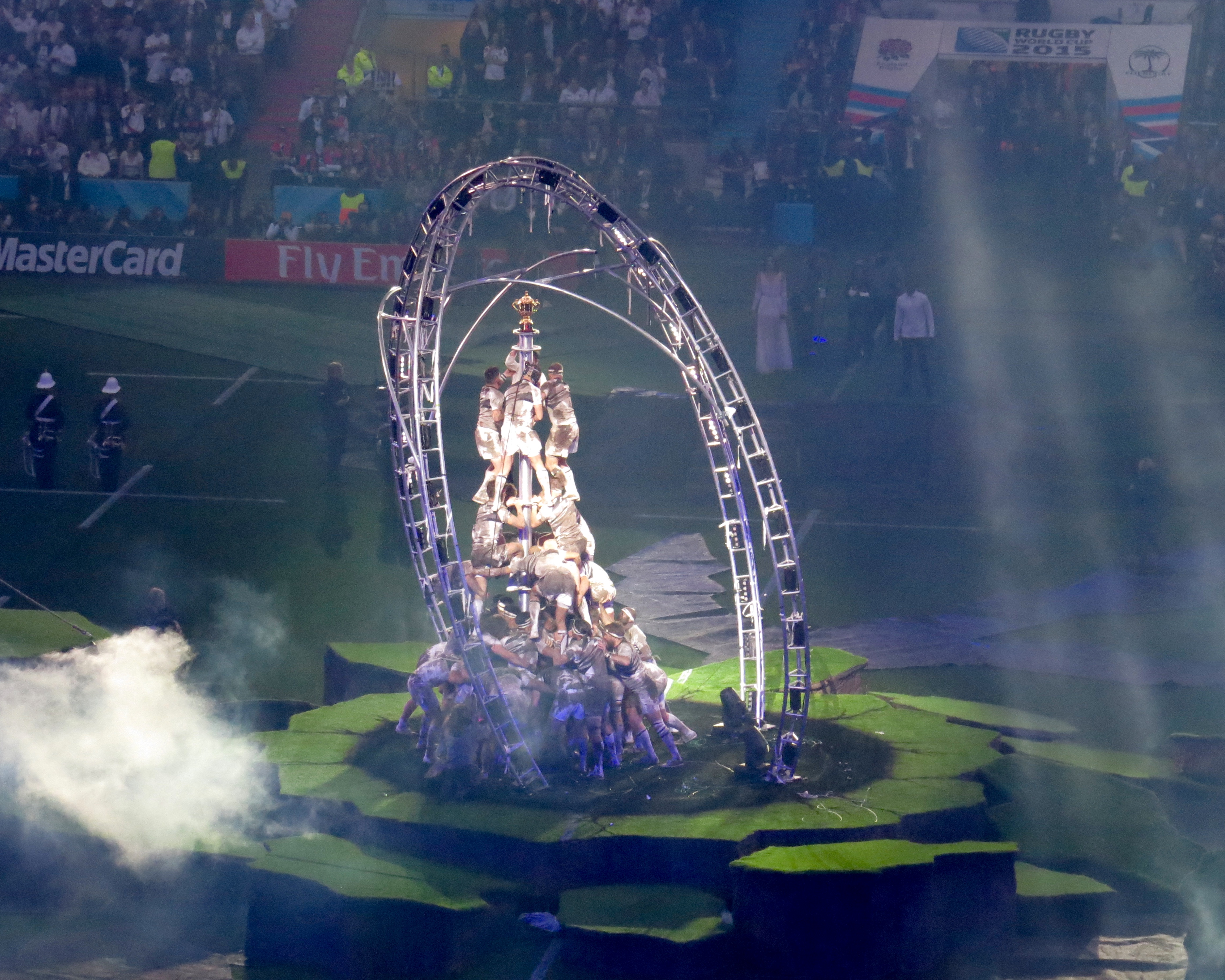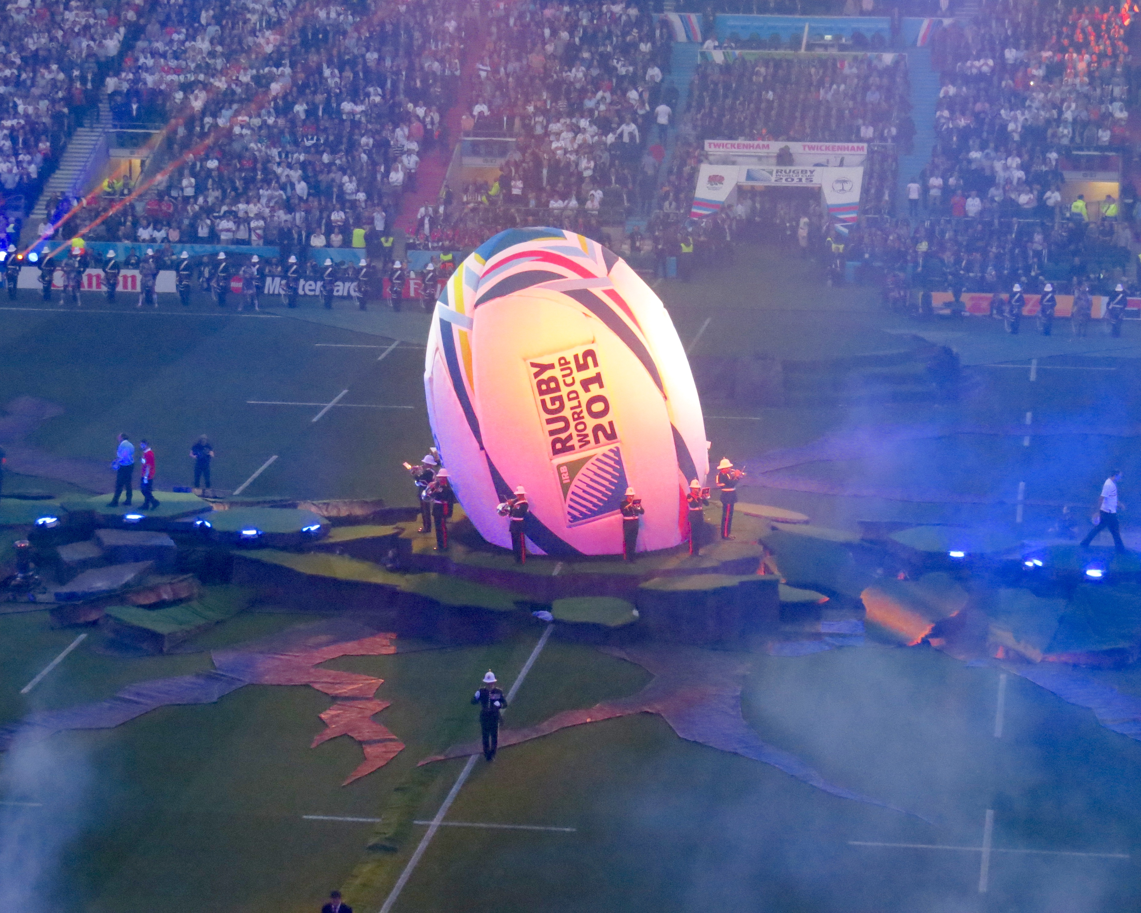The pitch looked spectacular with a stage type structure with a ‘wrapped’ rugby ball in the centre, what would unfold? We started with the Royal Marines Band in numbers, always an impressive sight. We were shown a video telling the story of rugby from it’s birth to the current day. A very clever film including a cameo appearance by Prince Harry and the rugby god that is Jonny Wilkinson. It very cleverly saw the ball being run through each of the venues for this World Cup.