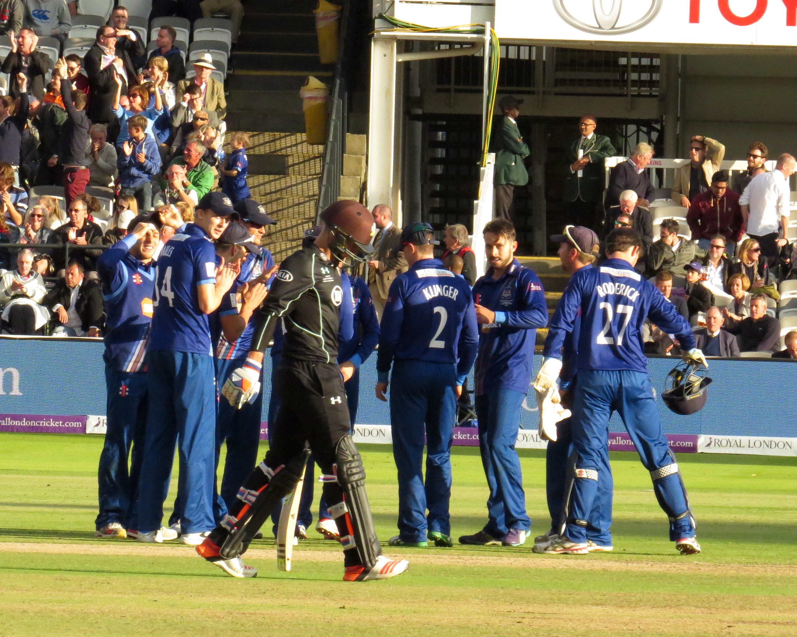 The tail enders added nothing as Jade Dernbach took his 5th and 6th wicket and a hat trick to boot! Although I have to say the final LBW as a tad dubious! That left Surrey with 221 to get to win the trophy. That didn’t feel like to high a mountain to climb and it also felt that I’d be in plenty of time to get to Twickenham.