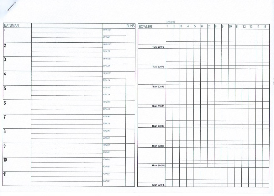 With scoring digitally you need to have a manual back-up and every good scorer will keep one. It becomes even more vital to keep a back-up when you are scoring on your own. What chaos would be caused if your laptop decided to pack up or the scoring programme corrupted!I therefore designed my own basic back-up sheets on A4 as shown below.