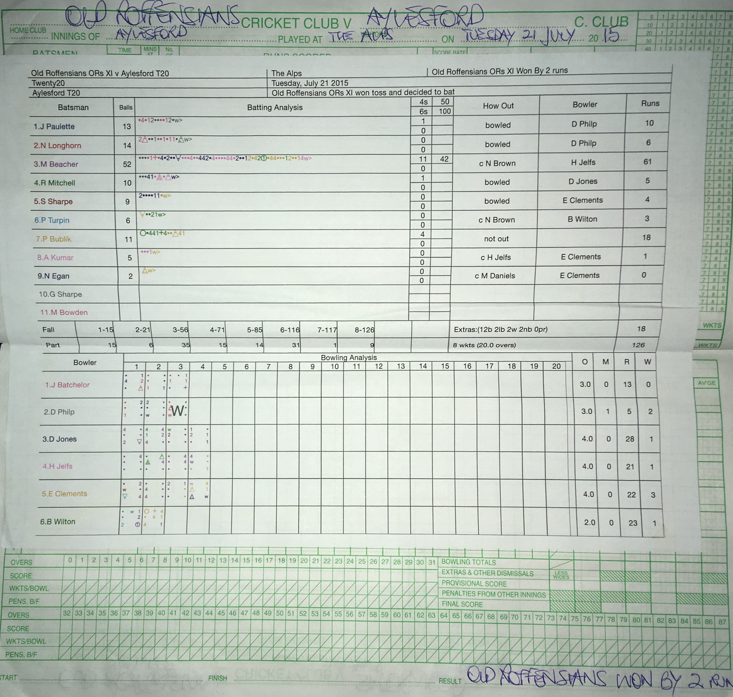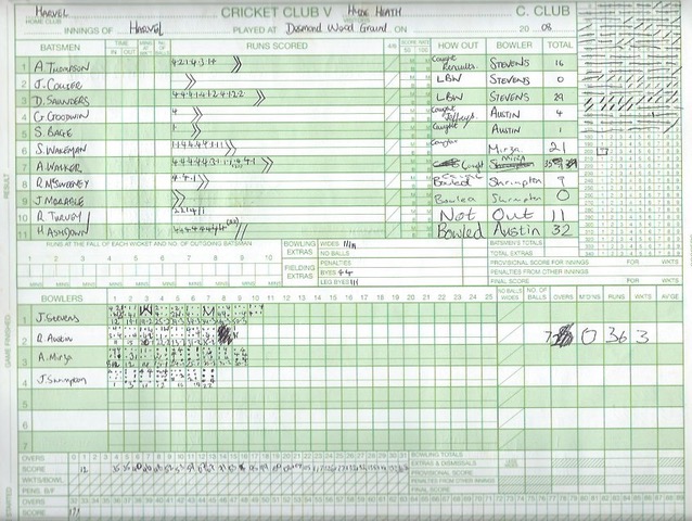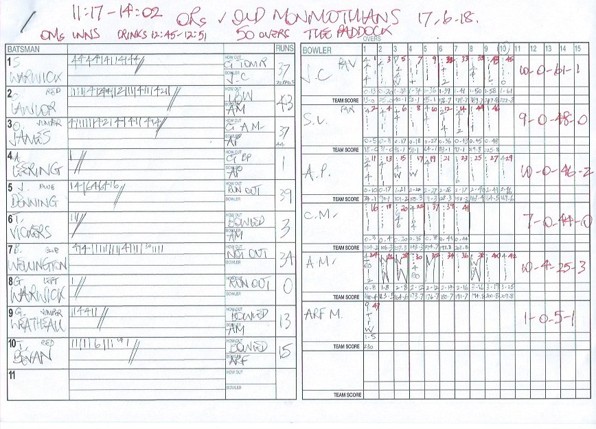 On this you write in red the over number of the match on the bowlers side and you can trace how the game flowed, as below. If there’s ever a digital problem you can happily and accurately carry on scoring the game and not let down 22 players.