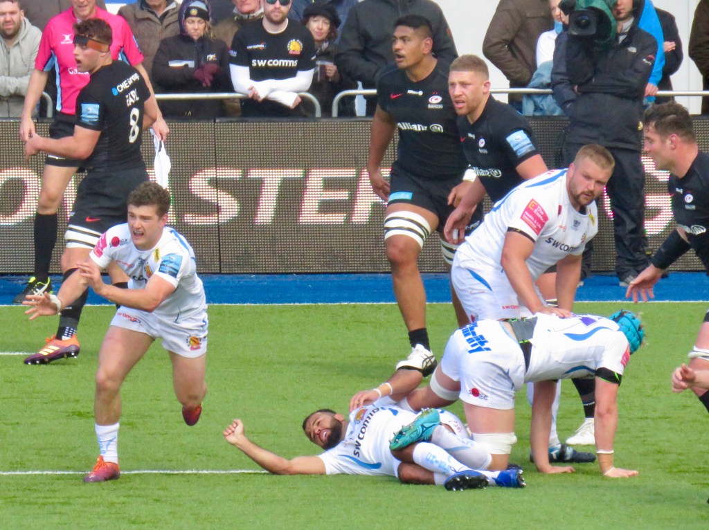 The Saracens defence was resolute as Chiefs attacked for wave after wave. The only score of the half was for Alex Lewington who benefited from a ball ripped from Luke Cown-Dickie by Vincent Koch. Hacked forward by Richard Wigglesworth the ball fell well for Lewington. The score was 7 nil at half time.