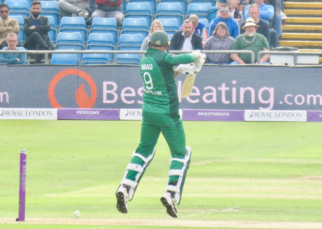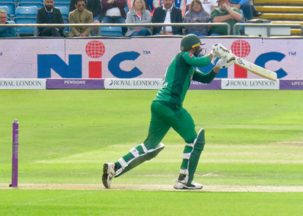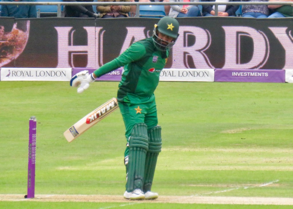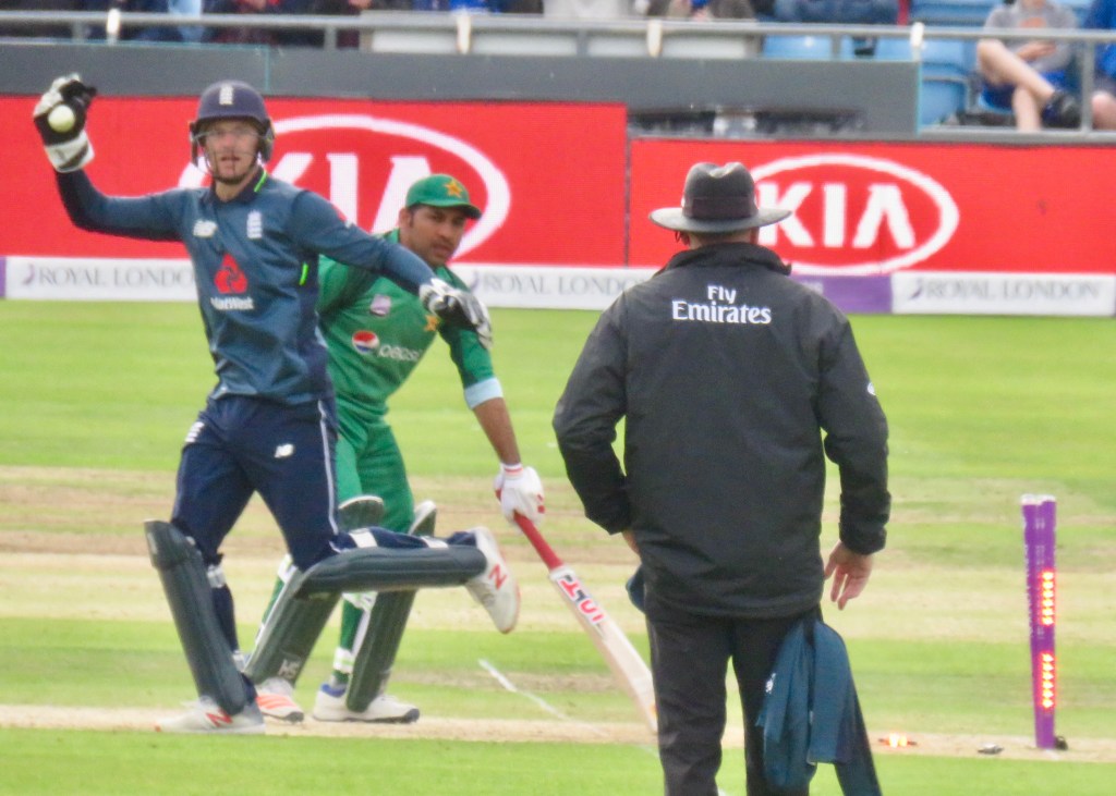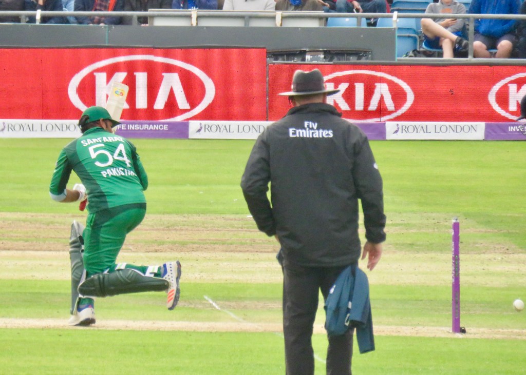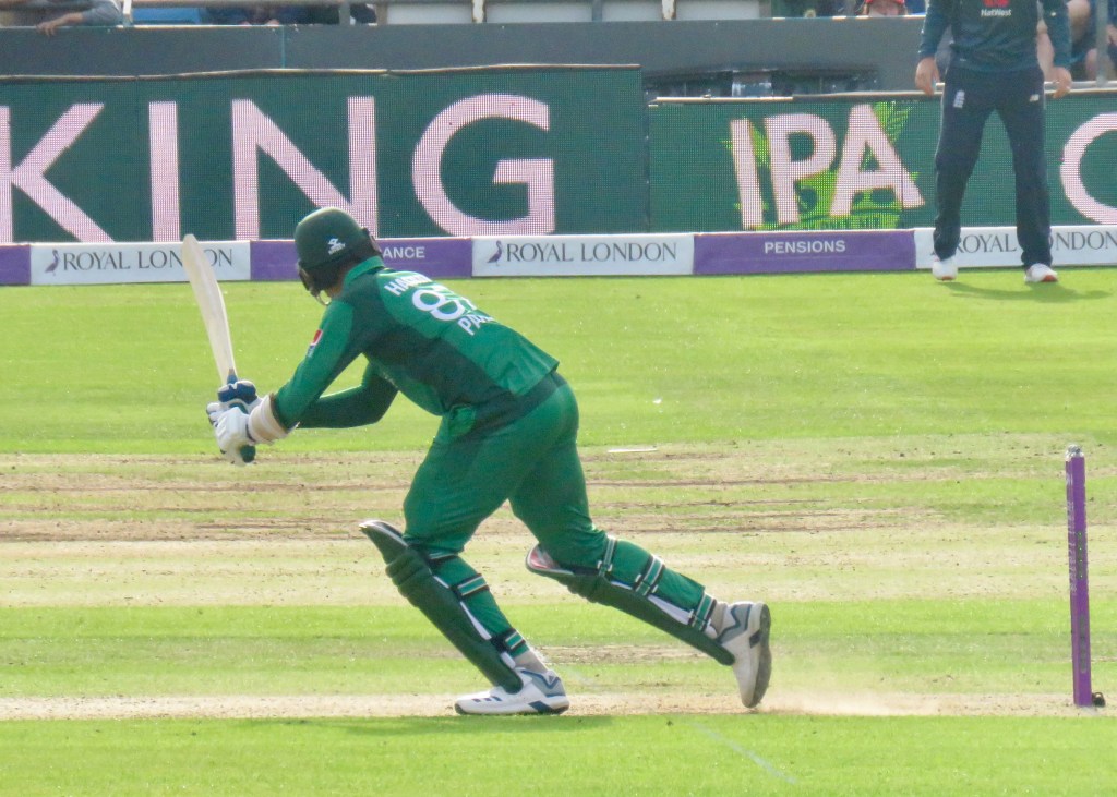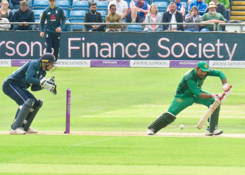Sarfraz had been batting wonderfully, it was noticeable how far he batted outside of his crease from my viewpoint. He was just 3 away from his century when he misjudged a ball, thinking he’d hit it away he went to take a run, but the ball hit Jos Buttler’s boot and he ran him out. He was out for 97 from 80 balls. Pakistan were 193 for 6 after 31.5 overs.