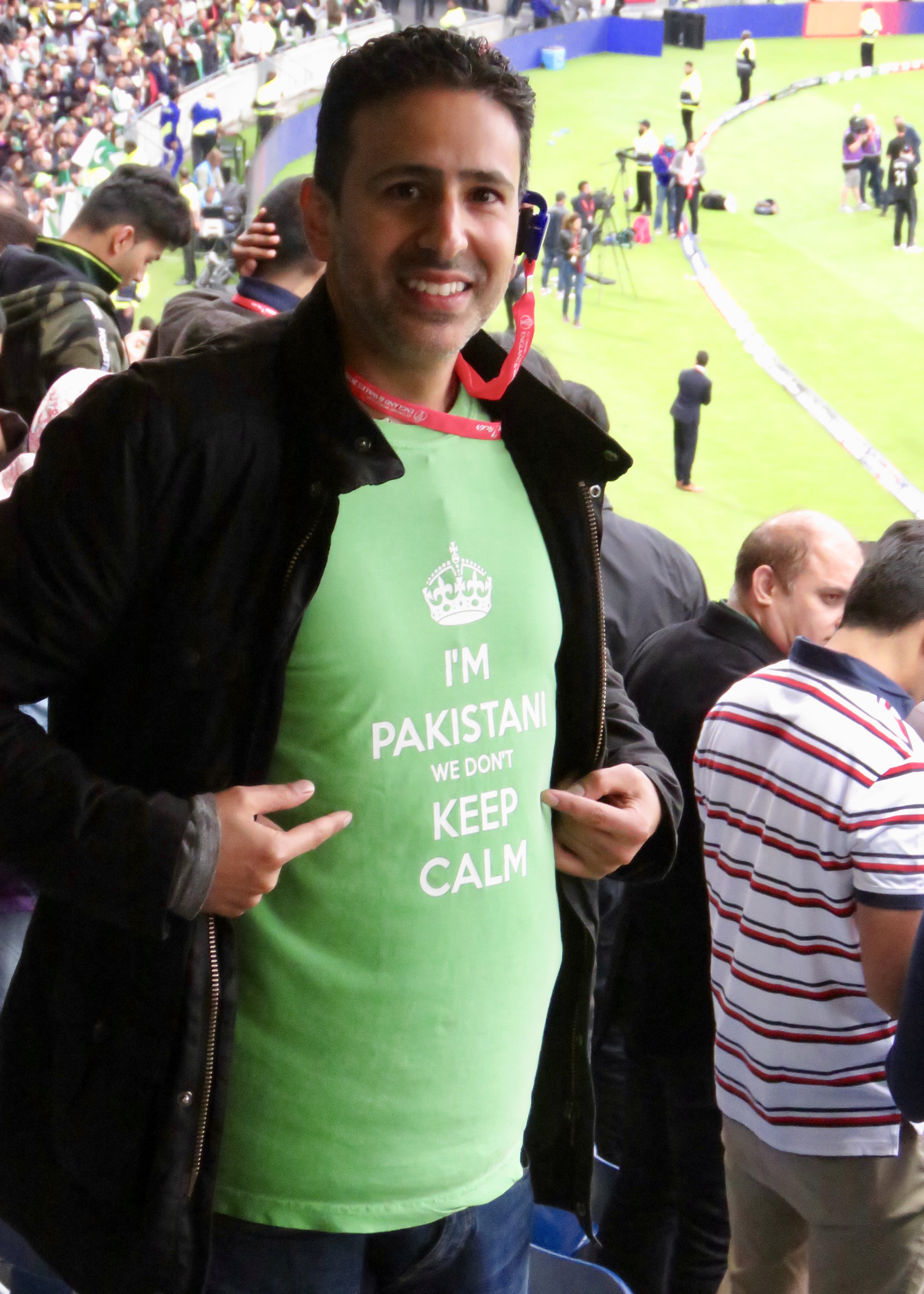 Pakistan were 128 for 3 after 30 overs, they needed just under a run a ball, calm was needed. I was sat next to Zia, who was great company, his T Shirt was very apt! Their 150 came up in the 36th over.