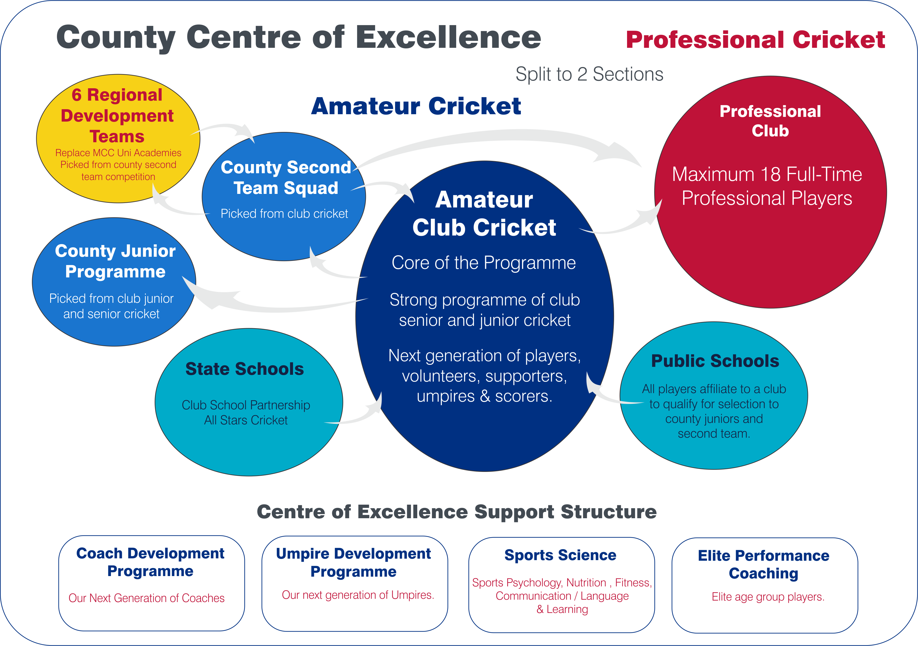 I’d have an umbrella organisation that runs cricket in each county (ie County Centre of Excellence). This is split to 2 divisions, 1. Pro Cricket and 2. Amateur Cricket.