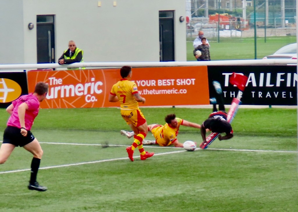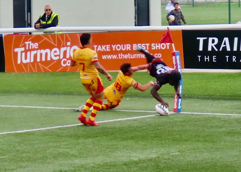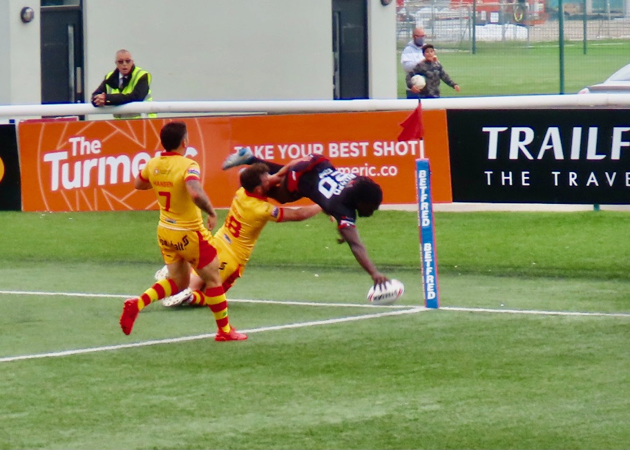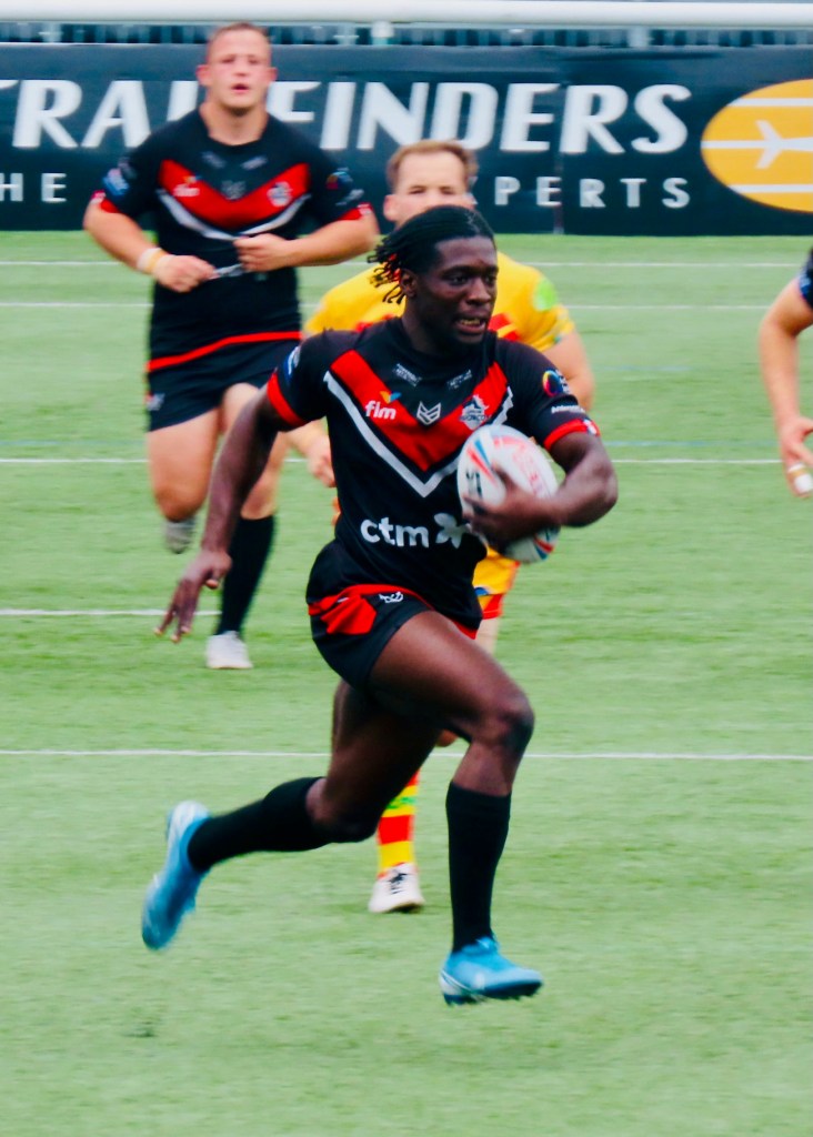 I was unfamiliar with several of the Broncos players, bit I and everyone else in the ground had a name etched into their minds as 22 year old speedster Gideo Boafo showed his heels, narrowly missing out on a try, however he wasn’t to be denied at the second attempt, he scored one of those spectacular flying through the air rugby league tries!