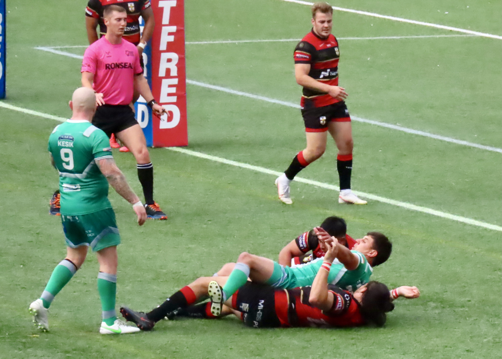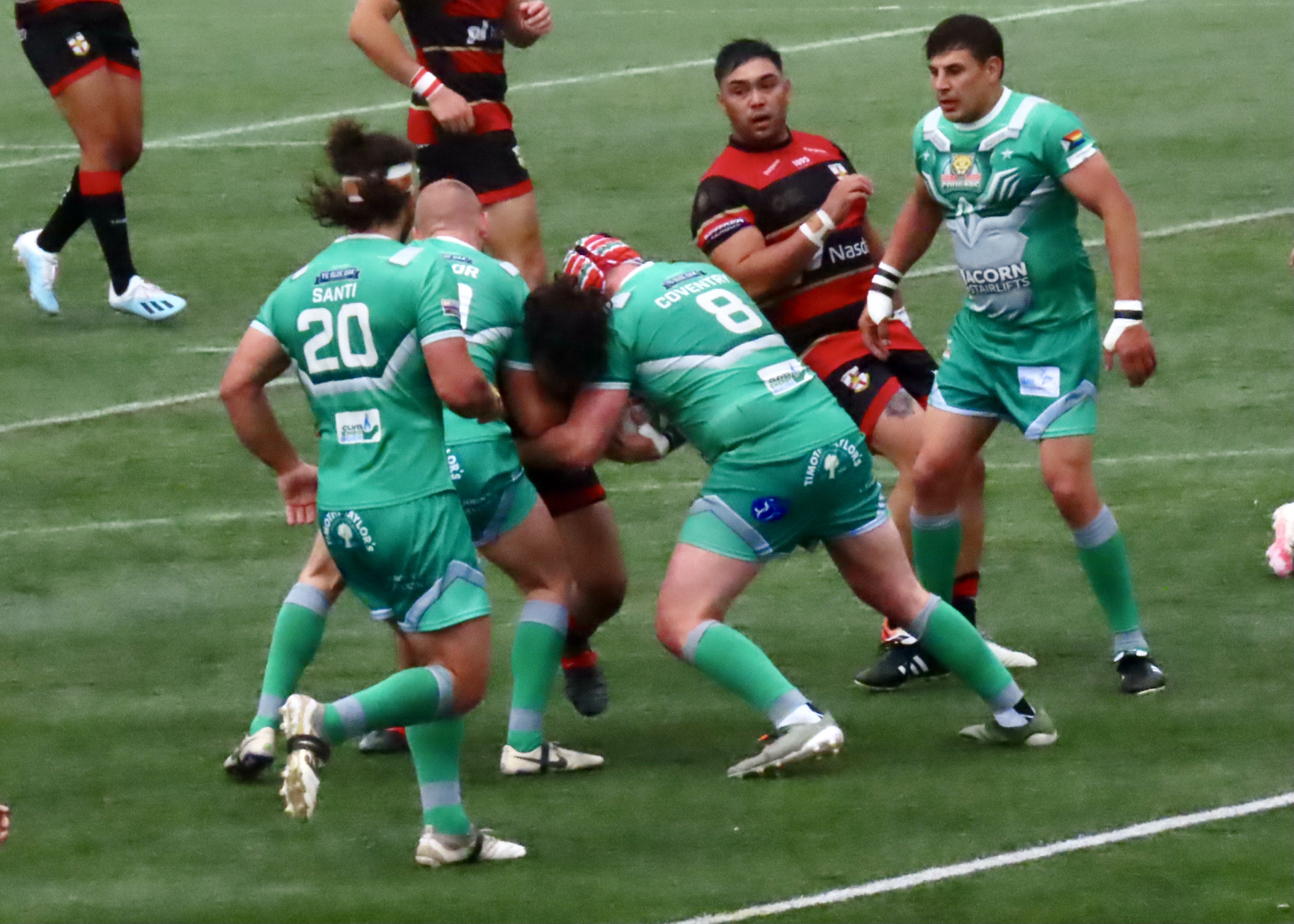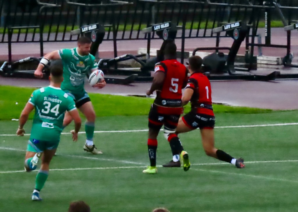 Kyle Kesik who was to make himself known for good reasons later was heard chivvying his team on, the swearing wasn;t the best to hear but it ultimately proved to be effective. We seemed to be in some sort of drop zone as Skolars fumbled the ball on more than one occasion, and Cougars did the same after a great run by Robert Matamosi, all that effort coming to nothing with the fumble. However the Cougars were in attack again after a Skolars mistake close to their own line. The attempted try was held up, I did have to chuckle to myself when the travelling fans felt they could see better than the officials, they’re a loud and enthusiastic bunch the Cougars fans!