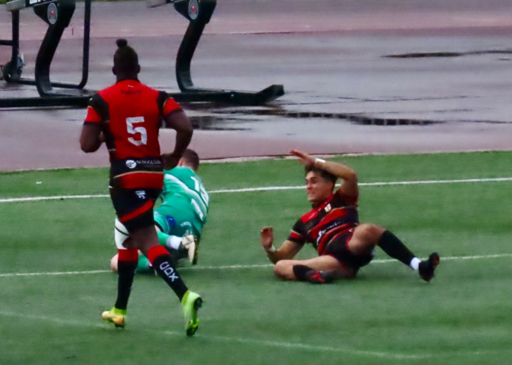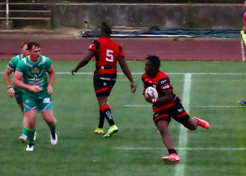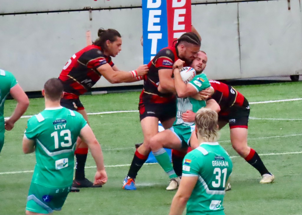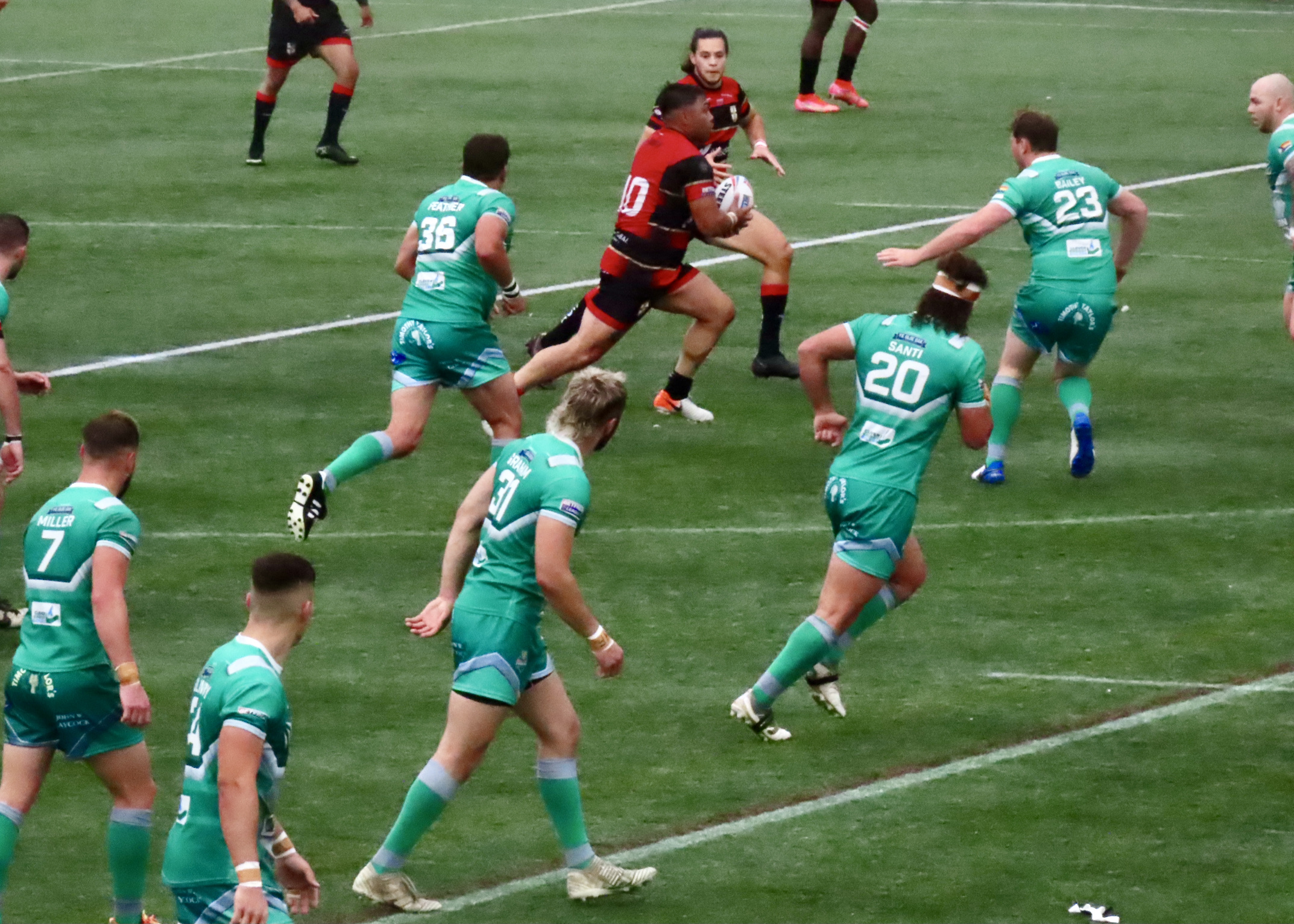 Kyle Kesik who was to make himself known for good reasons later was heard chivvying his team on, the swearing wasn;t the best to hear but it ultimately proved to be effective. We seemed to be in some sort of drop zone as Skolars fumbled the ball on more than one occasion, and Cougars did the same after a great run by Robert Matamosi, all that effort coming to nothing with the fumble. However the Cougars were in attack again after a Skolars mistake close to their own line. The attempted try was held up, I did have to chuckle to myself when the travelling fans felt they could see better than the officials, they’re a loud and enthusiastic bunch the Cougars fans!