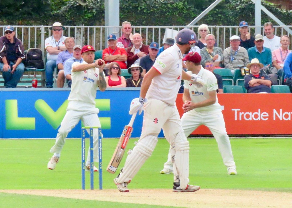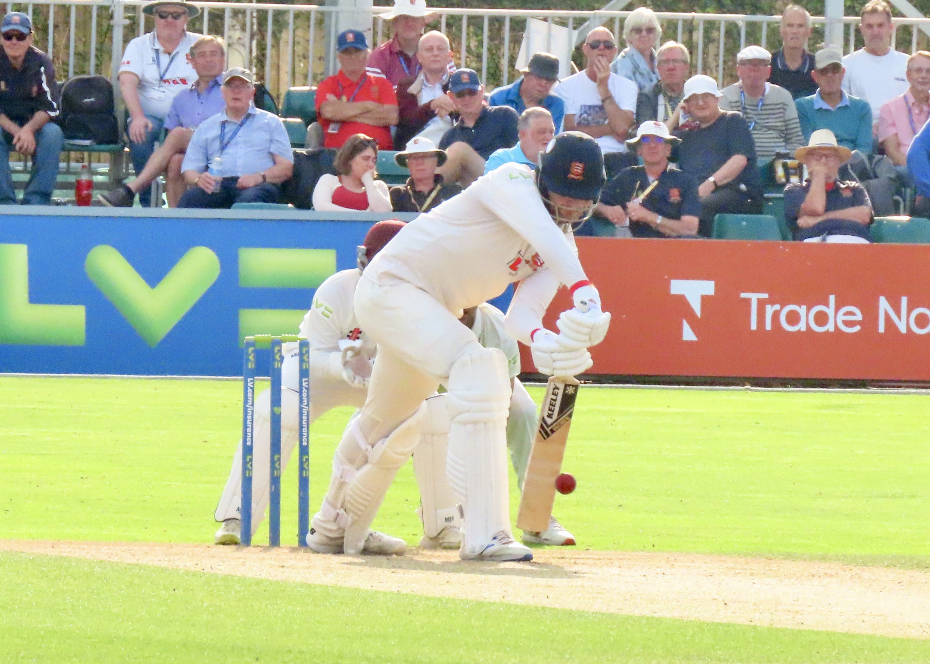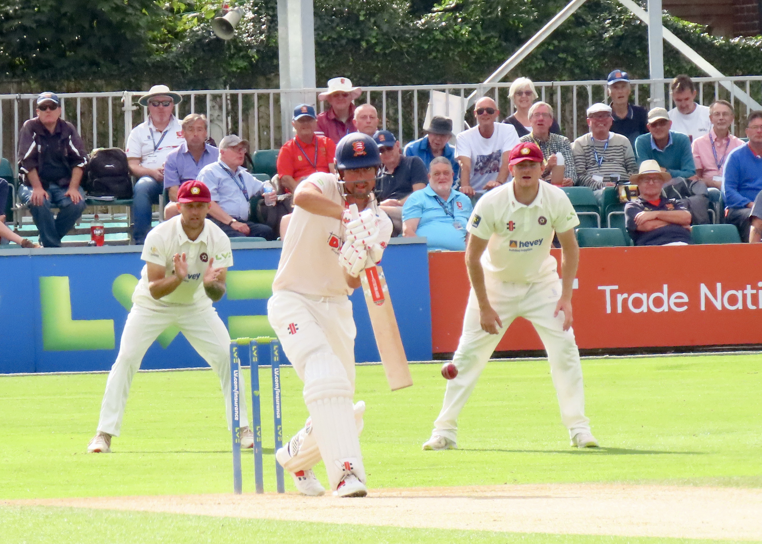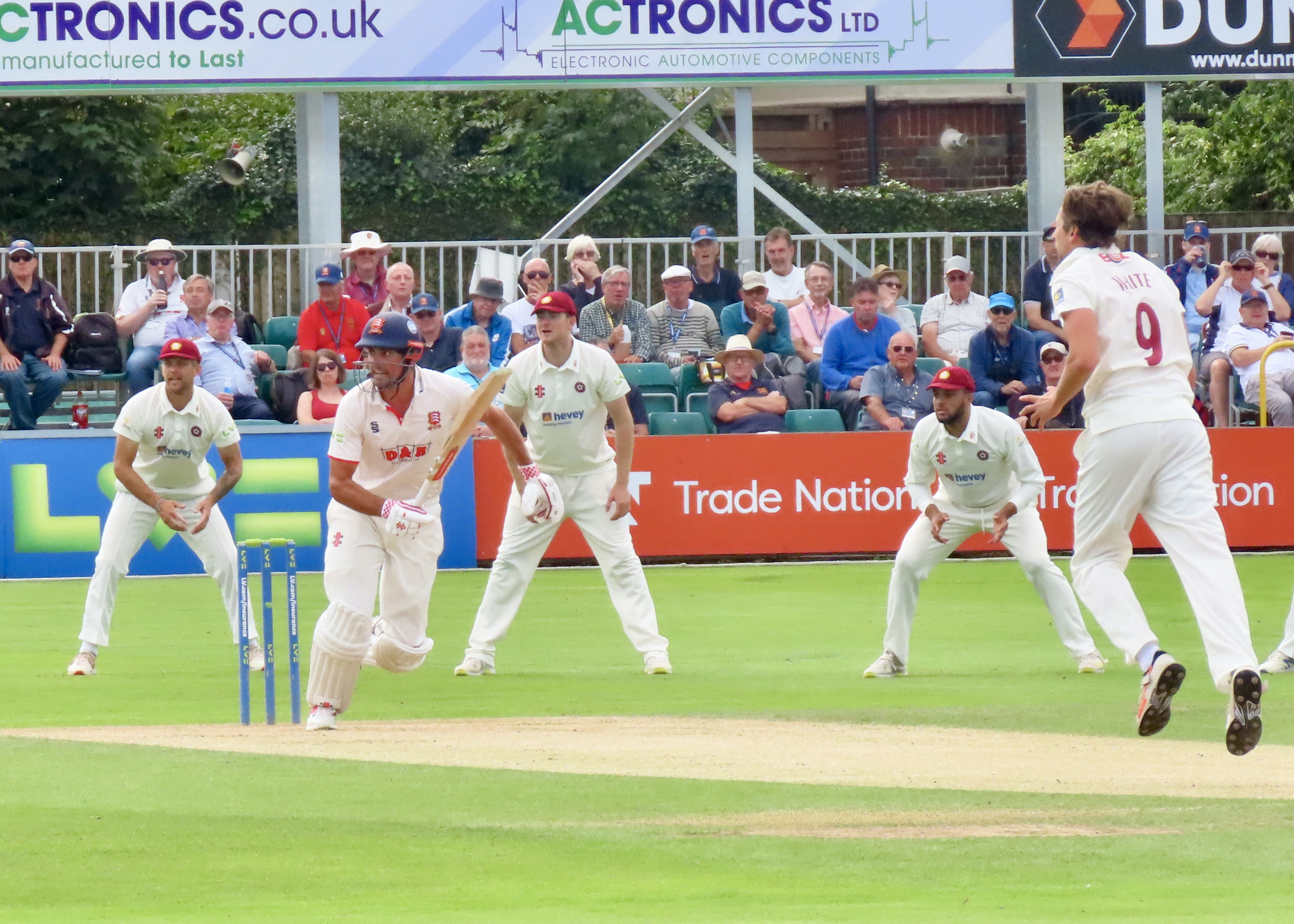 Those 7 wickets were soon followed by the 3 required to finish the innings; just 21 runs were added, giving the total of 81 All Out. Remarkably Emilio Gay made 38 of those runs; facing 74 balls over nearly 2 hours. Sam Cook took 5 for 21 in his 12 overs. The whole innings was over in 34.5 overs. Would Essex fare better? Well, a little, they lasted for 43.2 overs and scored a huge 170 runs, with Adam Wheater being the top scorer with just 34. Tom Taylor and Jack White took 4 wickets each.