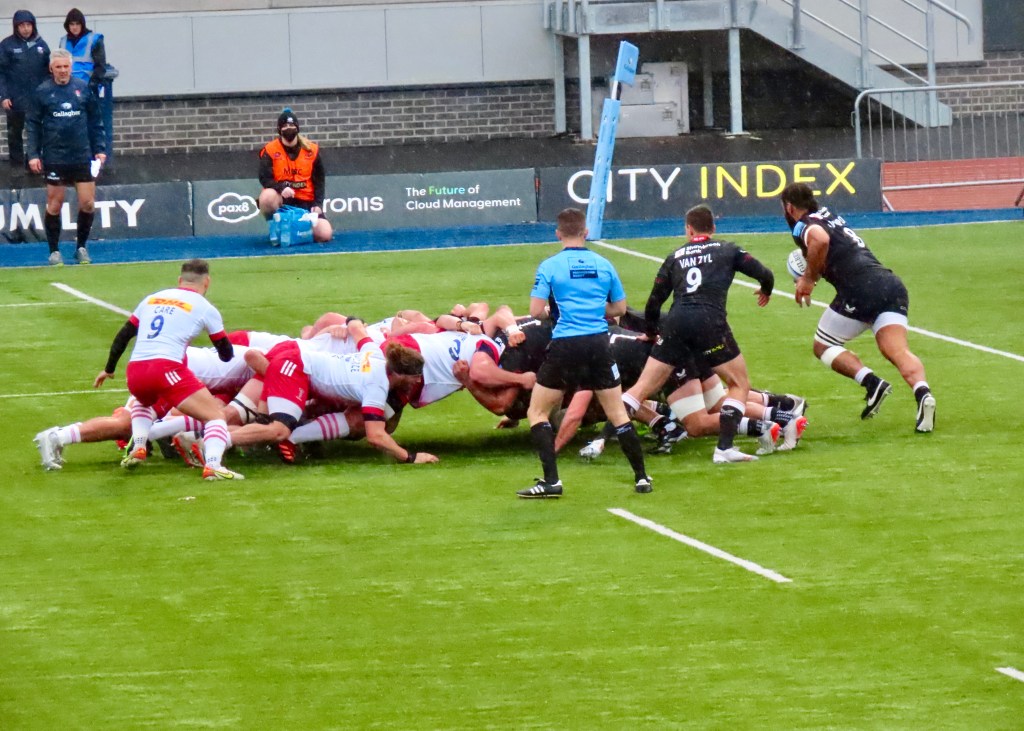 Quins won a free kick from the next scrum as Vincent Koch engaged too soon, van Zyl looked to have found a gap as he sprinted away from a ruck, he was deemed to have crossed with, I don’t know who, Kayser felt it wasn’t a clear crossing, but hey ho, Sir thought so. Andre Esterhuizen took a kick at goal from within the Quins half, it has to be said, it went nowhere near, a strange decision.