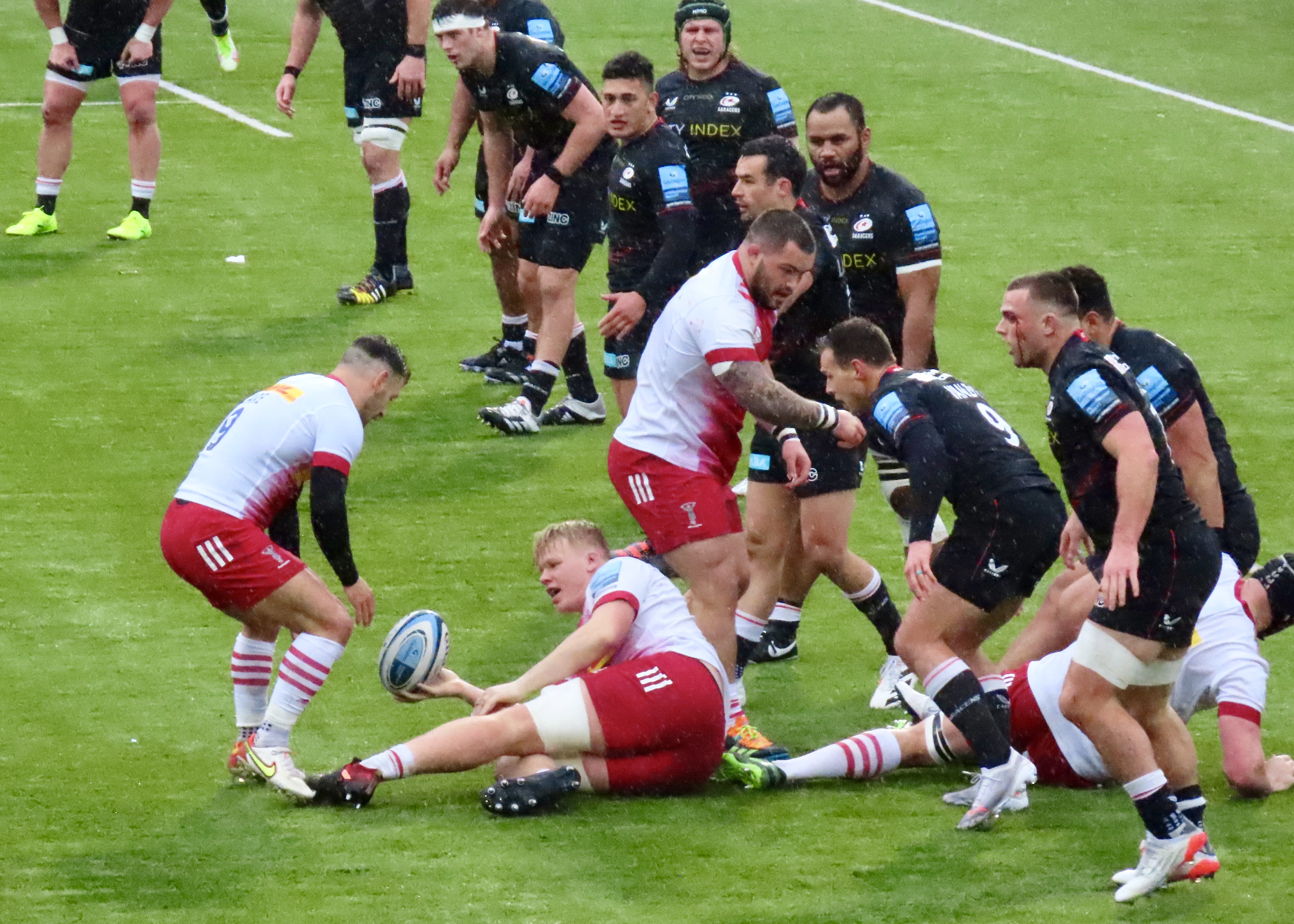 The weather had really deteriorated during the first half and it didn’t let up in the second, we were never going to be in for an attacking masterclass. The Quins Substitute Viliami Taulani came on early in the second half, with a hairstyle that meant he was very easy to spot when he was in the wrong spot on the ground. Saracens took the lead with a Lozowski penalty after 49 minutes.
