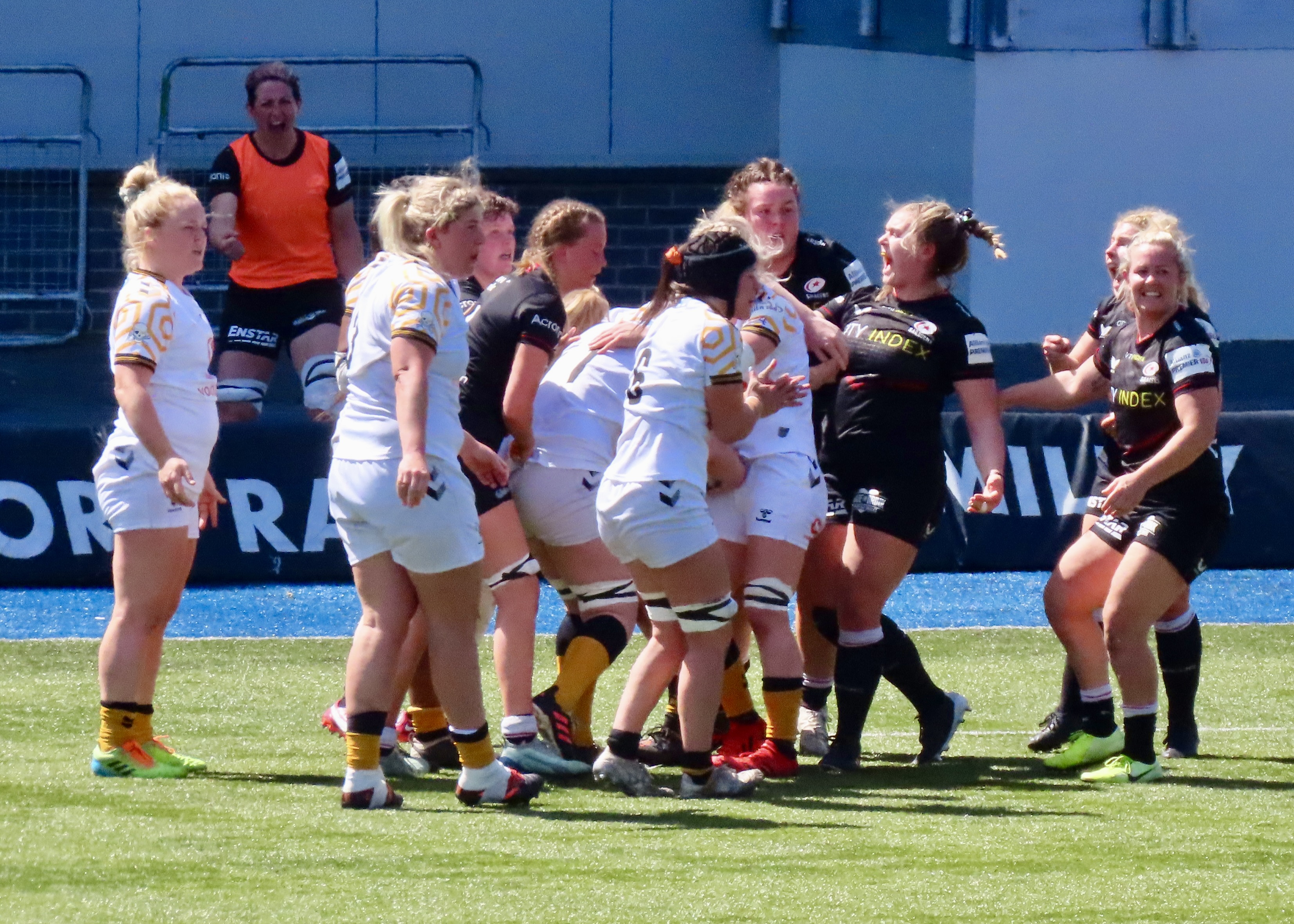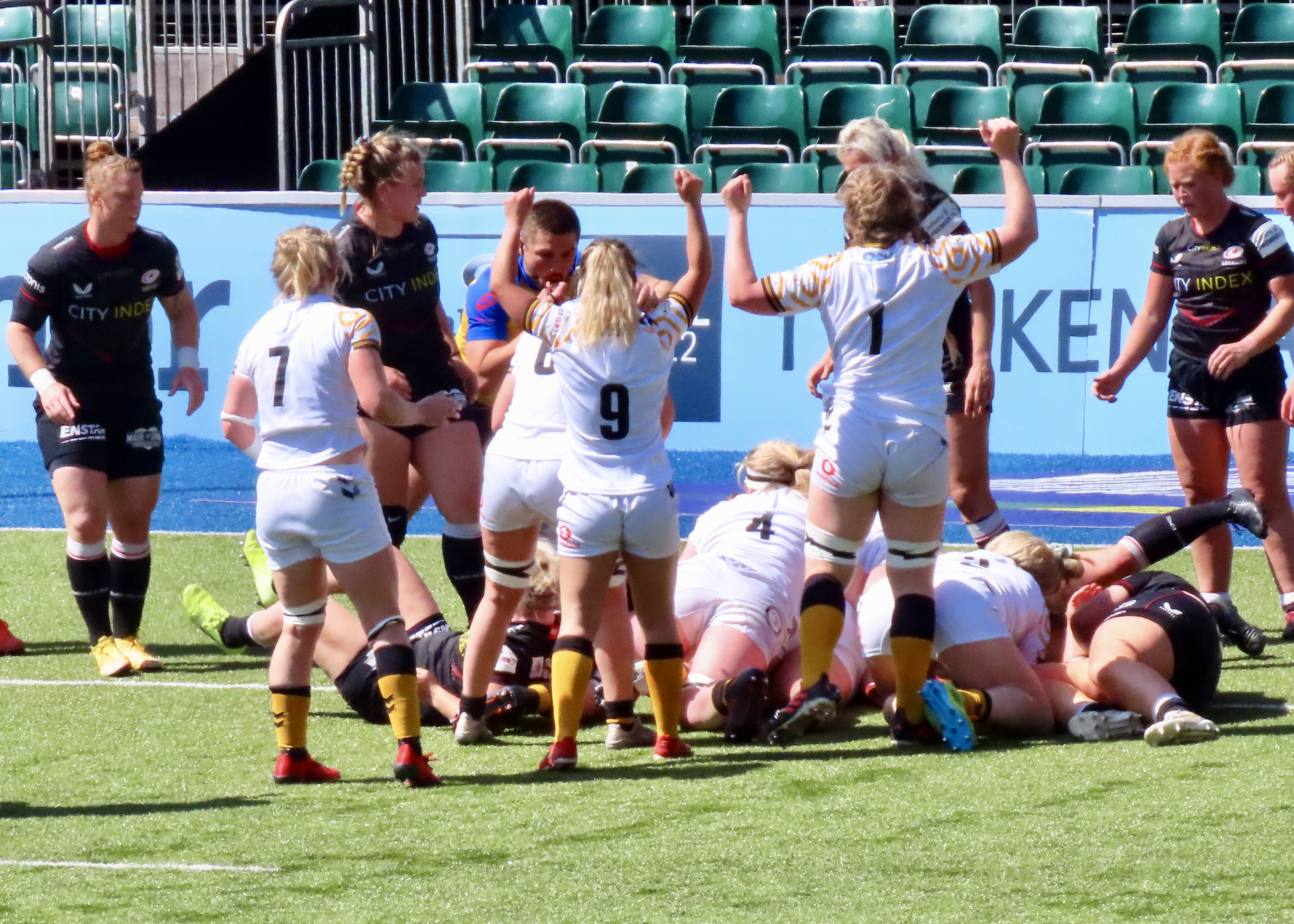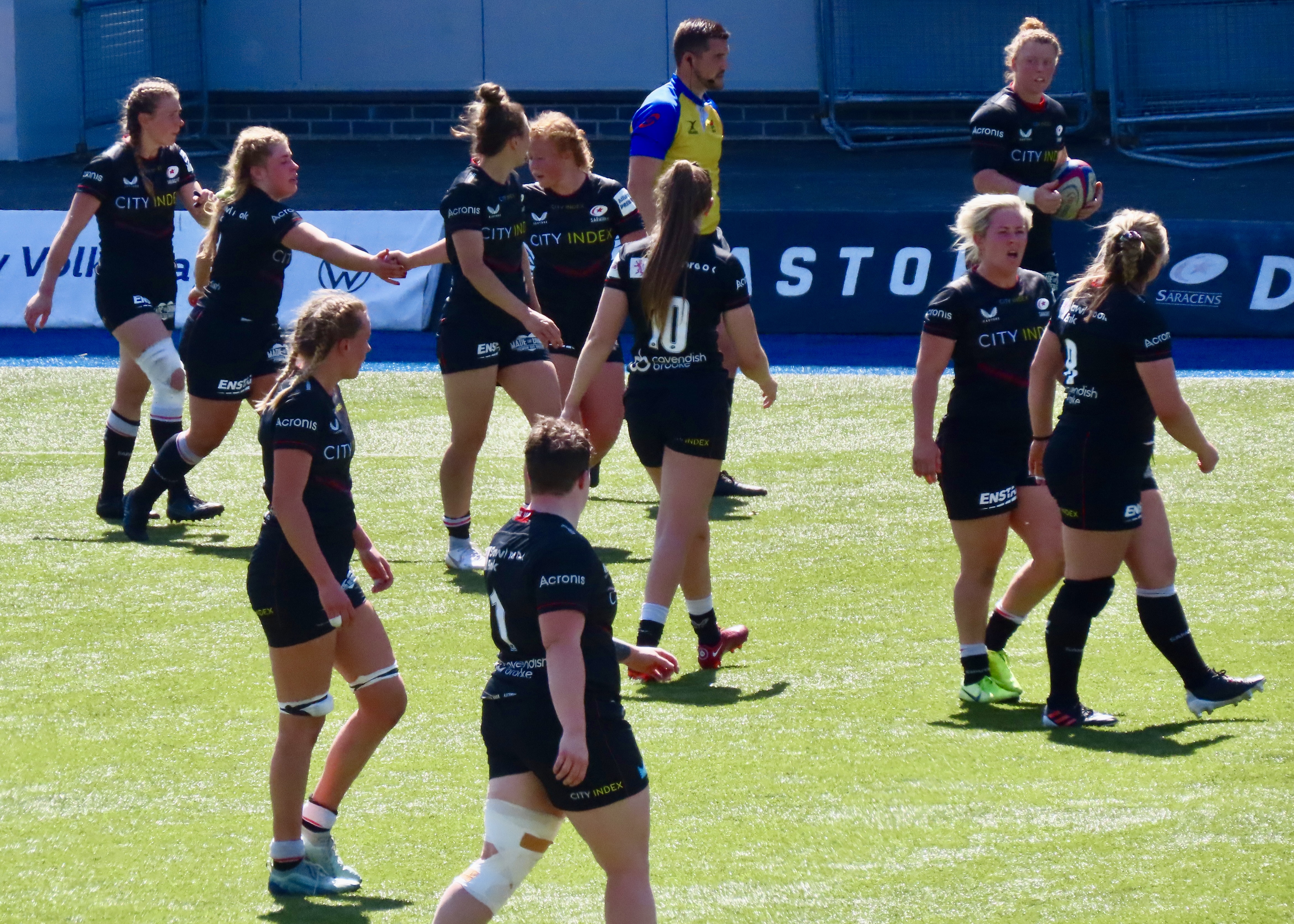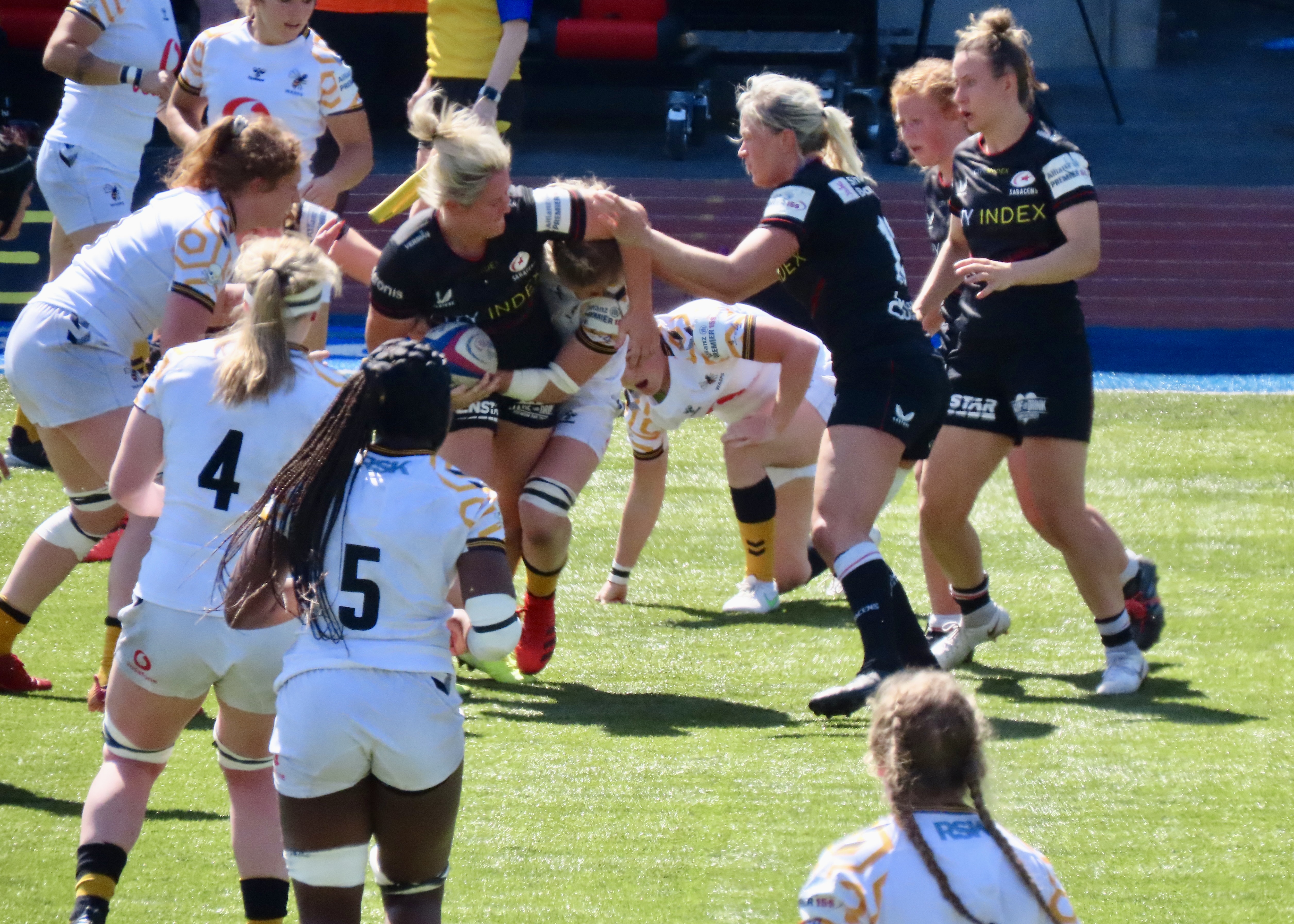 A glorious afternoon at the Stonex Stadium saw Wasps Women visiting, the last game of the regular season was a cracker! Saracens had been heavily beaten in Exeter the week before. Exeter Chiefs Women scored 54 to Saracens 12. Wasps had played and lost to Gloucester Hartpury Women. Saracens had 15 wins for the season and Wasps 9.