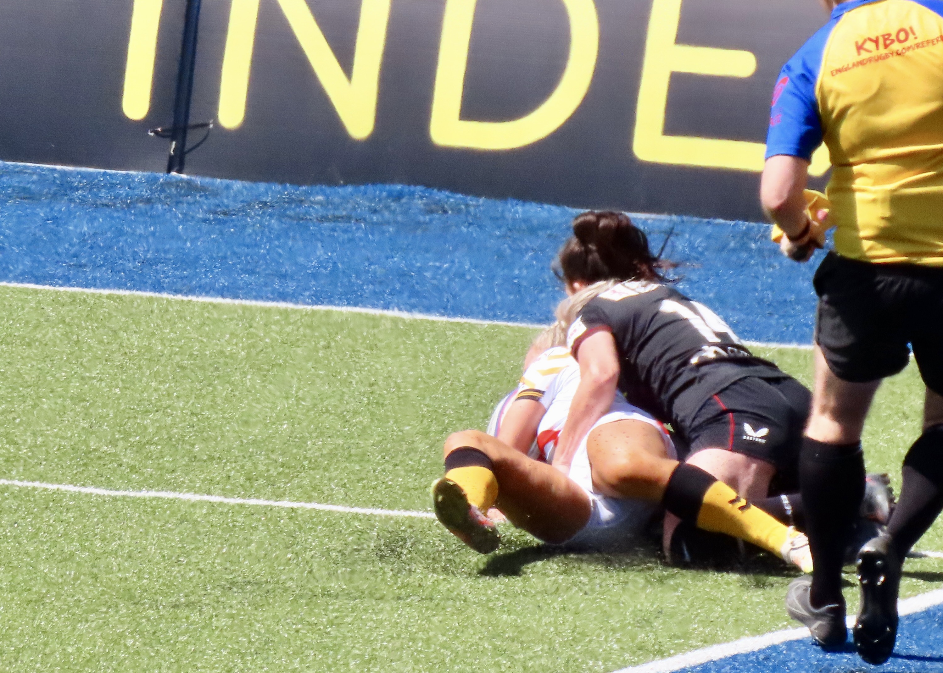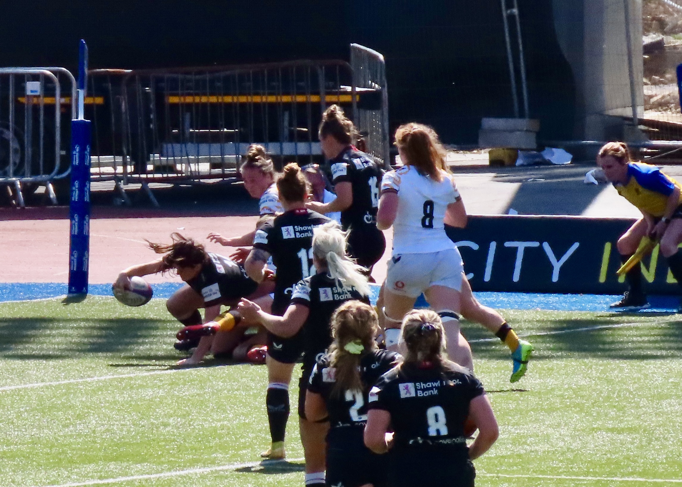 5 minutes later and the ball went out to Ellie Boatman on the wing, in spite of a valiant effort by Alysha Corrigan she made it over the line in the corner, another great try.