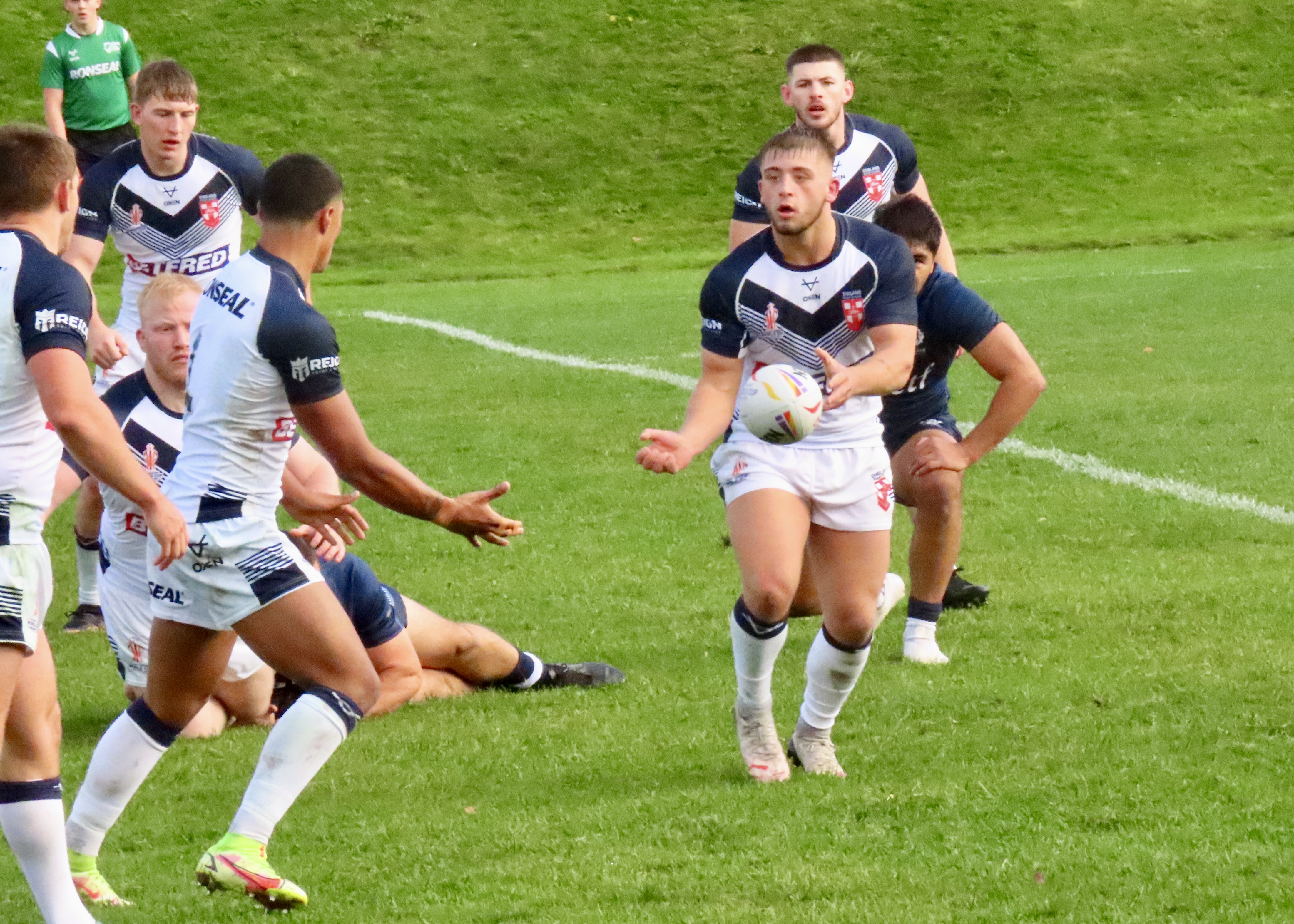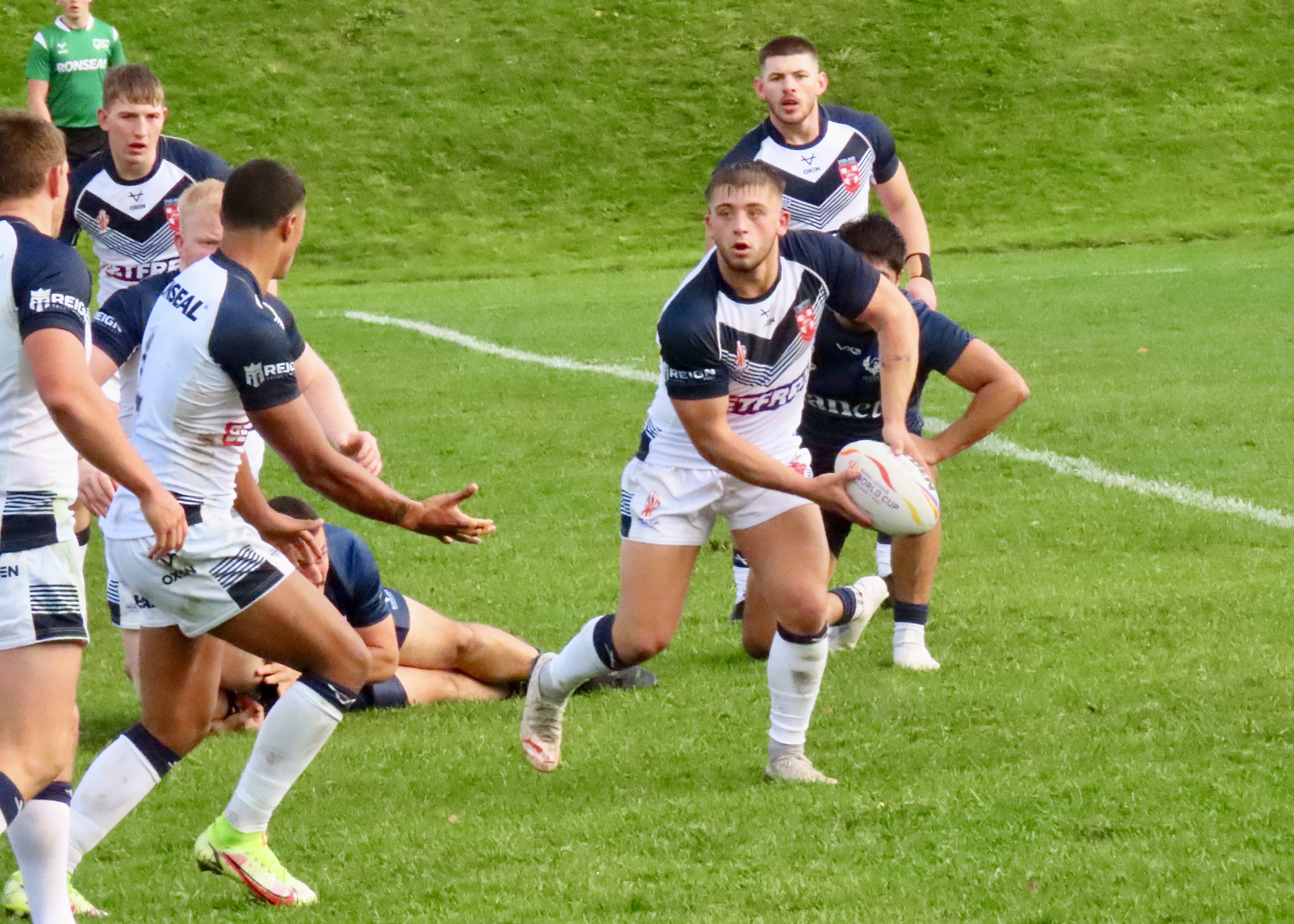 Josh Thewlis, who plays his club rugby for Warrington Wolves, was helped to his hat-trick by Mikey Lewis, who put a great kick into the in goal area, Deon Cross nearly stole his thunder but he went past the ball, leaving Thewlis to touch the ball down. Thewlis wasn’t finished with getting his name on the score sheet and scored his fourth, this time he took a great pass from Cross the ball was just behind him but he gathered the ball and ran in to score. He’d managed to head closer to the posts and this one saw a successful conversion and a lead of 22 for England Knights, with 52 minutes on the clock.