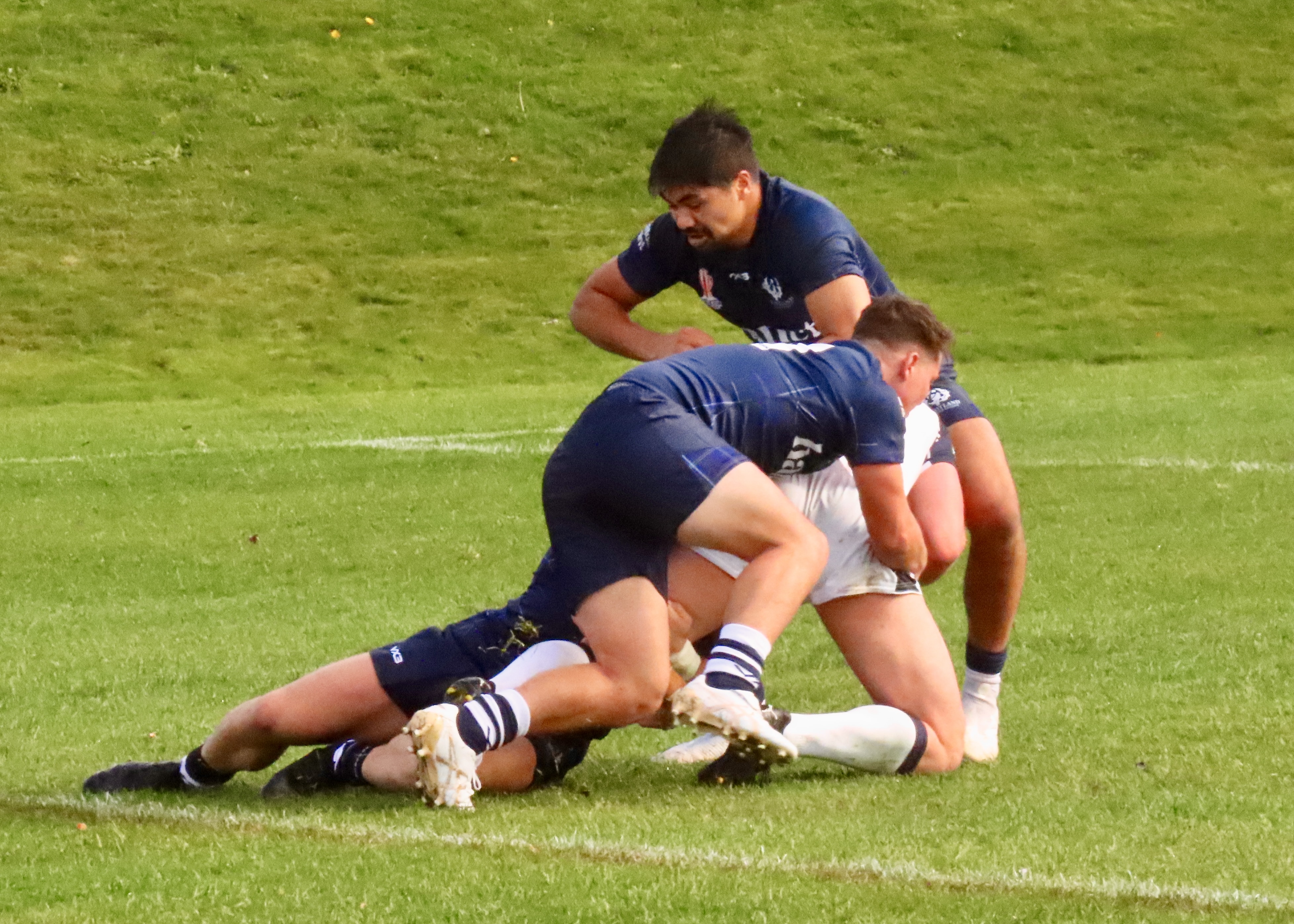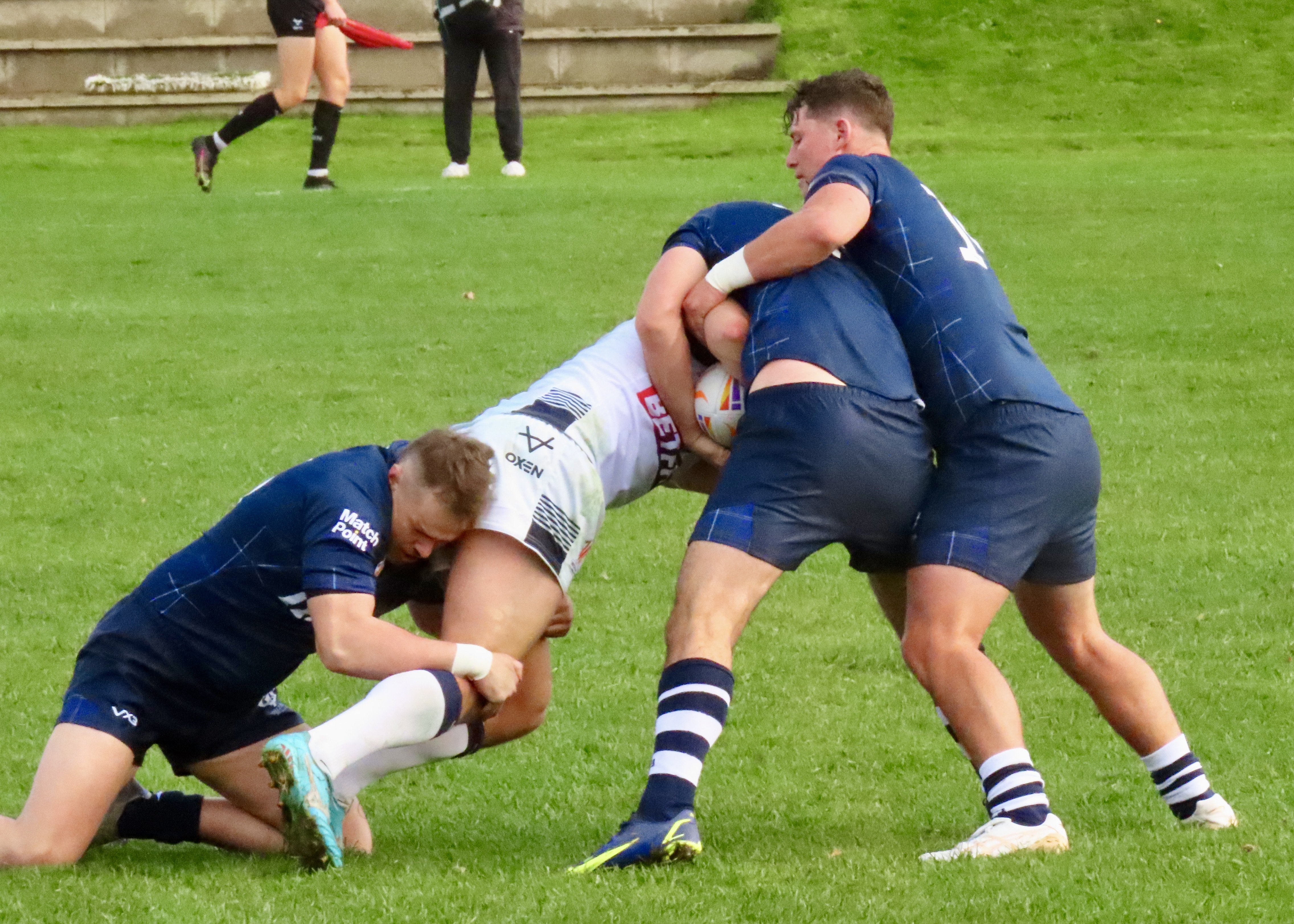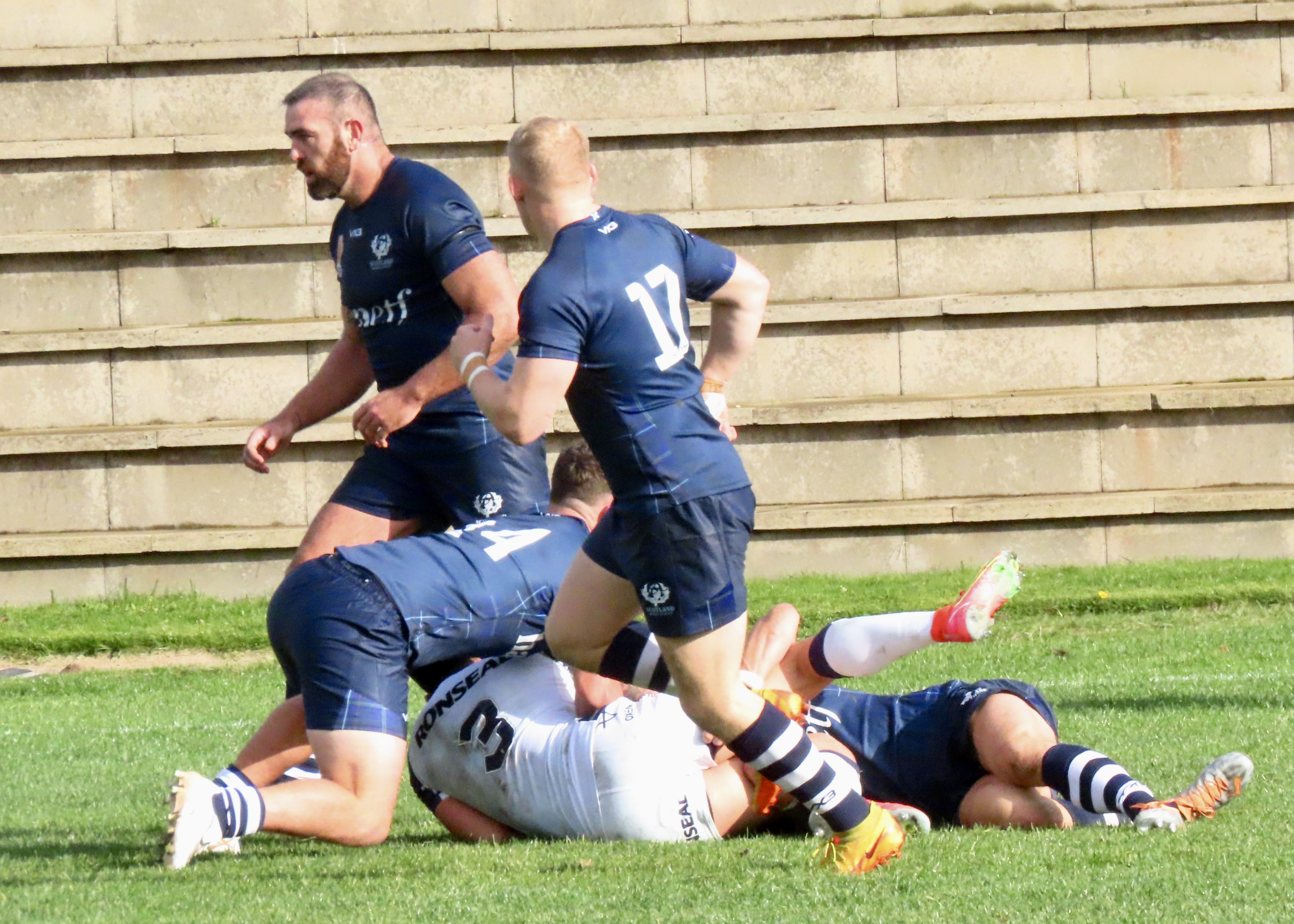Scotland got on the scoreboard 6 minutes later when Bailey Haywood put a perfectly weighted kick into the in goal area, Kane Linnett was there to touch the ball down. Looking back at the video coverage, I’m not convinced the try would have been given with the benefit of a video ref. However a few things went ‘unseen’ during the match and that’s how things roll in such a high -paced game. It was good to see the joy from this Scotland team, they are definitely gelling.