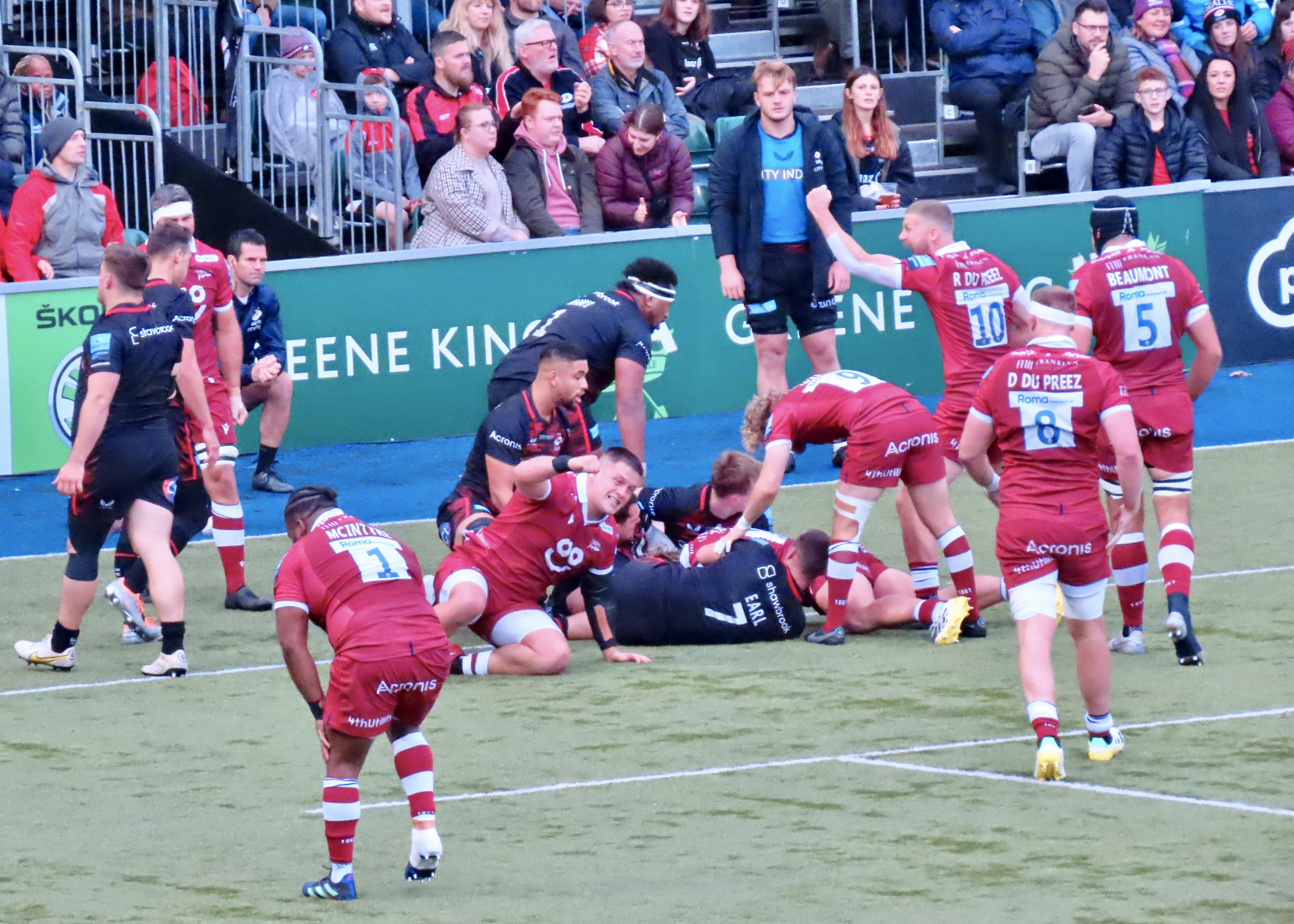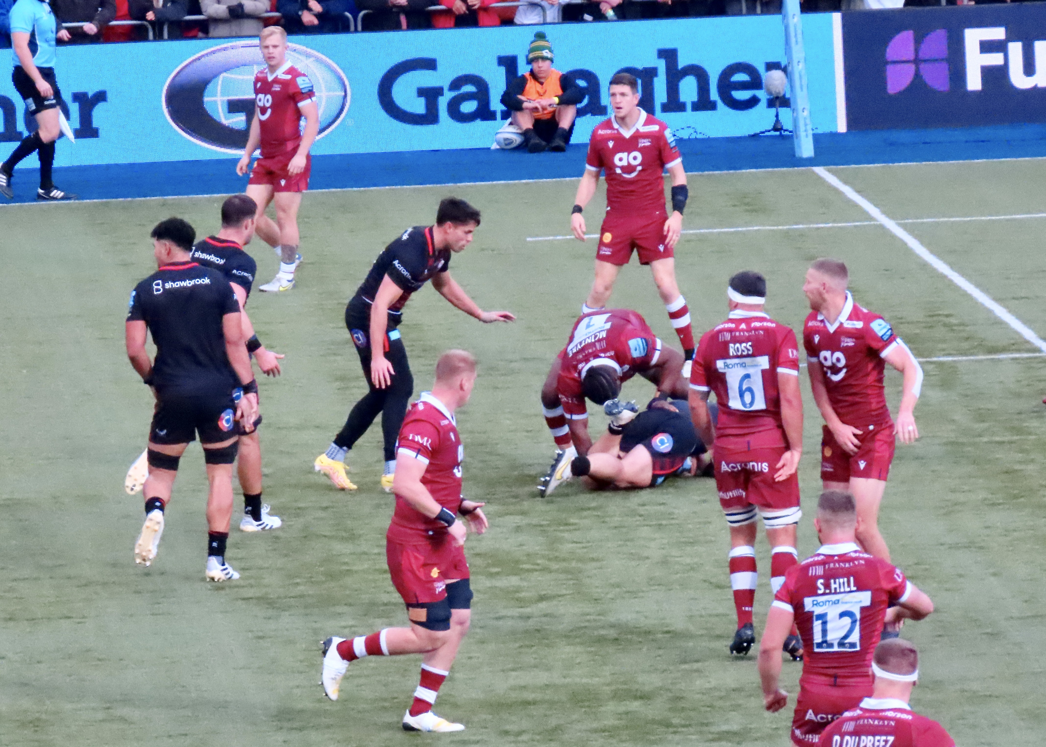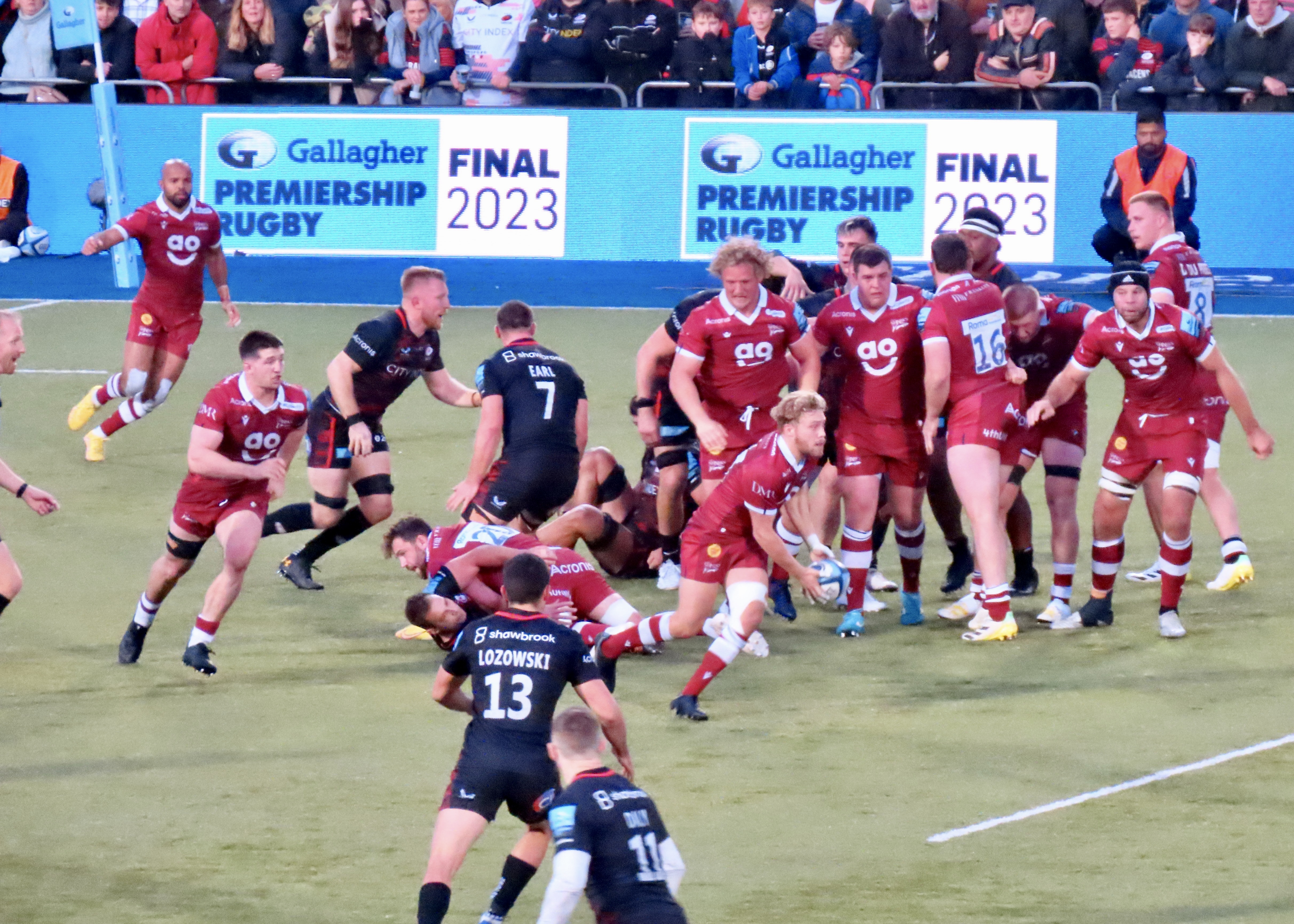 Nick Tompkins saved a certain try as Gus Warr was heading ti the kine from the back of a ruck, he spotted the scrum half from the fat side of the ruck and got across to stop him. He was then the try scorer on 75 minutes, a lovely kick through by Goode was missed by Carpenter but touched down by Tomkins. A funny moment on this one as a Twitter friend Laura pointed out, Alex Lozowski , who was just behind Tompkins, had no one from his team to throw his arms round in celebration, so he cue a hug for Sale’s Gus Warr. Goode took his time with the kick and the score moved to Saracens 33 Sale Sharks 22 and that was where it finished.