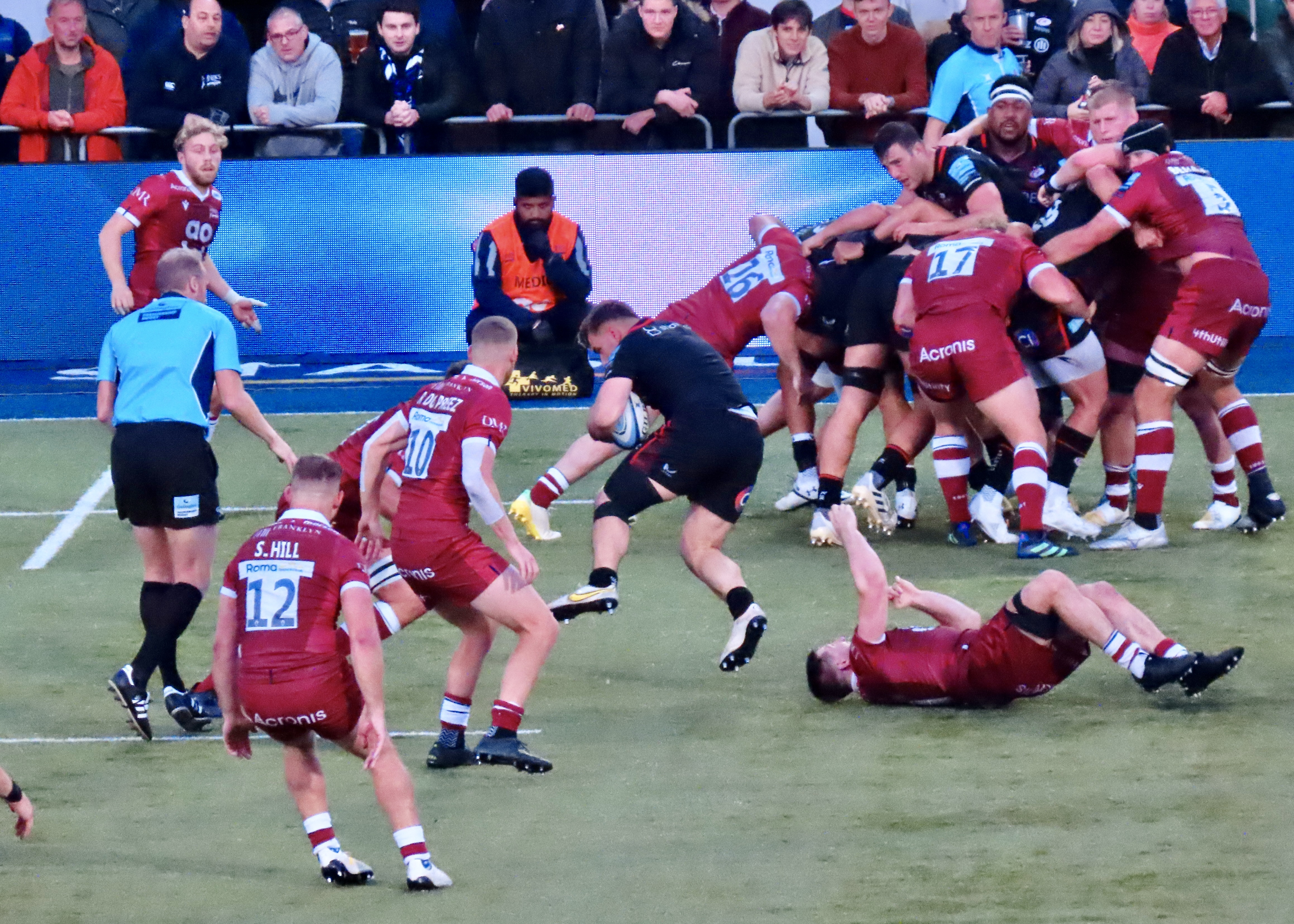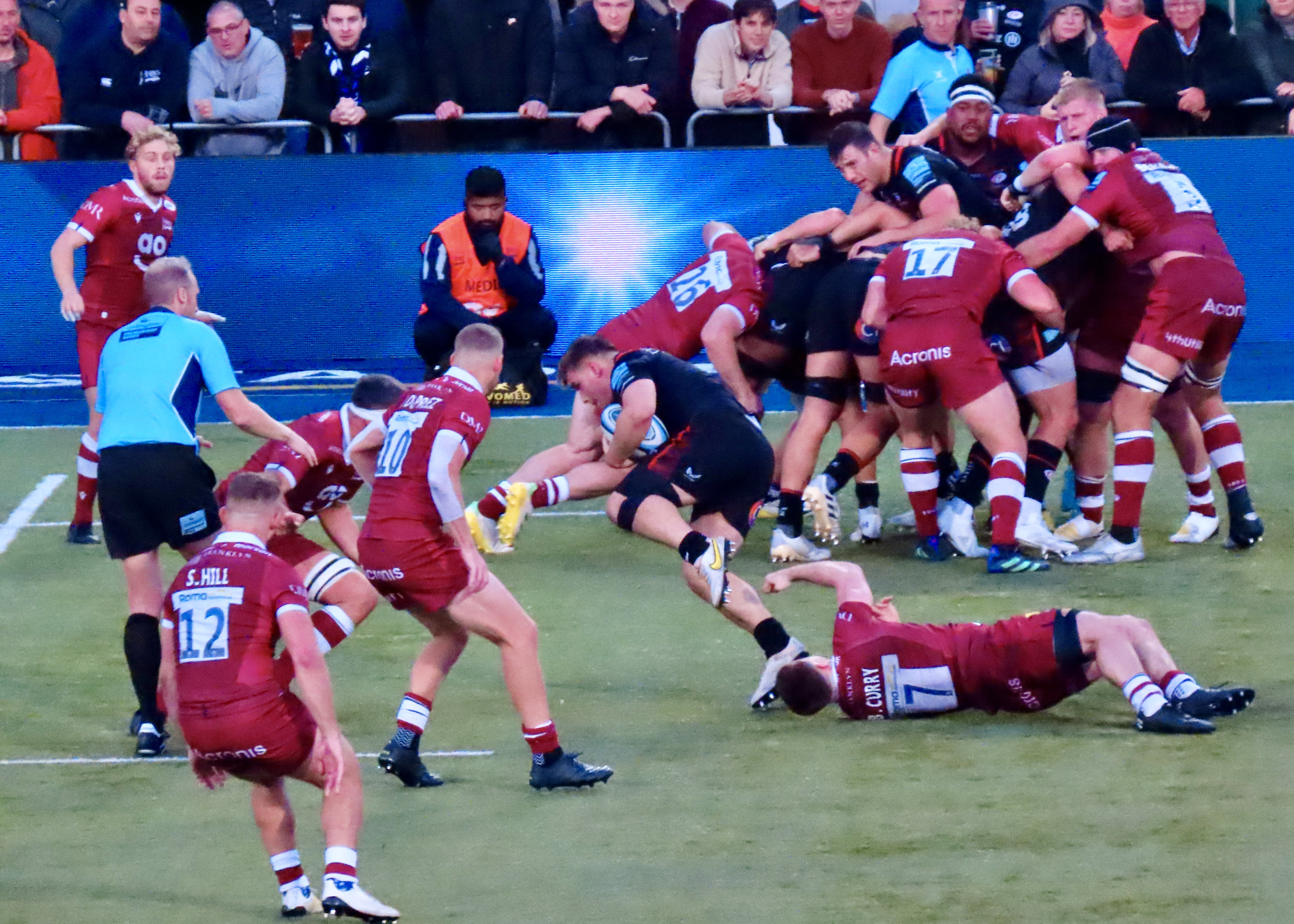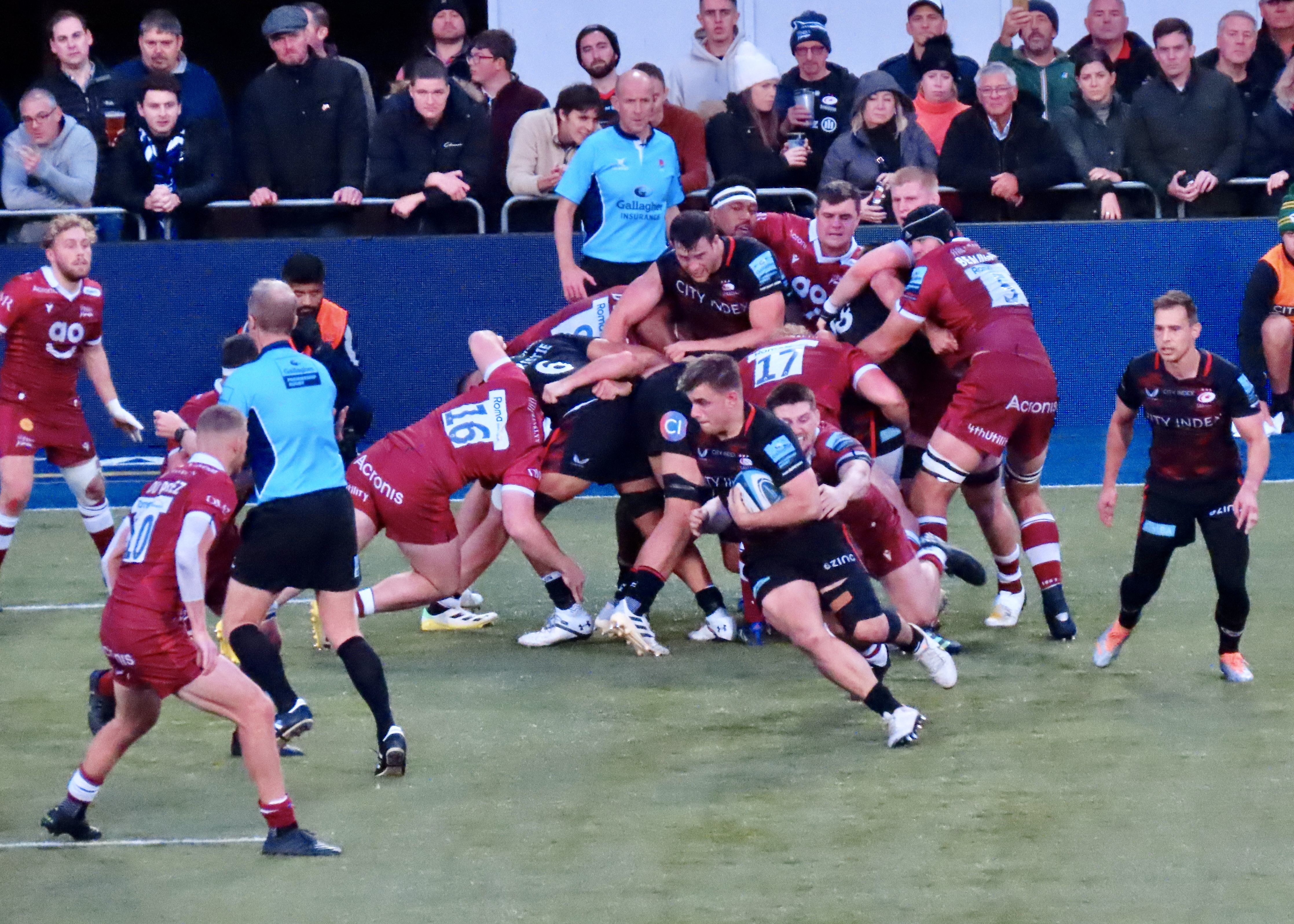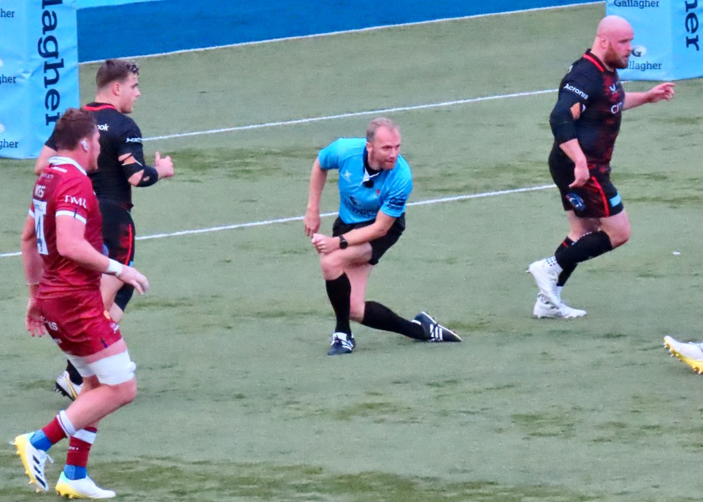 The game had another lull as far as points were concerned, we did see Wayne Barnes come a cropper again as he got in the way of the Saracens scrum half Ivan van Zyl, happily for him he didn’t go to ground this time.