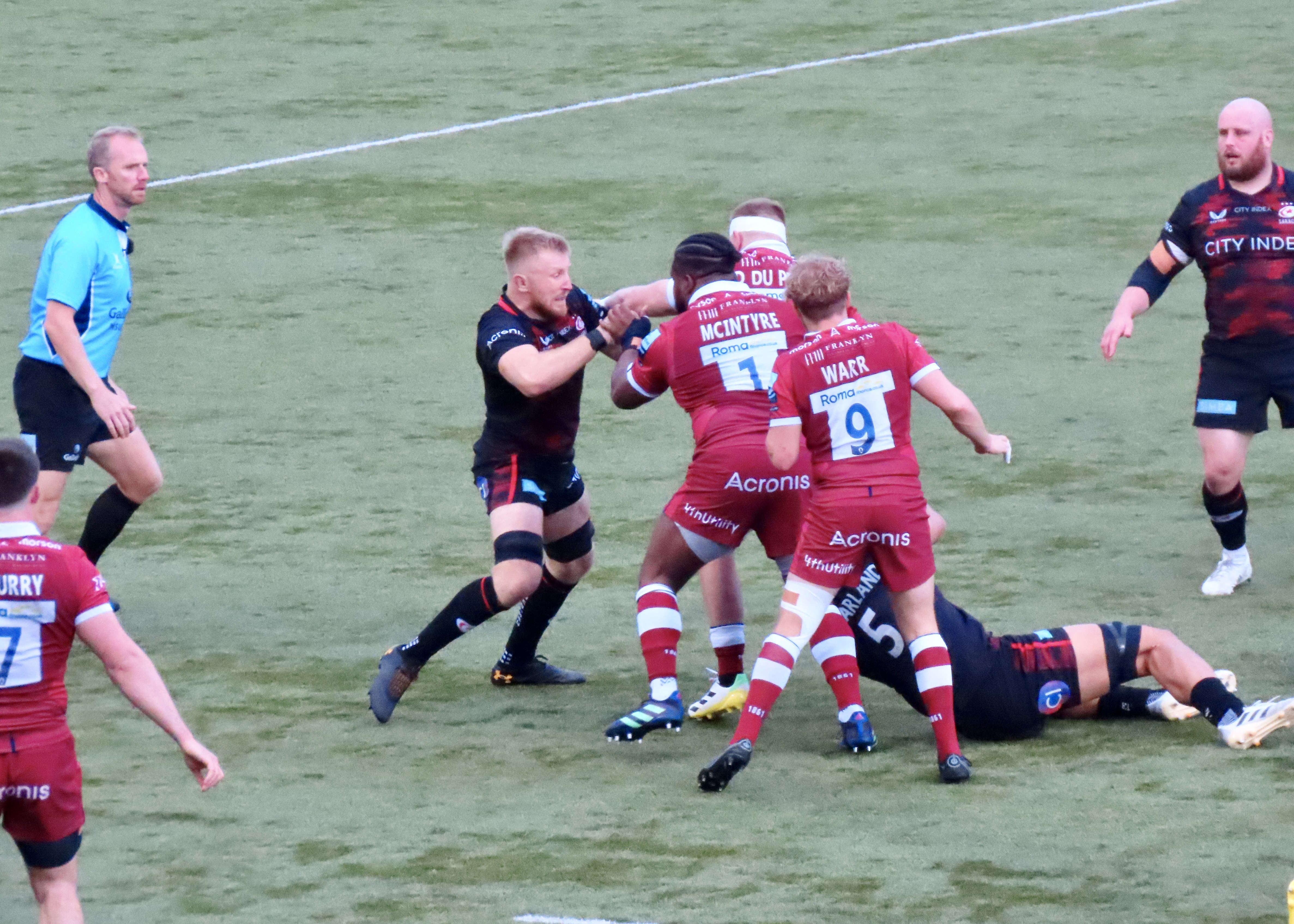 R du Preez took the lead again for Sale with a penalty kick, one of 16 conceded by the home team, the highest yet for this season by my reckoning, not a great stat. Sale were penalised just 7 times. After 12 minutes it seemed the commentary team had a win for Sale in their minds and that possibility was reinforced when Ben Earl, captain for the day, was shown a yellow card as Sale were awarded a penalty try on 15 minutes. I’d have liked to hear Wayne Barnes response as he was knocked to the ground for the first of two time during the game in the build up to that try – ‘I’d already made the tackle’ – was a good response to being bundled to the ground, he took quite a hit! For some reason we had the second set of ‘handbags’ which saw McFarland’s shirt ripped apart, I should be professional and not say too much, but I have to say, wow!