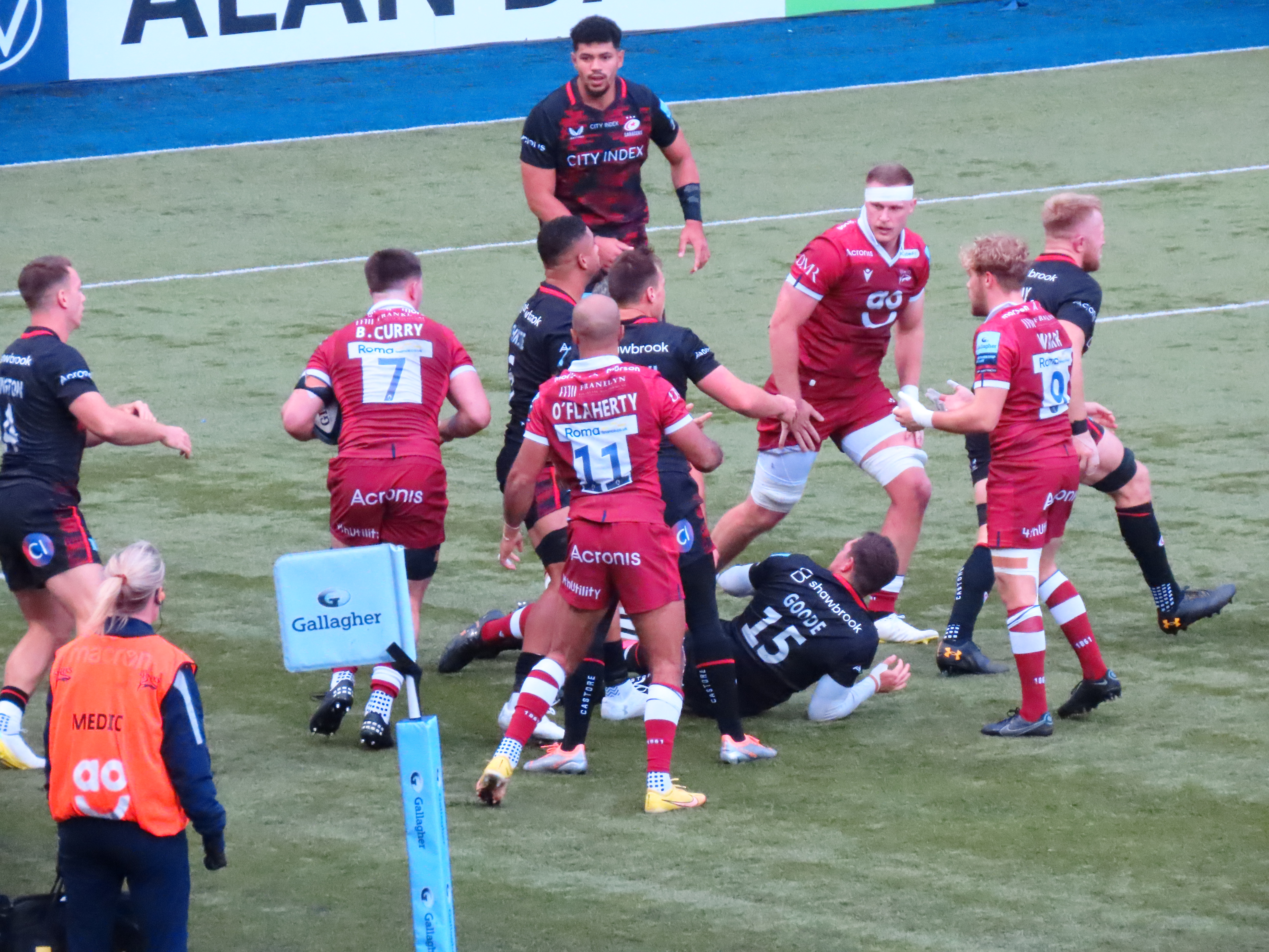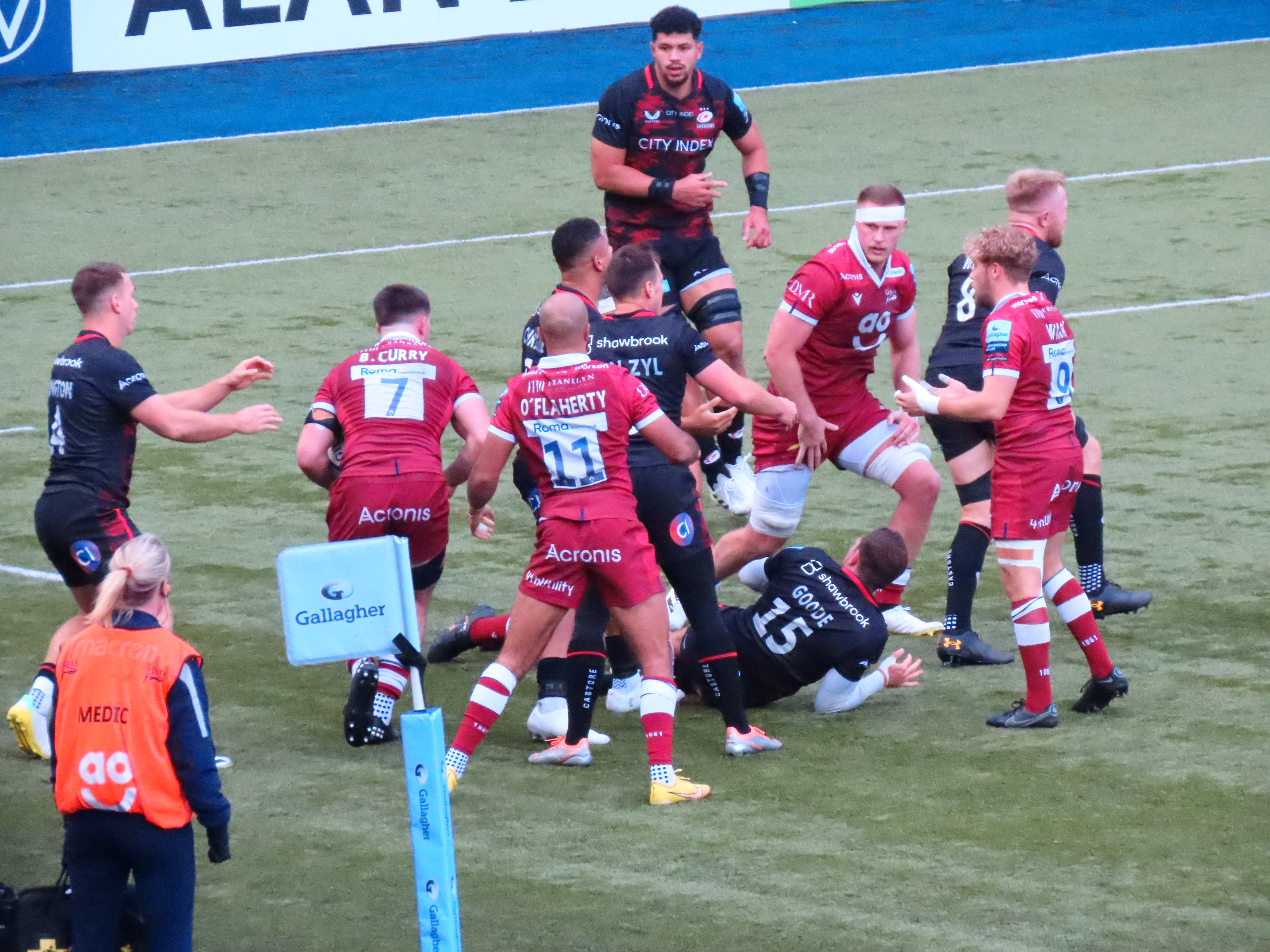 Alex Goode took the restart, in spit of Vunipola still being present, crowd (and commentator) favourite Theo McFarland leapt salmon like into the air to take the ball. The ball went left then back into the centre, Vunipola popped a pass to Alex Goode, who found one heck of gap to score Saracens’ first try of the game. The kick went to the left of the posts.