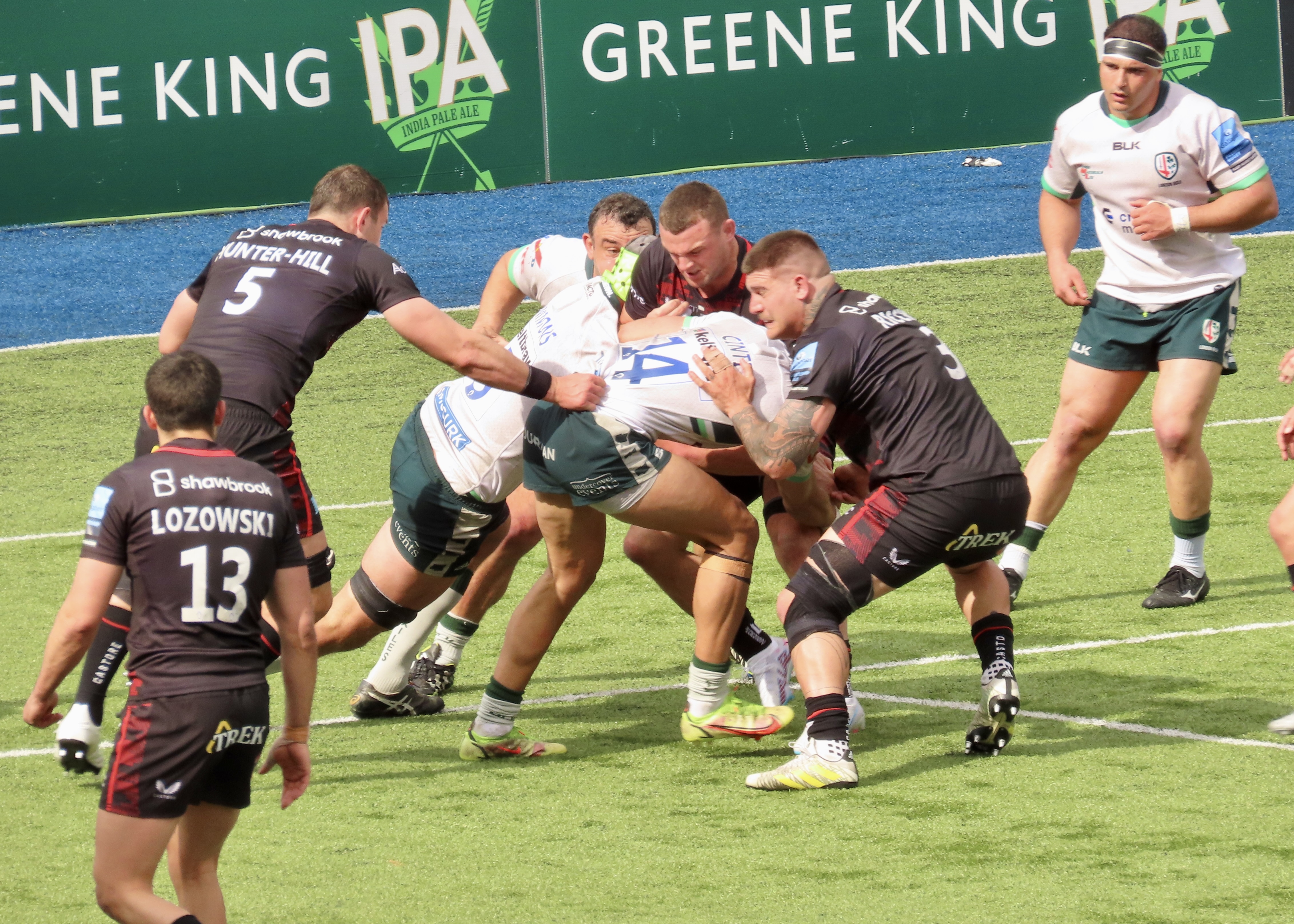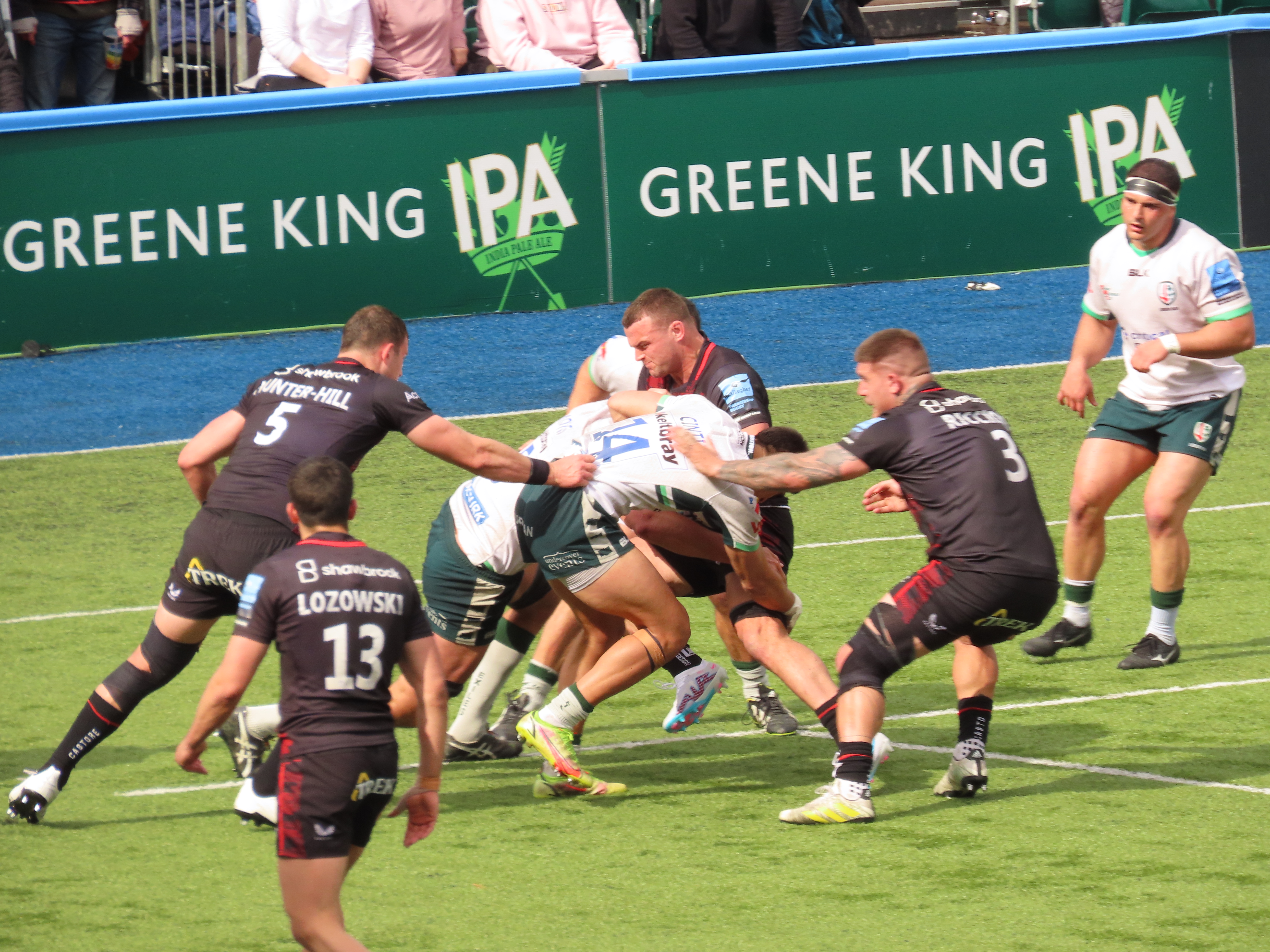 An Irish penalty pulled 3 points back, Hugh Tizzard took part in a great tackle but rolled away into Ben White, the penalty was in front of the posts so a no brainer for Jackson. He added another 3 a couple of minutes later after a massive tackle on Tizzard by Fa’aso’o, it was a text book tackle and resulted in Saracens holding the ball. Words were also penalised with a march forwards and Irish had closed the gap to 4. Fa’aso’o was rewarded for his tackle with a seat on the bench as another massive player replaced him.