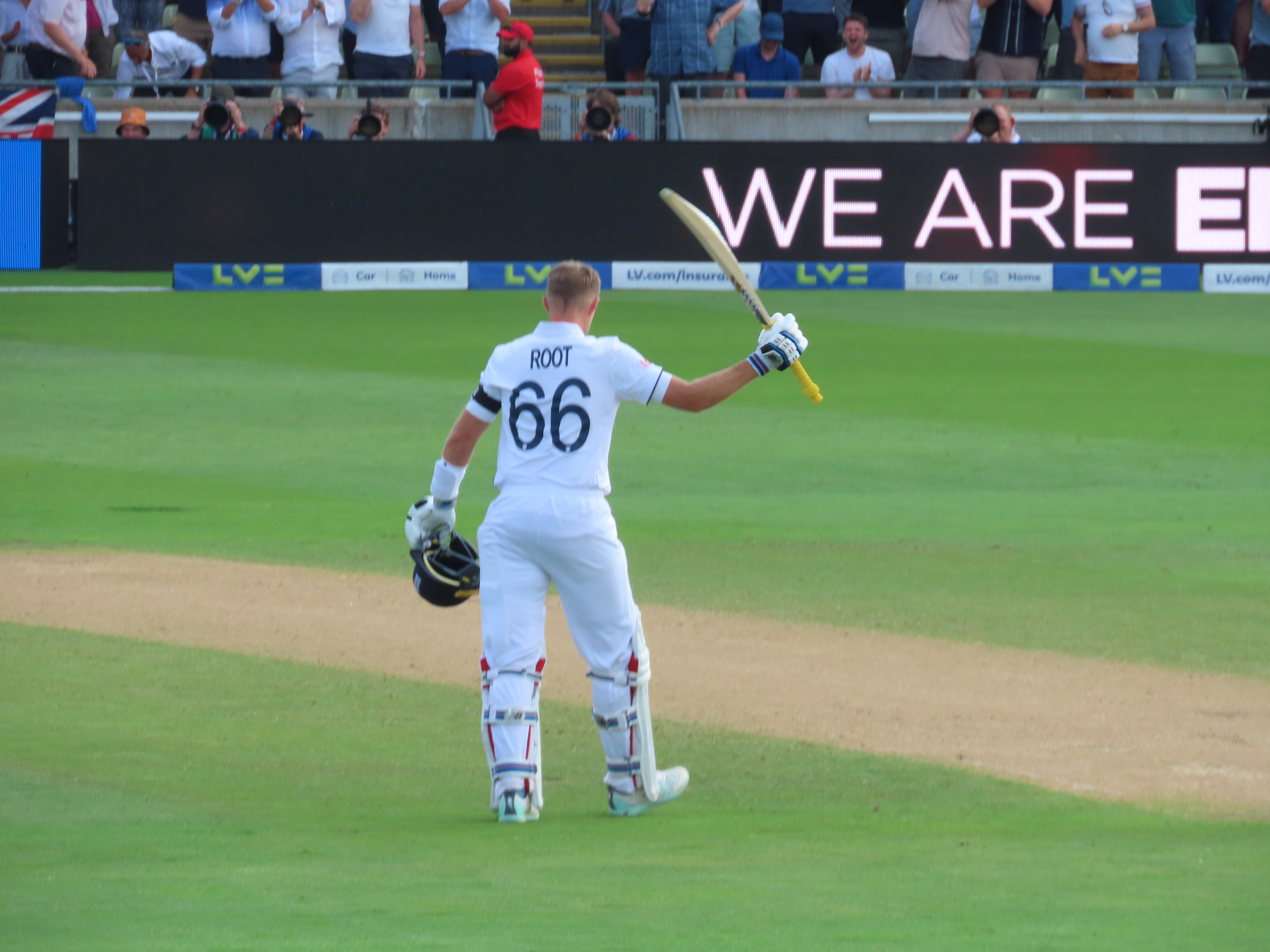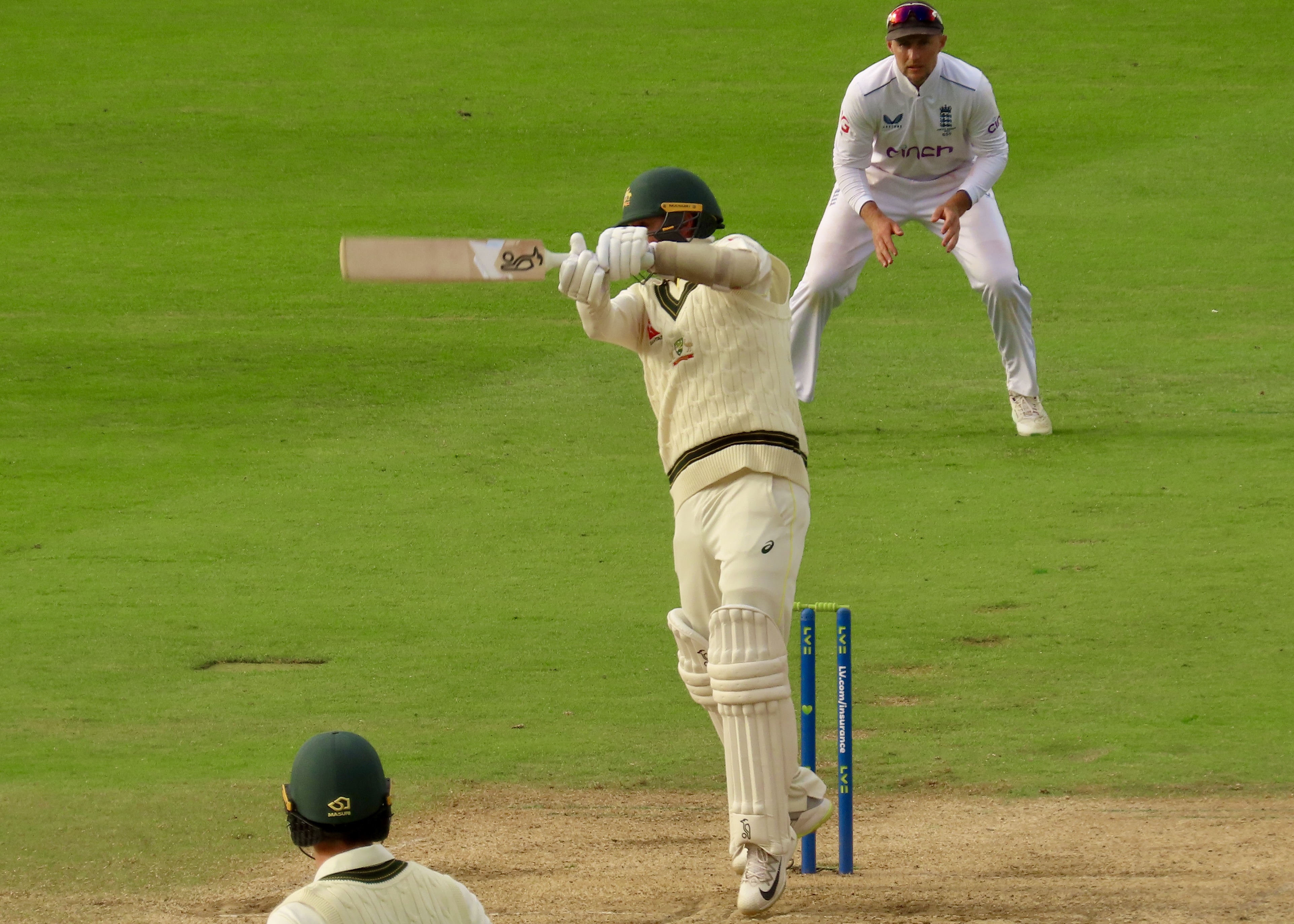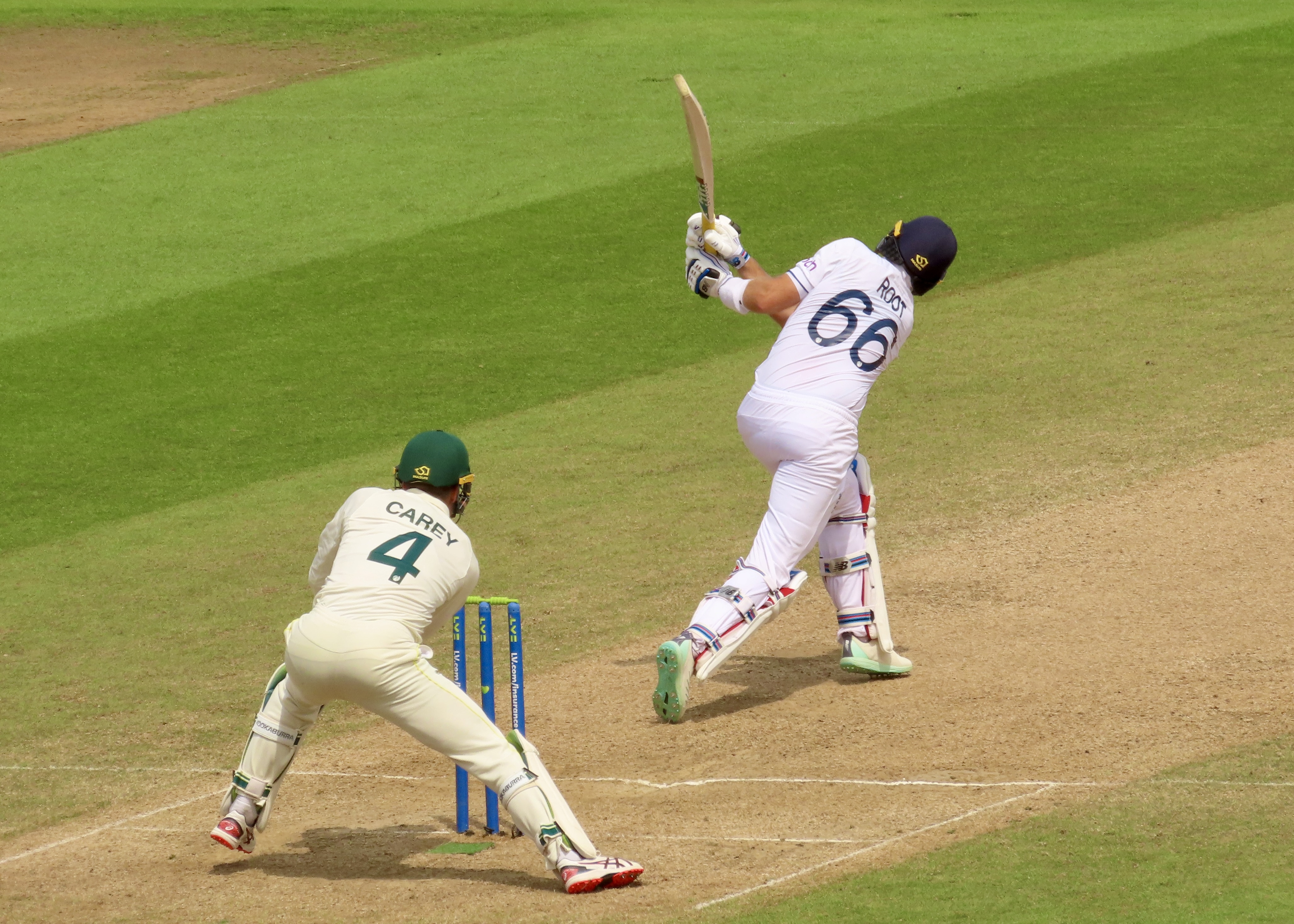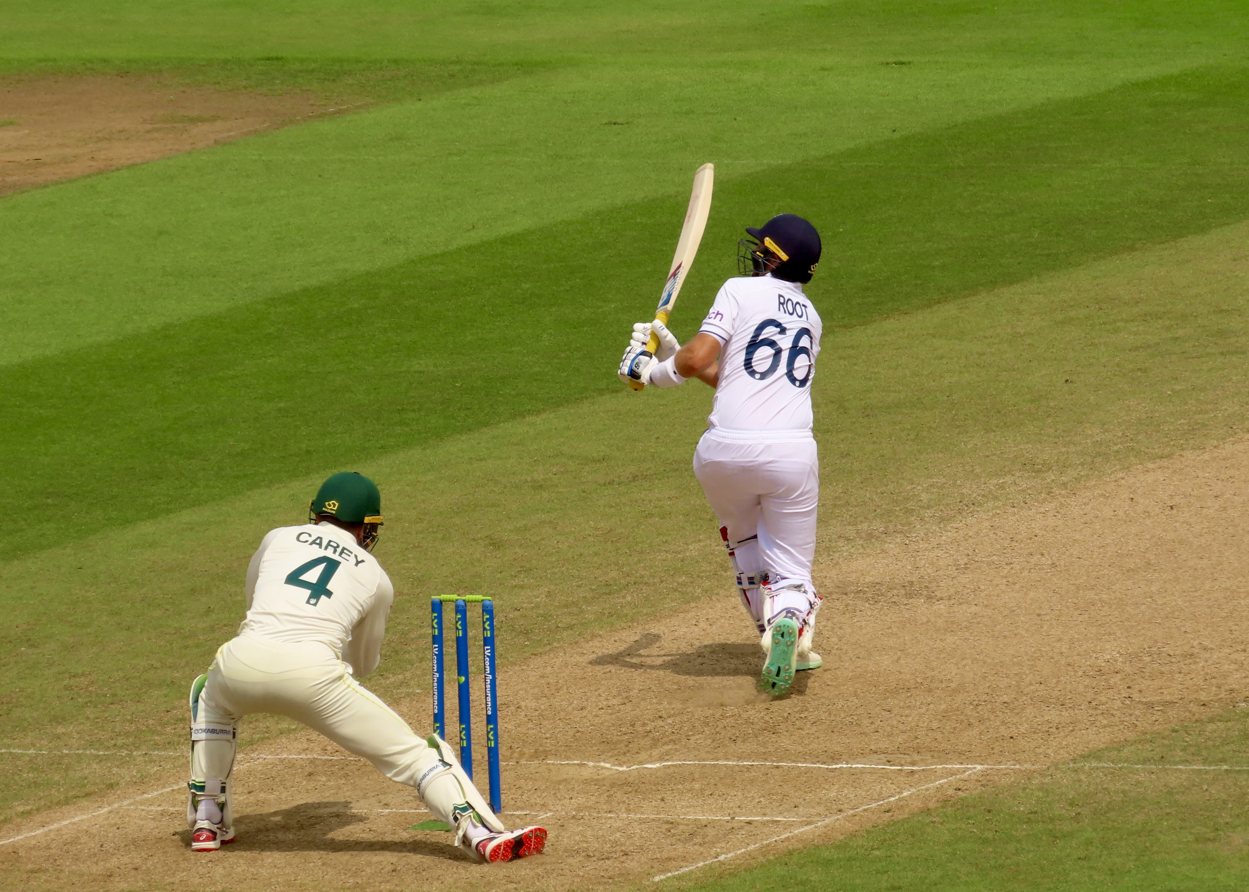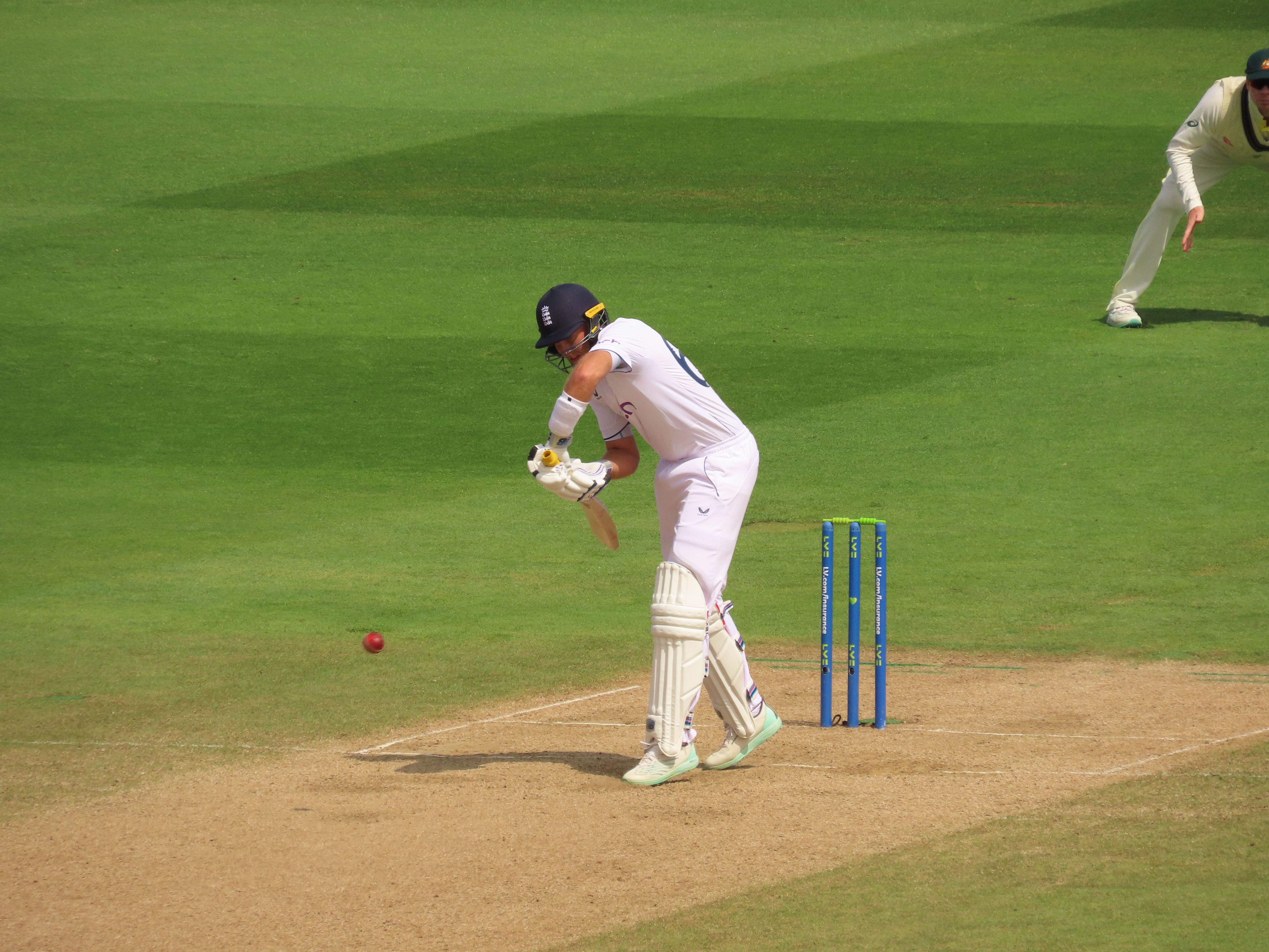 Day 1 saw Ben Stokes win the toss and elect to bat, we’d see that BB early on; except to a great degree we didn’t, what looked like very negative fields set by Cummins stopped the runs fest to a degree. Zak Crawley set the tone with the first ball however driving the ball for a very good 4, he went on to score 61 from 73 balls, a great start for the opener who had had much criticism from England fans, me included. The innings of the day was courtesy of Joe Root he scored 118 from 152 balls and delighted the England fans in the crowd, he and Johnny Bairstow shared a partnership of 121 for the 6th wicket, but the 3 mentioned were really the only batters with meaningful runs to their name. Several batters gave away their wickets including Stokes and Moeen Ali. To the surprise of everyone in the ground Stokes declared on 393 for 8, at the point Root was seeing the ball like a football. Australia faced 4 overs and lost no wickets. Travis Head dropped a catch and missed a ball going to the boundary, happily for him not in front of the Hollies, but ‘special attention’ started for him on Day 1 and would continue throughout. THIS WAS JOE ROOT’S DAY!