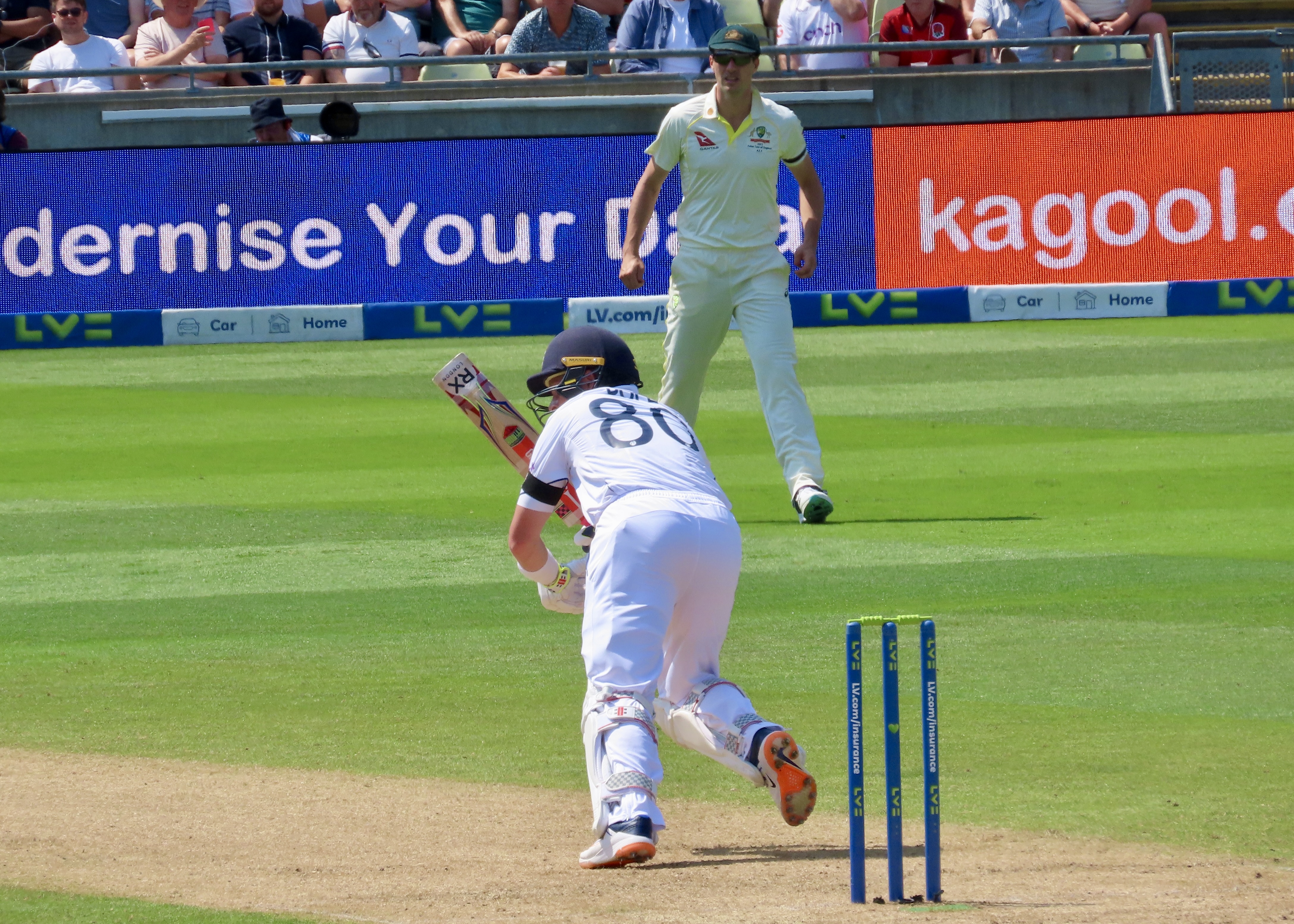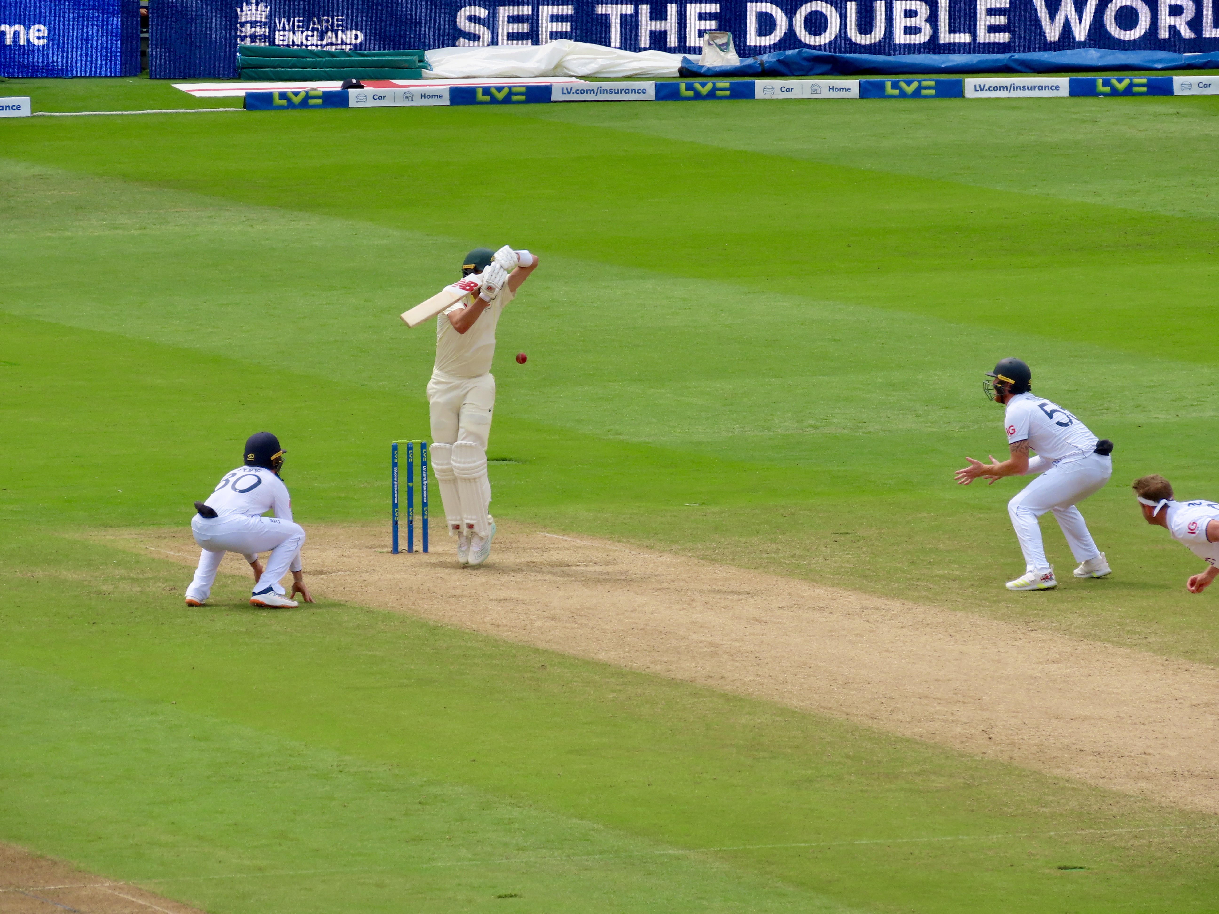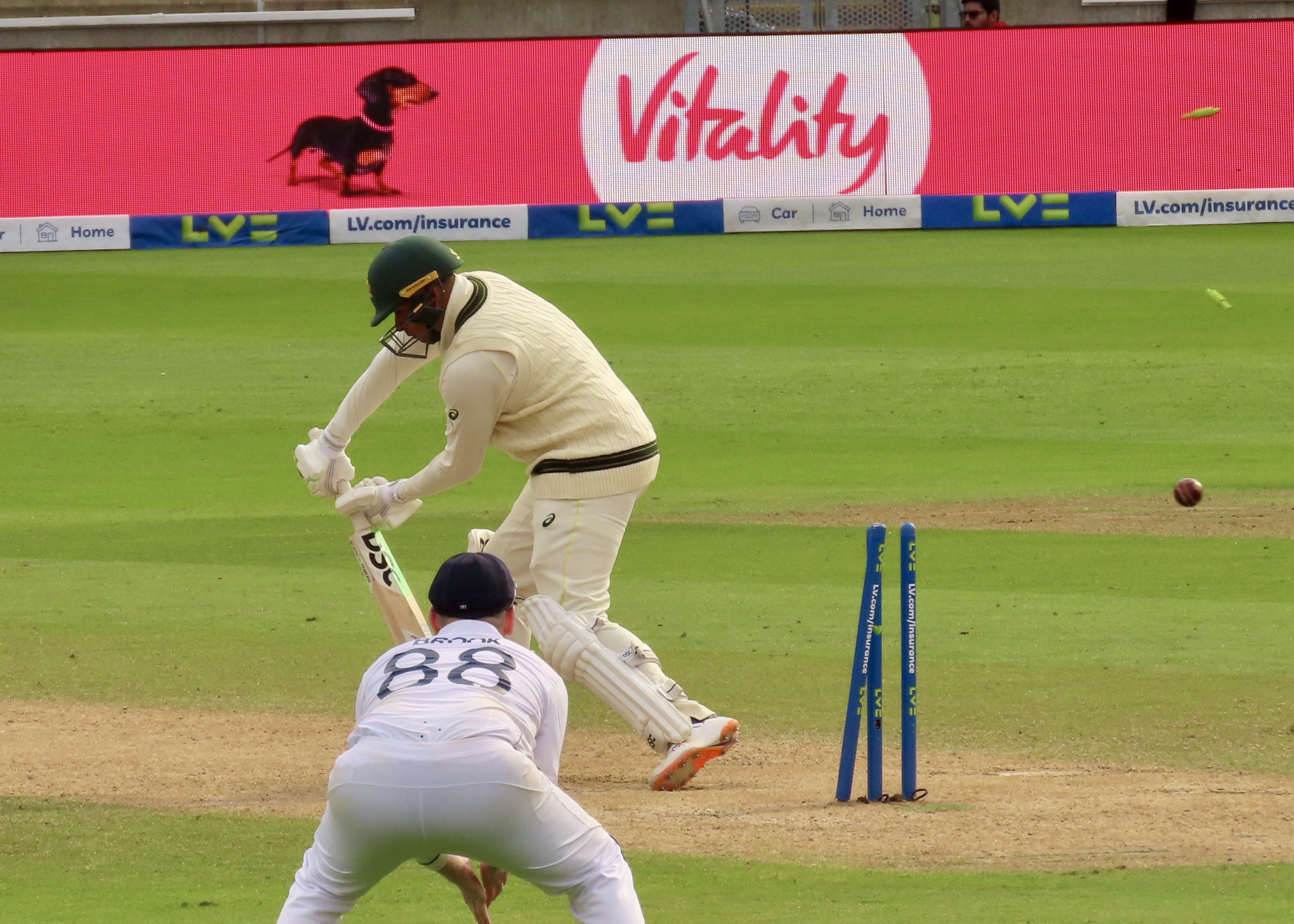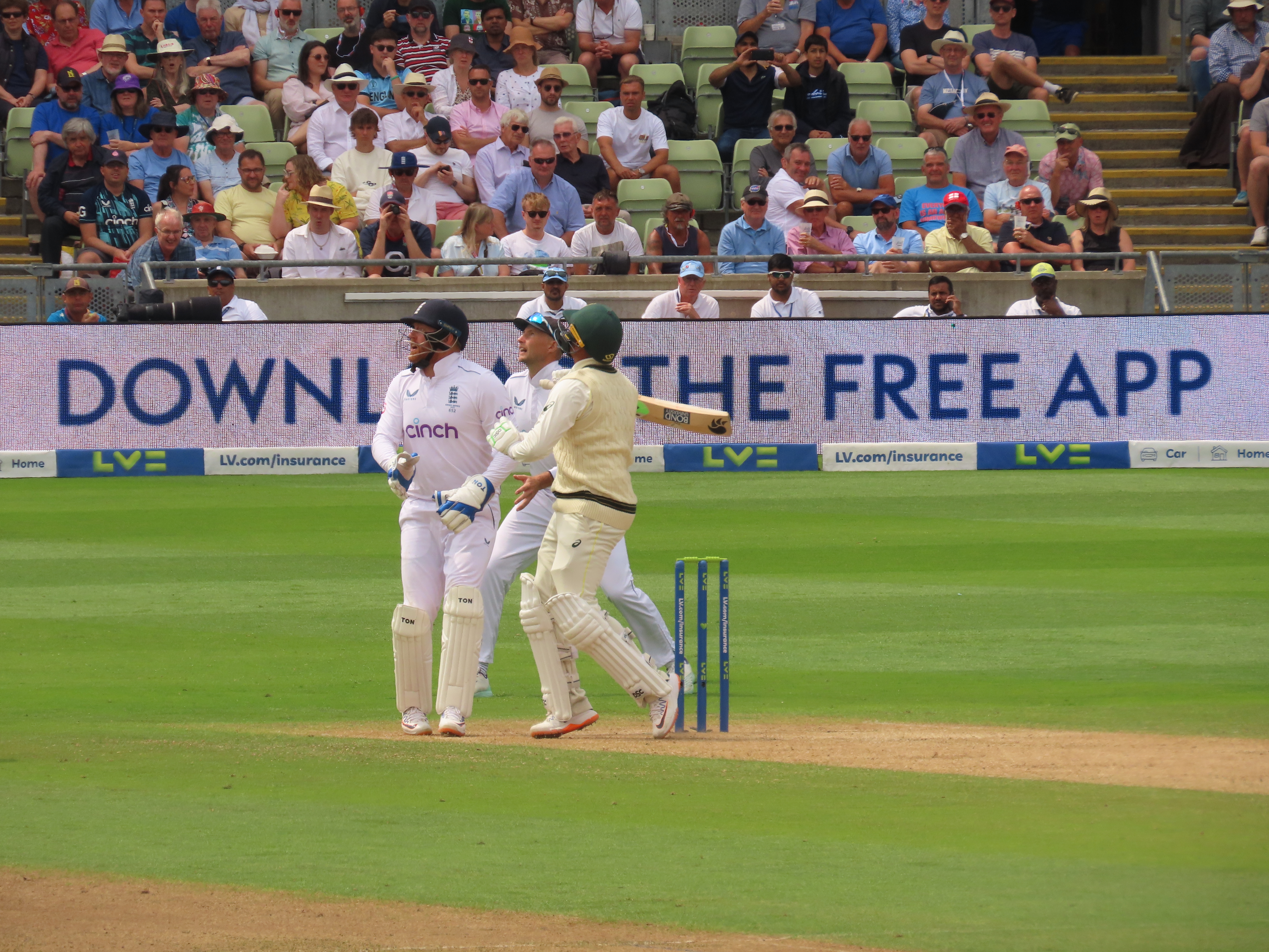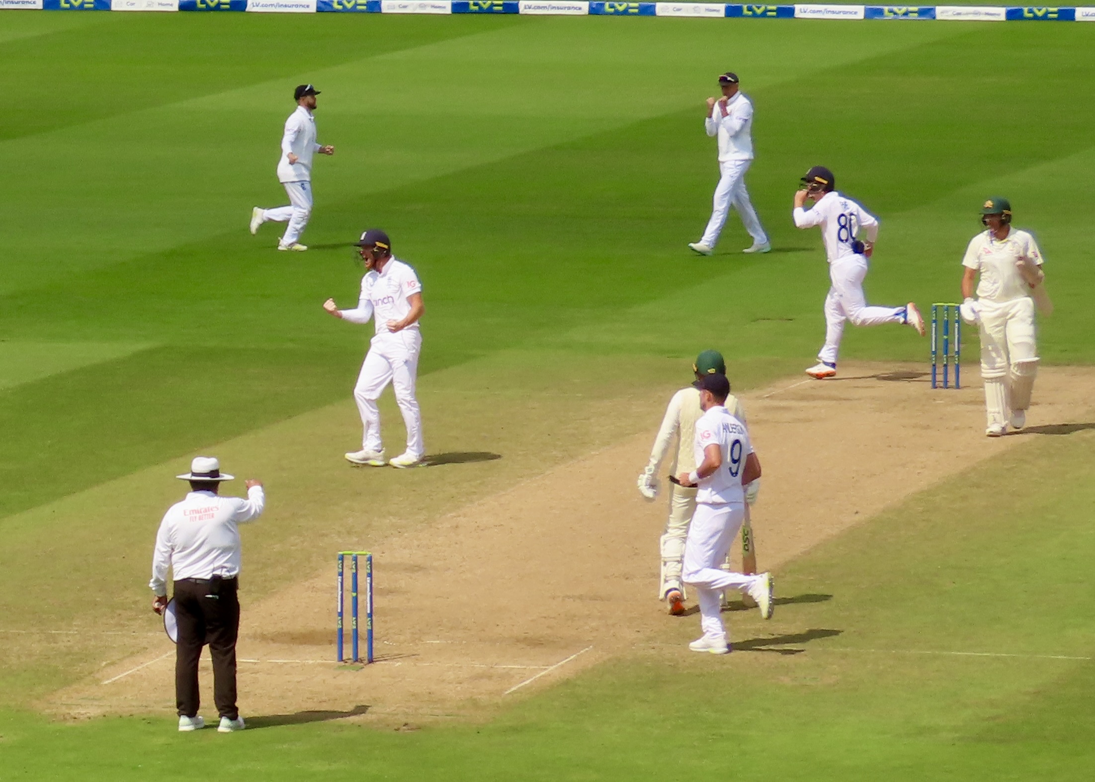 I’d booked myself posh seats for the 4th and 5th Days, and that definitely paid for Day 5 with the weather, for Day 4 it gave me a great view and some pretty good food in nice surroundings. I had a perfect view of a perfect ball from Cummins to despatch Pope for just 14 it also gave me a great view of a Joe Root career first, being stumped! After he seemed to have his eye in, he went down the wicket to Nathan Lyon, there really was only going to be one outcome, gone for 46. Harry Brook went for the same score with a misjudged shot and a great catch from Labuschagne. Stokes batted for nearly 2 hours in this innings scoring 43 from 66 before he was trapped LBW by Cummins. England were bowled out for 273 in 66.2 overs. Both Cummins and Lyon took 4 wickets. England had some time to take wickets and they did, 3 of them: Warner will possibly be relieved that he fell to Robinson, both Smith and Labuschagne did however fall to Broad. Australia’s 2 best batters, going into this game, contributed just 35 runs across 2 innings. DAY 4 WAS SHARED BY CUMMINS AND LYON WITH BROAD TAKING A SHARE TOO!