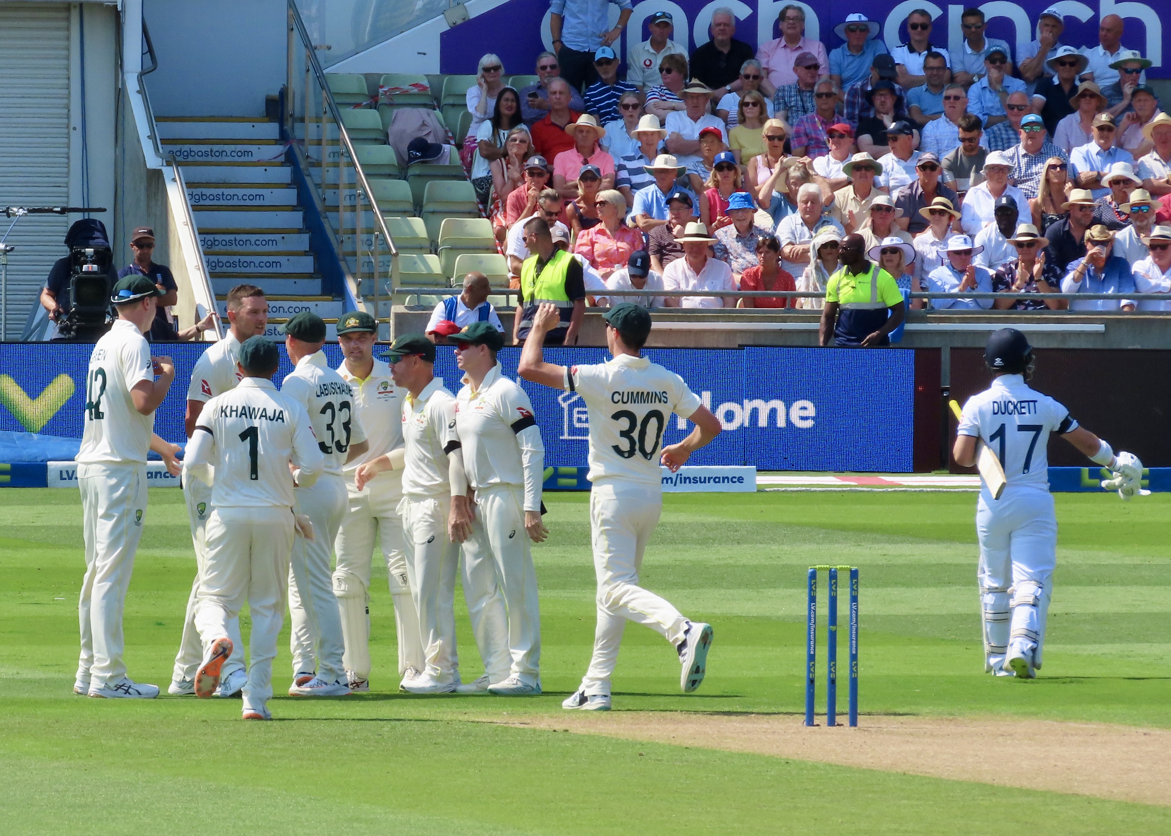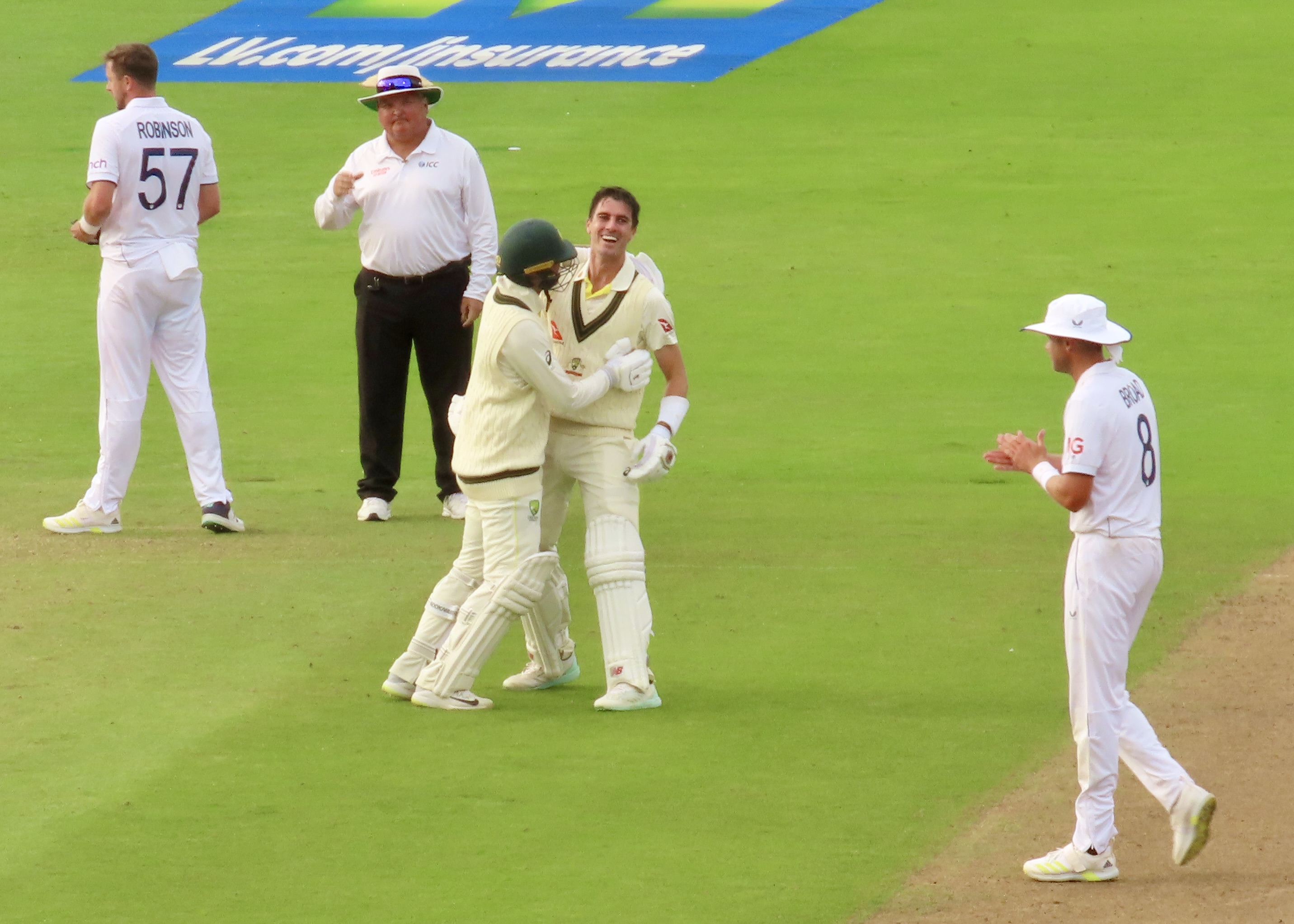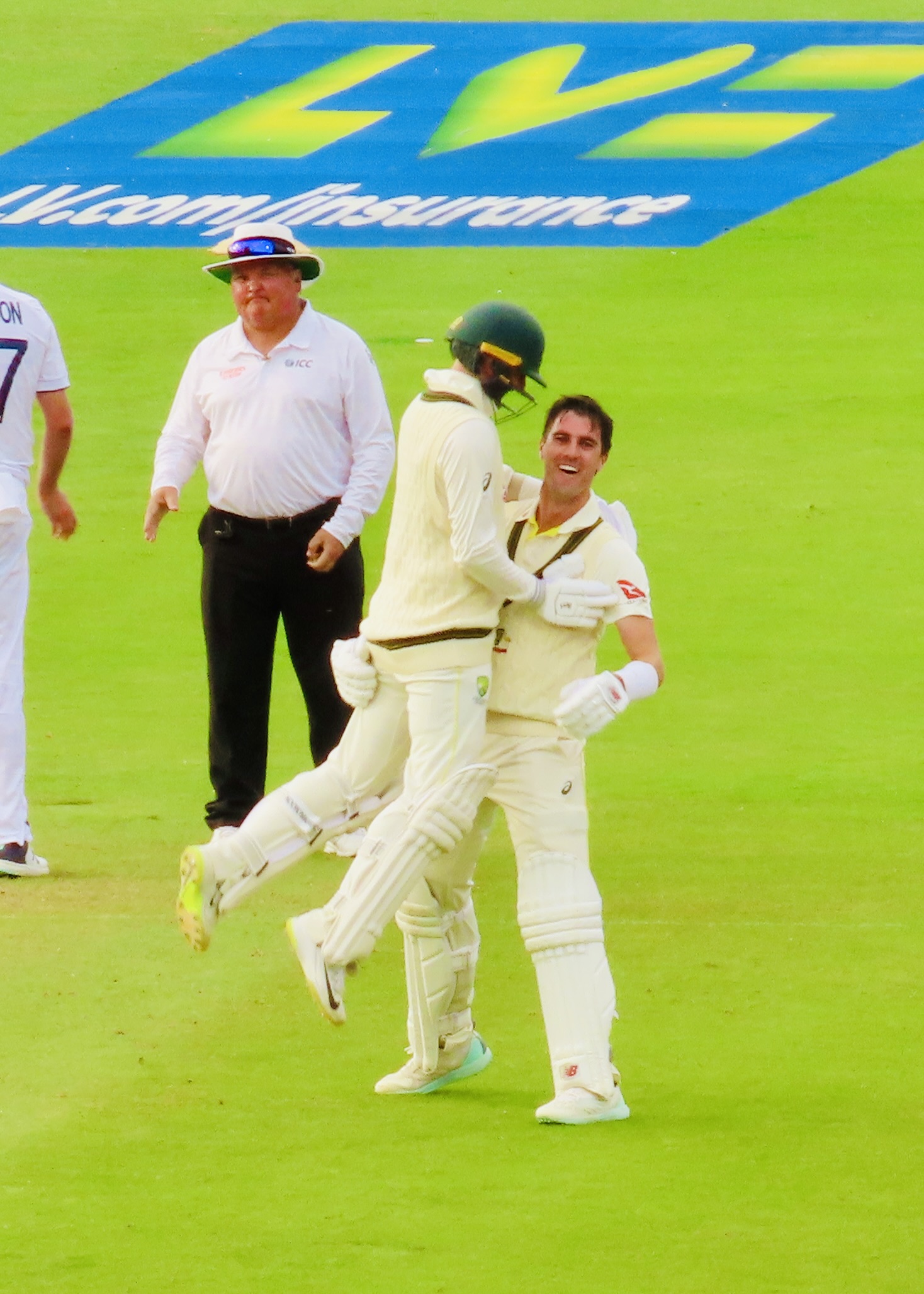 Day 5 started at 2:15 after another great effort by the Edgbaston ground staff; Australia needed 174 runs and England 7 wickets. Could England take 20 wickets in the match? Could Australia score enough runs in the match without 2 key batters contributing? Scott Boland had come in as Night Watchman, he’d been out for a 5 ball Duck in the First innings but managed 20 important runs in the second. England had an injured Moeen, who’d bowled 29 overs in the first innings, very much to the detriment of his fingers. He still bowled another 14 in this second innings. Usman Khawaja top scored again with 65 runs from 197 balls, batting for over 5 hours, his was the 7th wicket to fall. With 8 wickets down Australia had Pat Cummins and Nathan Lyon at the crease. Cummins played a true captain’s innings, scoring 44 from 73 balls, batting for over an hour and a half, it was apt that he scored the winning runs from the bowling of Robinson. This was a truly fabulous game of cricket! Here’s to the next 4 being as good! DAY 5 BELONGED TO KHAWAJA AND CUMMINS!