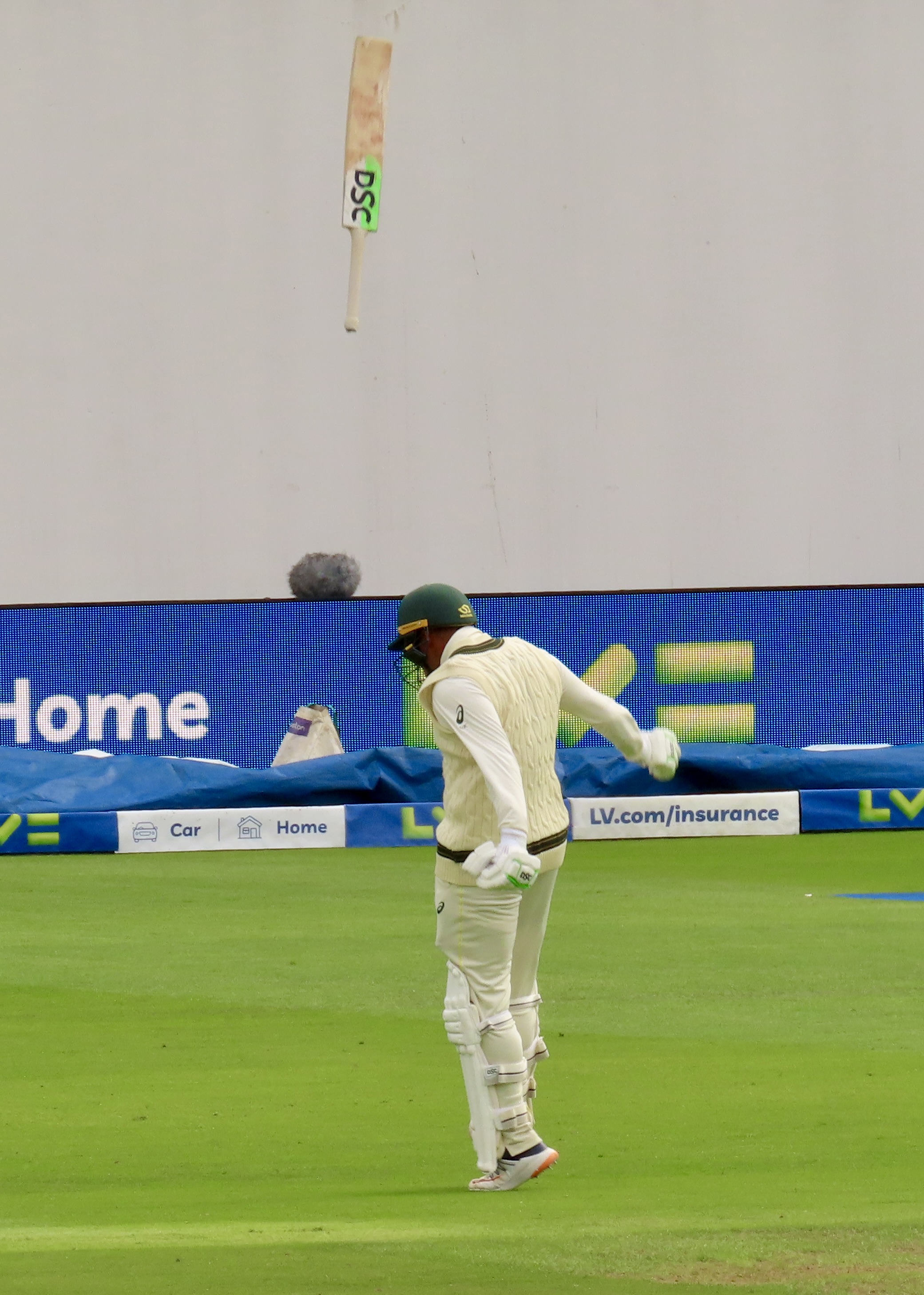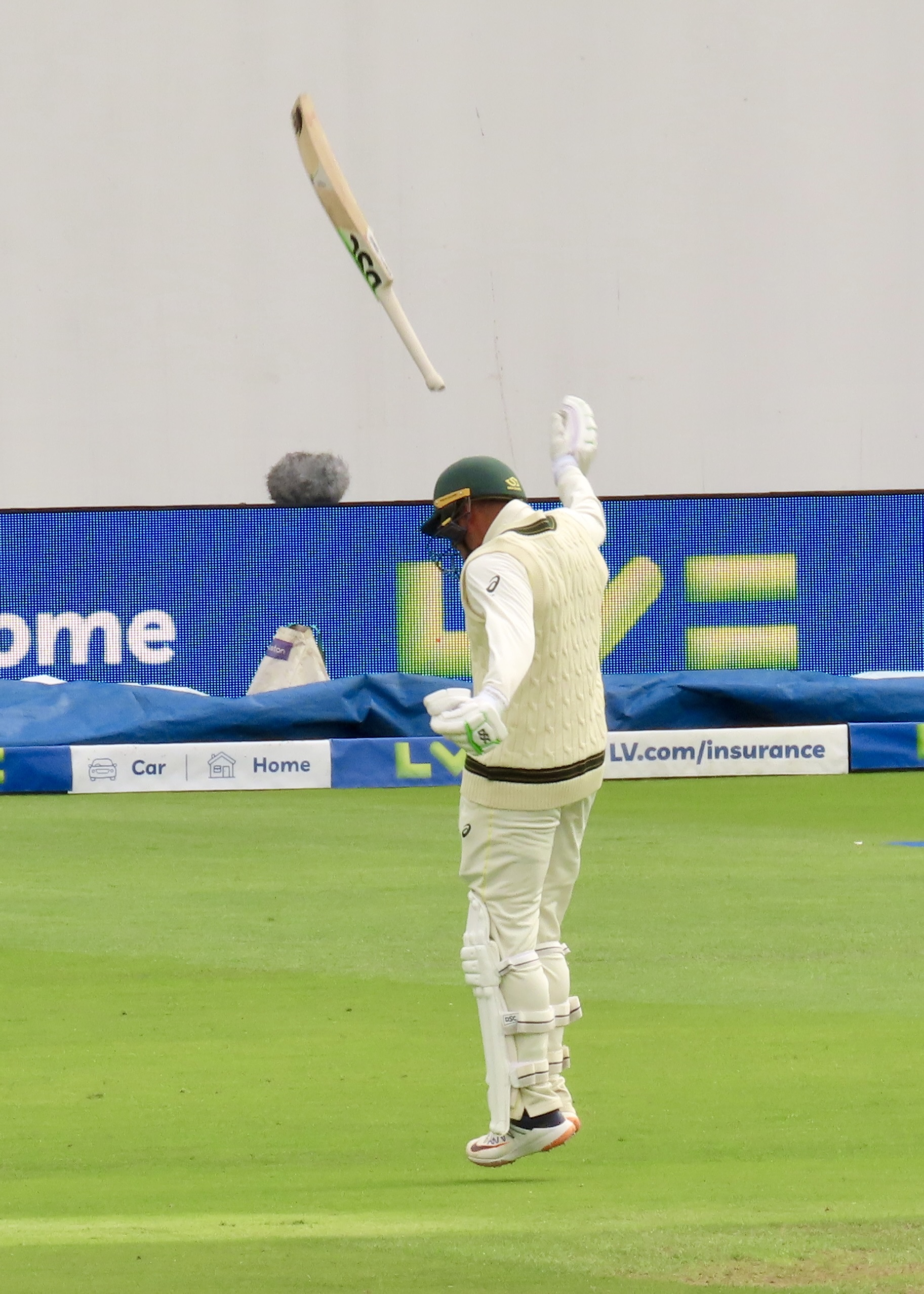 Day 3 was a short one, we get gloriously hot weather in England and we then get thunder storms. Typically, they rocked up on Day 3! Not before Khawaja had made it to those 141 runs, he was bowled by Ollie Robinson who now famously, annoyingly shouted some unpleasantaries as the stumps flew. Usman Khawaja seems to be a pleasant, humble man and had played a fabulous innings, I found Robinson’s reaction unfortunate. Carey had been dropped by Bairstow and went on to score 66 from 99 balls. Captain Pat Cummins scored 38 from 62 balls as Australia were bowled out for 386 just 7 short of England’s first innings total. England were not very many for no wicket when the rain fell; 29.5 overs had been bowled. 1 ball short of the 50% refund number. The teams came back for a couple of catastrophic overs, for England that is! Duckett wafted at a ball to be caught by Green, a man with a huge reach! The light was poor for the next, the 10th over, the lights were on and the fielder’s shadows were clear to see, but play continued and Boland bowled a ball that Crawley edged to Carey – England were 27 for 2. Happily for England’s sake the next downpour was a corker and there was no further play. I”M CALLING THIS KHAWAJA’S DAY TOO! (England bowled 15 No Balls in the Australia innings! Poor)