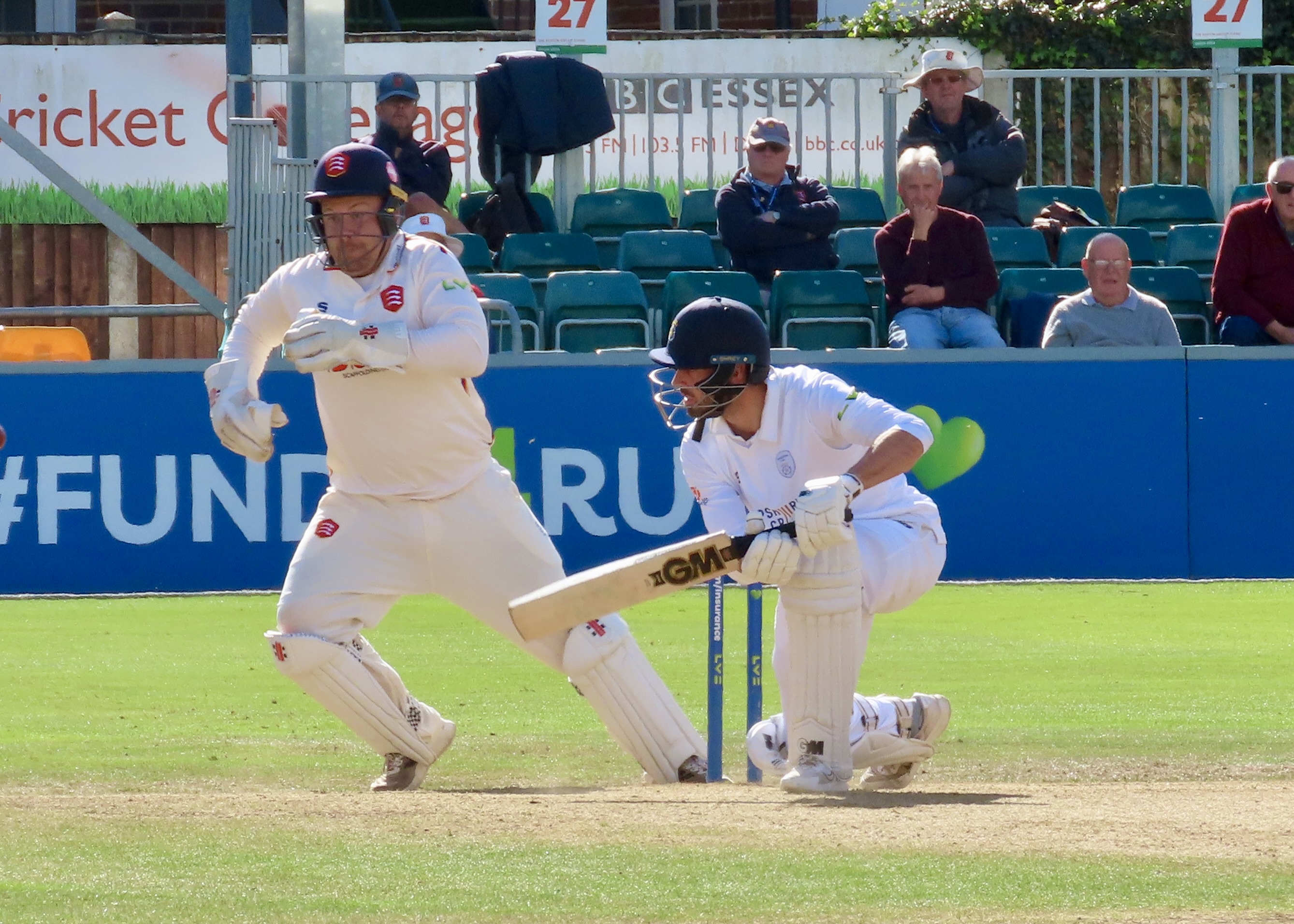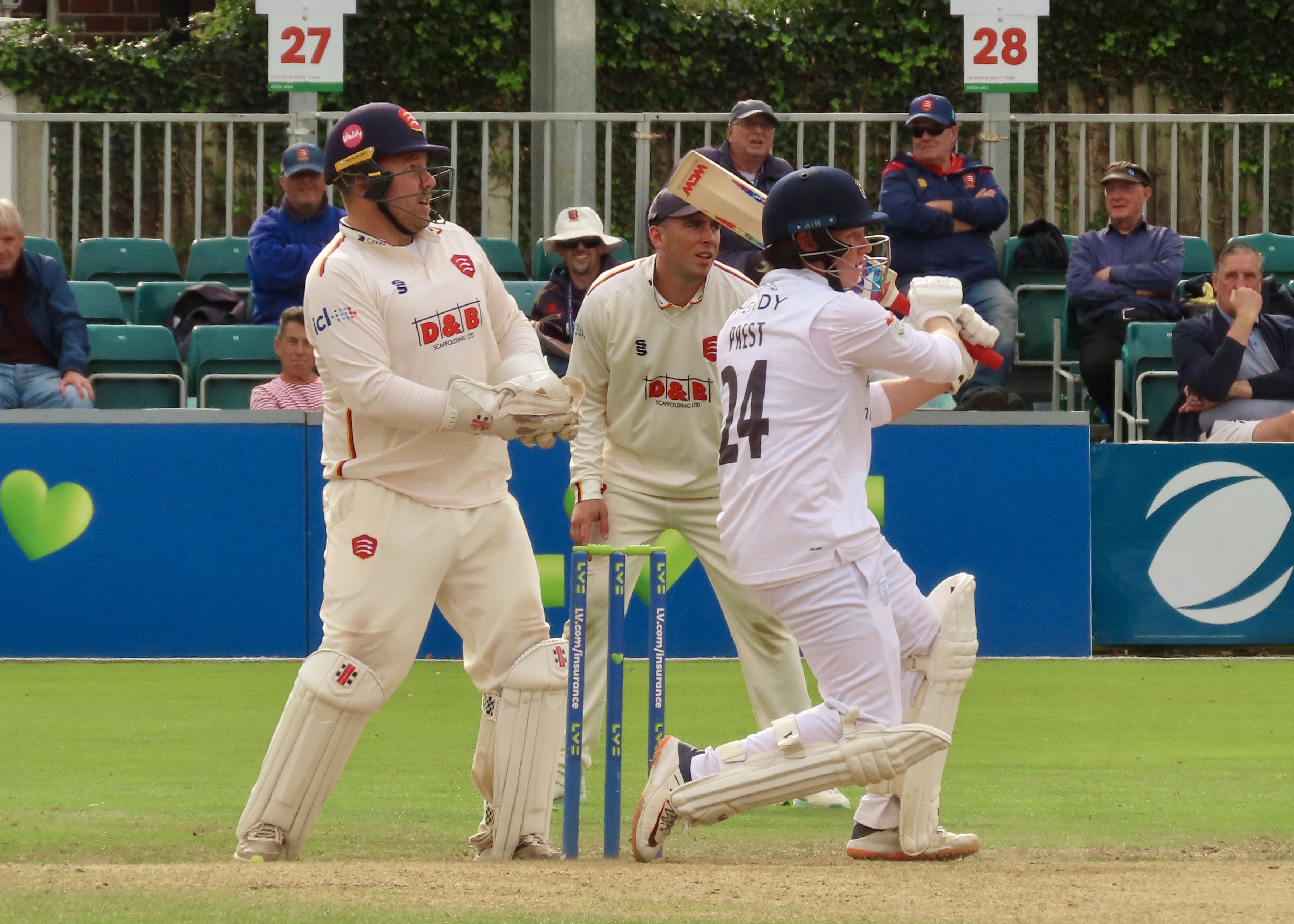 Hants were 10 for no wicket when the rain intervened. I arrived just before lunch on Day 3 to see Essex take 3 quick wickets, an unusually poor shots from James Vince and Liam Dawson saw them fall as the 5th and 6th wickets. Hants were in some trouble at 141 for 5.Keeper Ben Brown and Tom Prost put on 54 for th e 6th wicket and then Prest played a great innings alongside Keith Barker; the pair put on 89 for the 6th. Barker contributed 42 from 62 balls and Prest finished the day on 102* from 126 balls; he batted really well for his first First Class Century. The rain that had put most of the other games om hold came to Chelmsford at around 4:15 and as much as the ground staff tried and the umpires were prepared to wait there was no more play. Hants finished the day on 322 for 8. They only added 12 the next morning, Press was out for 108 from 144 balls.