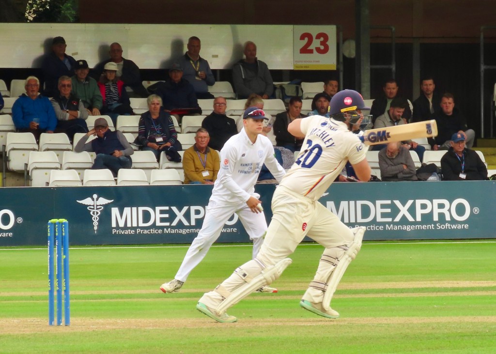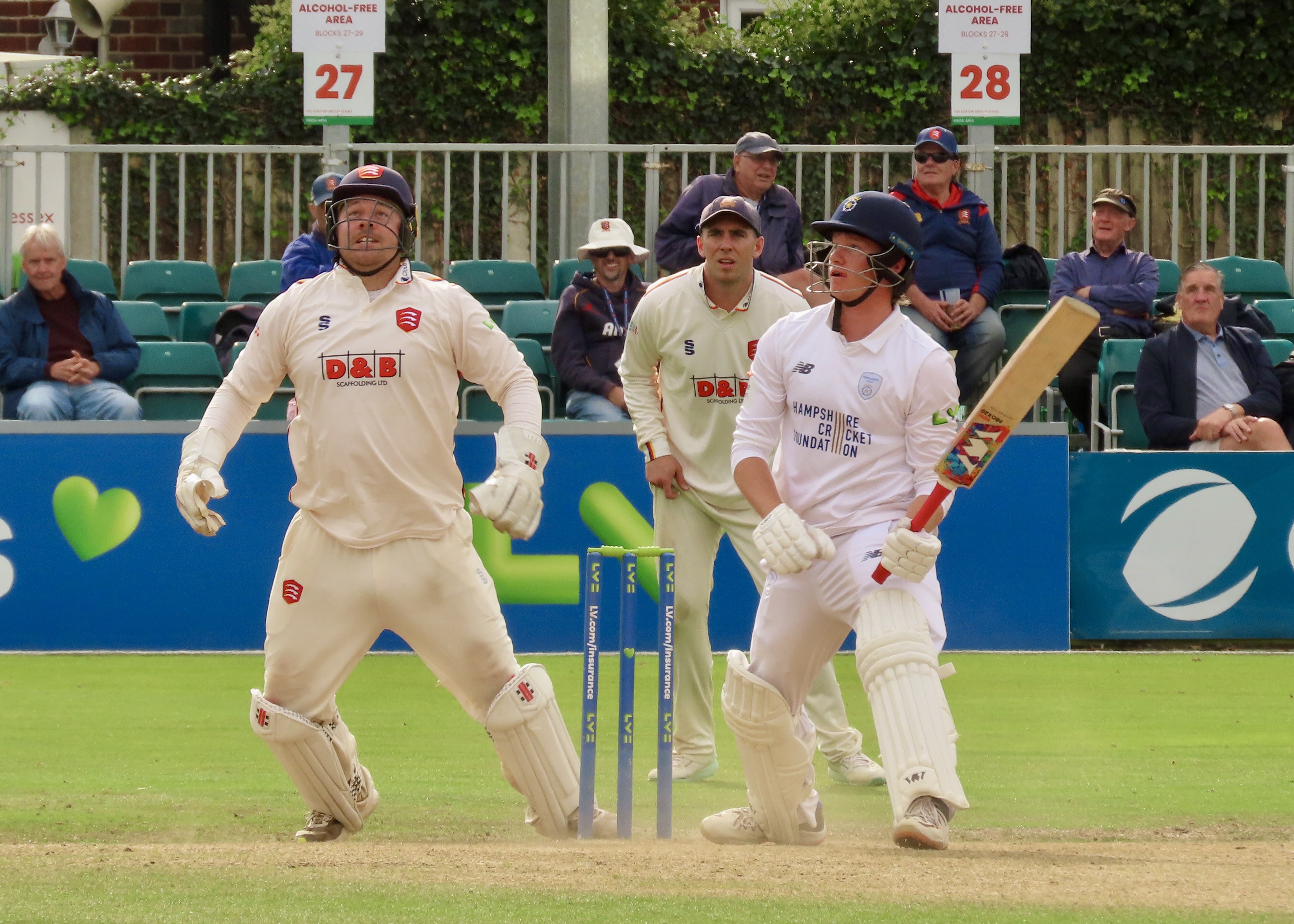 Essex opened their innings with Alastair Cook and Adam Rossington, Rossington was out for a 3 ball Duck Cook faced 38 balls for 68 runs. Tom Westley and Dan Lawrence playing his last innings at Chelmsford for Essex put on 83 for the 43rd wicket. Westley’s 45 from 49 balls took him to the top of the runs scoring board alongside Somerset’s James Rew with 1080 runs. Lawrence scored 53 from 49 balls. The rest of the Essex batters were to great degree blown away! Westley declared on 153 for 8 giving Hants a score of 267 to chase.