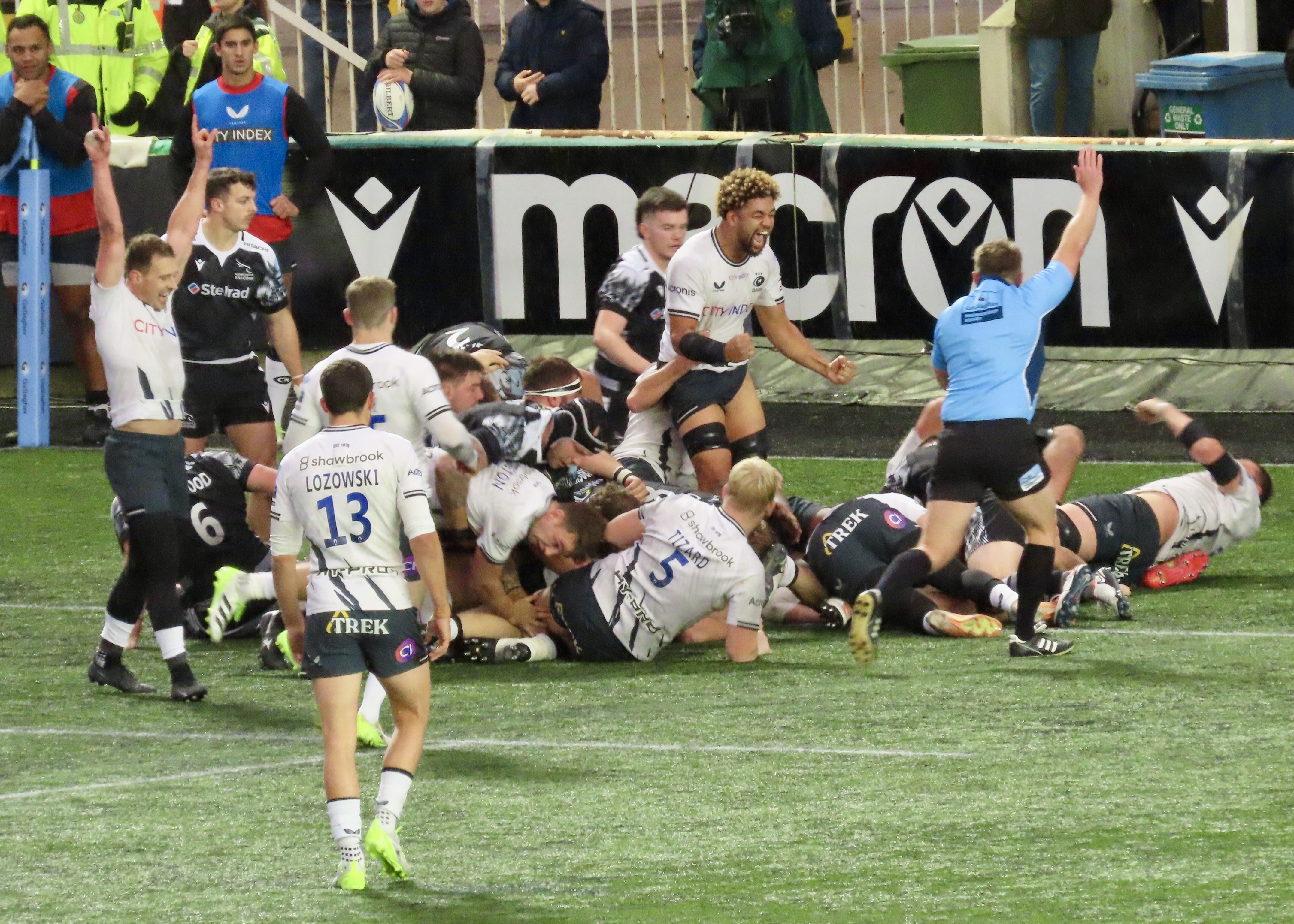 Play moved on and Saracens were awarded a couple of penalties deep in the Falcons half. The maul then stalled again, Lewington was out in some space and received the ball to then run away from Adam Radwan to score.