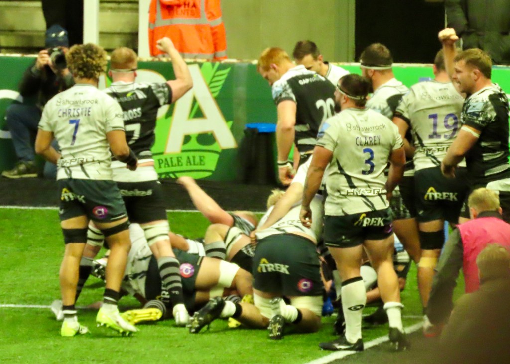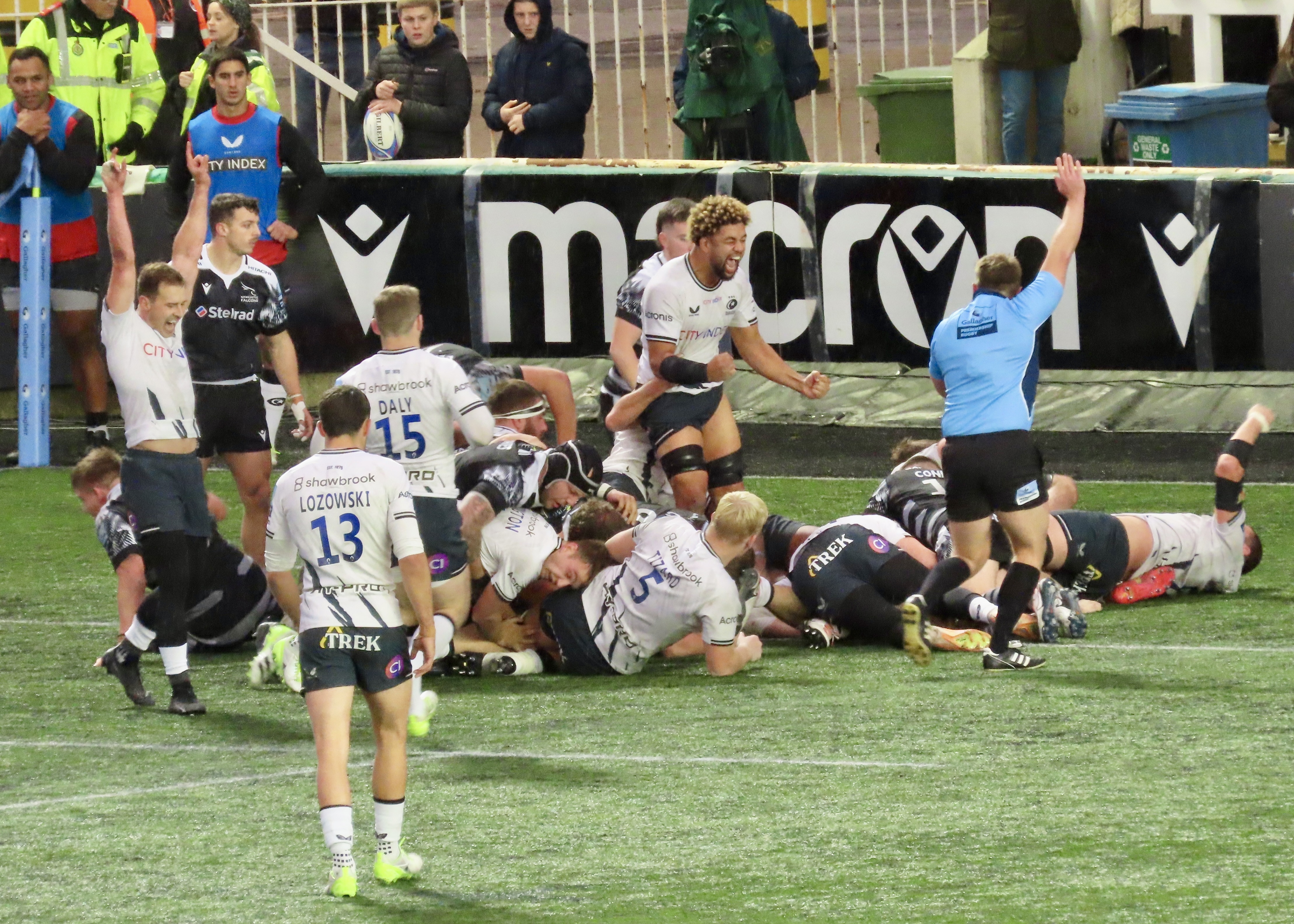 A second cheer for the Falcons fans as they were awarded the penalty first time round. From the resulting scrum. They were awarded a penalty on their first attack, and really needed a score from the next line out. They got a great push on and rolled over the line for Bryan Byrne to score, the conversion fell just short.