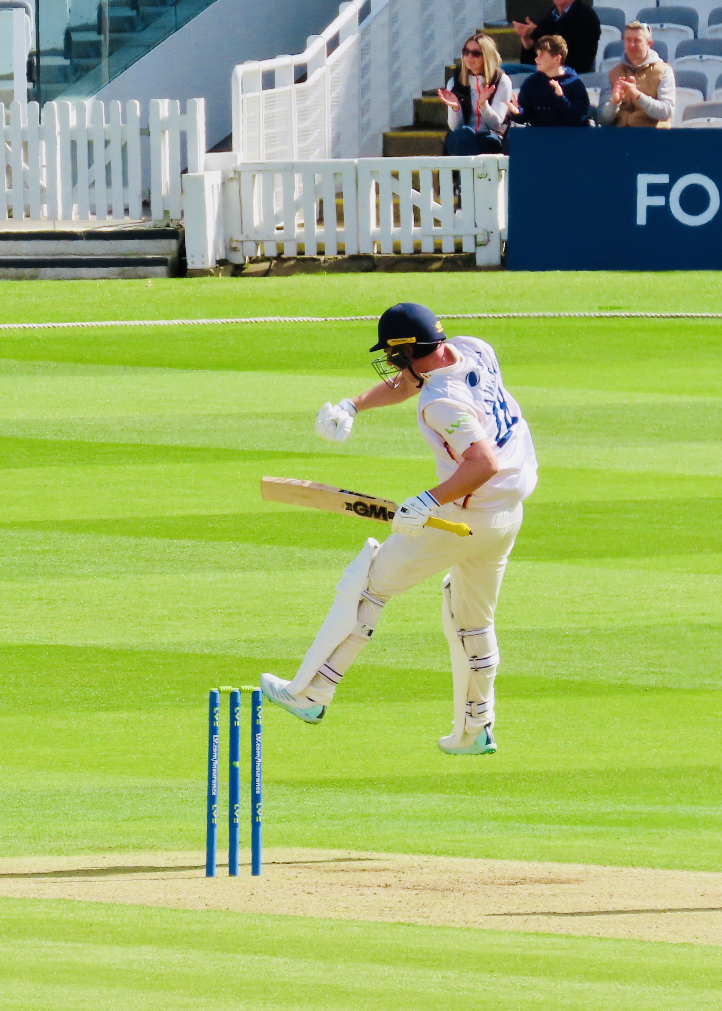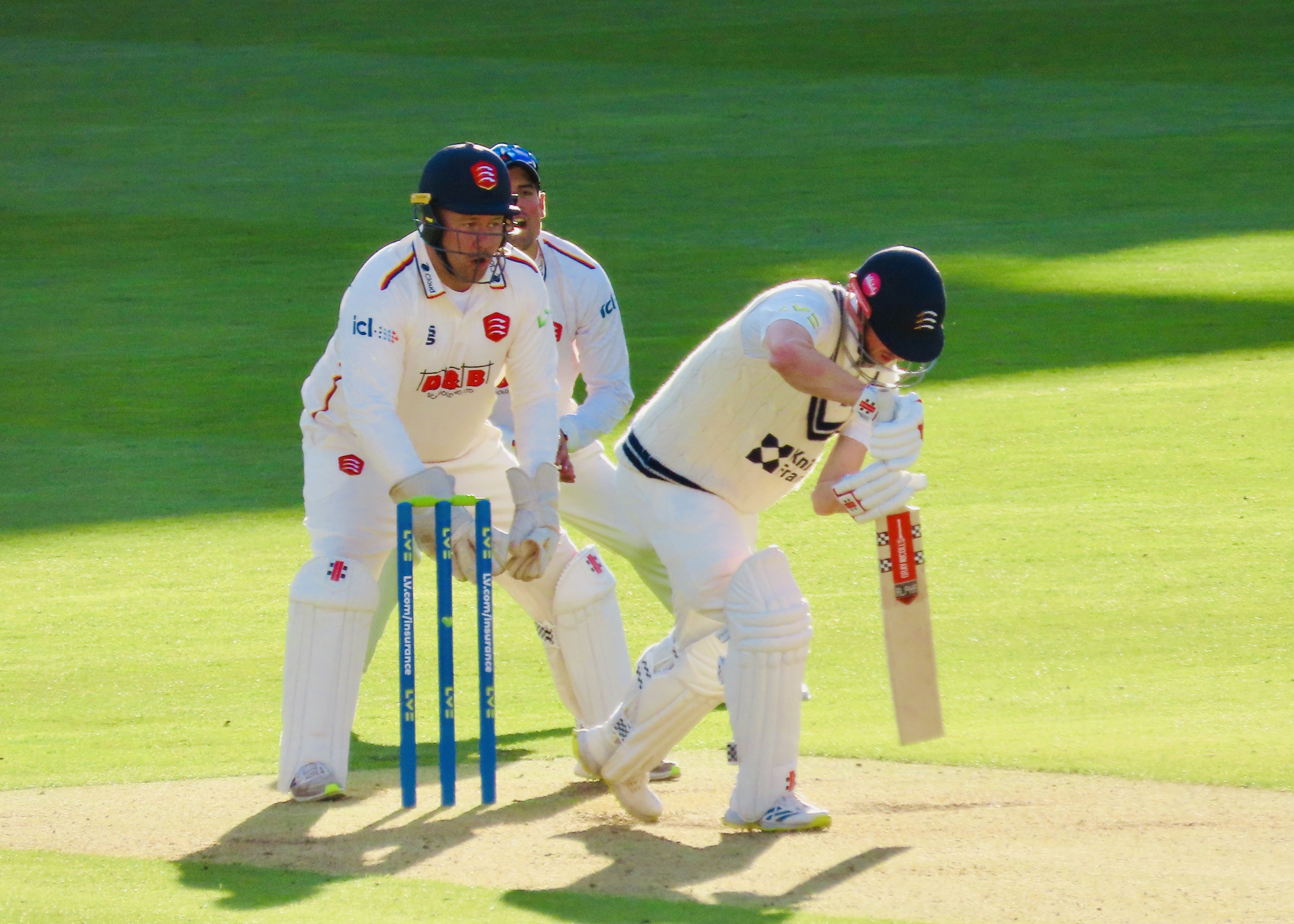 Toby Roland-Jones won the toss and put Essex in to bat, I somehow knew this would be the last year for Sir Alastair Cook, you’ll be able to tell that by the number of photos I took of him over the Summer! But for this match I wasn’t there in time, his was the 1st wicket to fall, he was out for 16 in the 8th over and Nick Browne followed him in the next for 22. Tom Westley, who had a great 2023 with the bat and Dan Lawrence put on 121 for the 3rd wicket, Westley made 48 from 129 balls and Lawrence went on to score 105 from 204 balls. Dan gives great celebration photos and I’m very glad I was there to capture his leap into the air! Matt Critchley scored a useful 55 from 104 balls. At the opposite end of the spectrum I also captured Shane Snater’s Golden Duck – sorry Shane! Essex batted for 93.1 overs and scored 266, just the 1 batting bonus point, in spite of 3 decent innings. Toby Roland-Jones took 7 for 61 in his 27.1 overs.